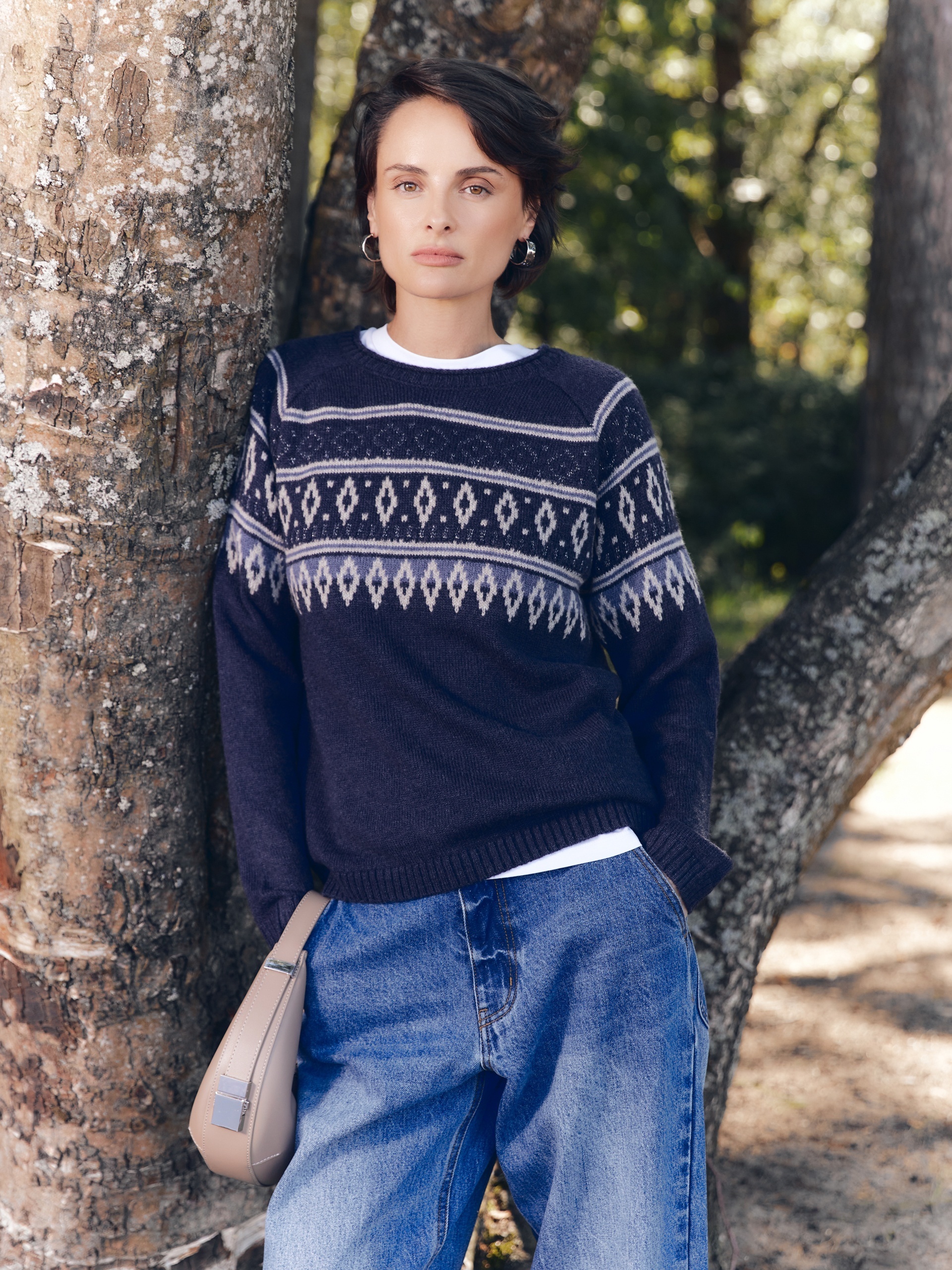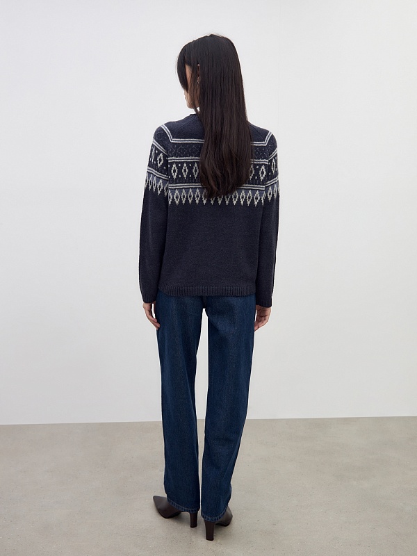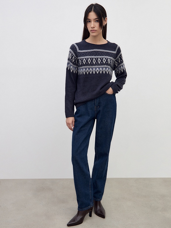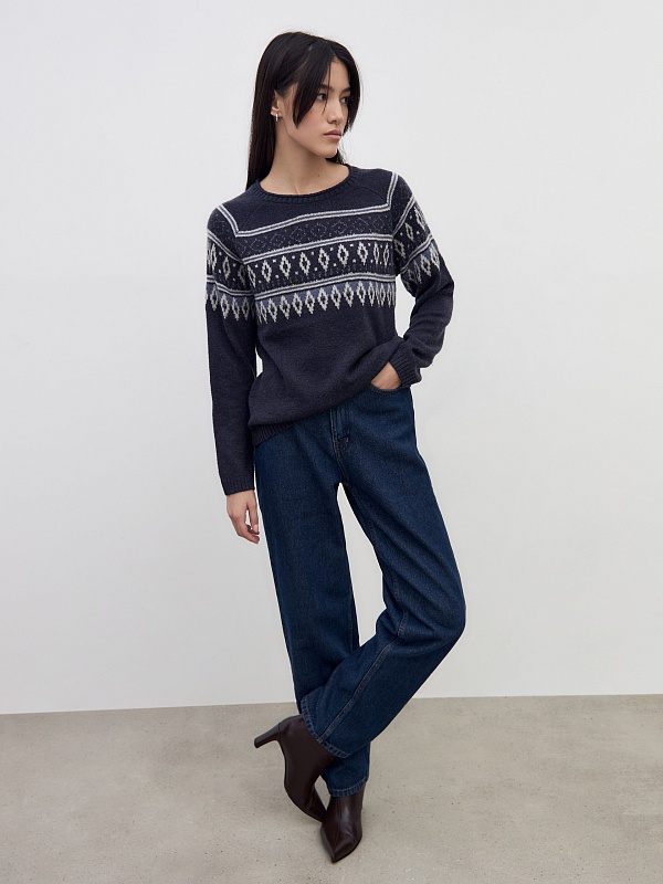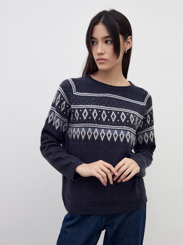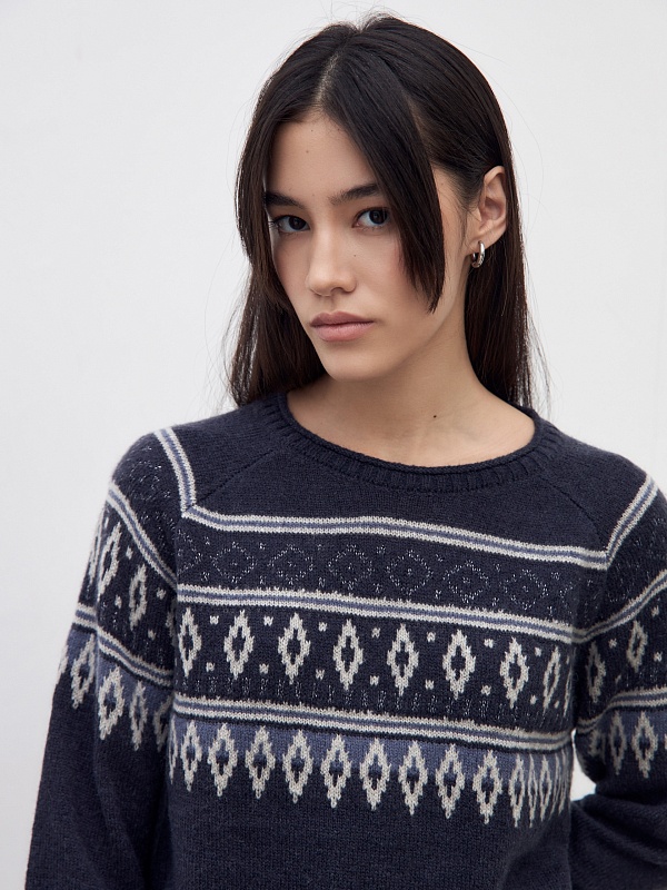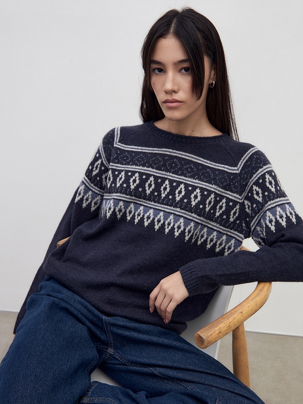 Джемпер прямого силуэта из смесовой пряжи с волокнами овечьей шерсти, рукав реглан. Уникальный штрих джемпера - этно узор. Благодаря уникальной структуре овечьей шерсти она "дышит" - между волокнами располагаются особые воздушные полости, внутри которых циркулирует воздух, он помогает выводить лишнее тепло и влагу.