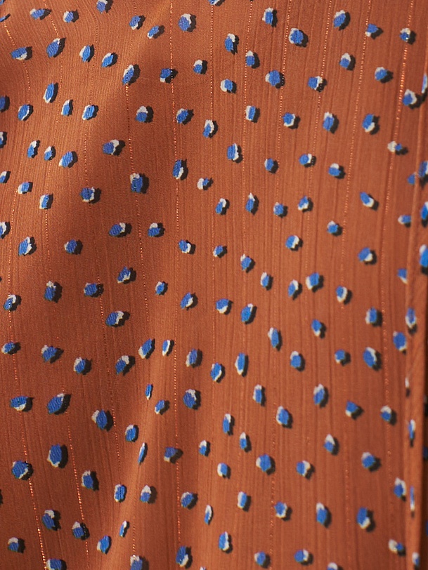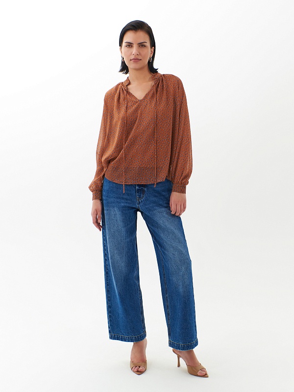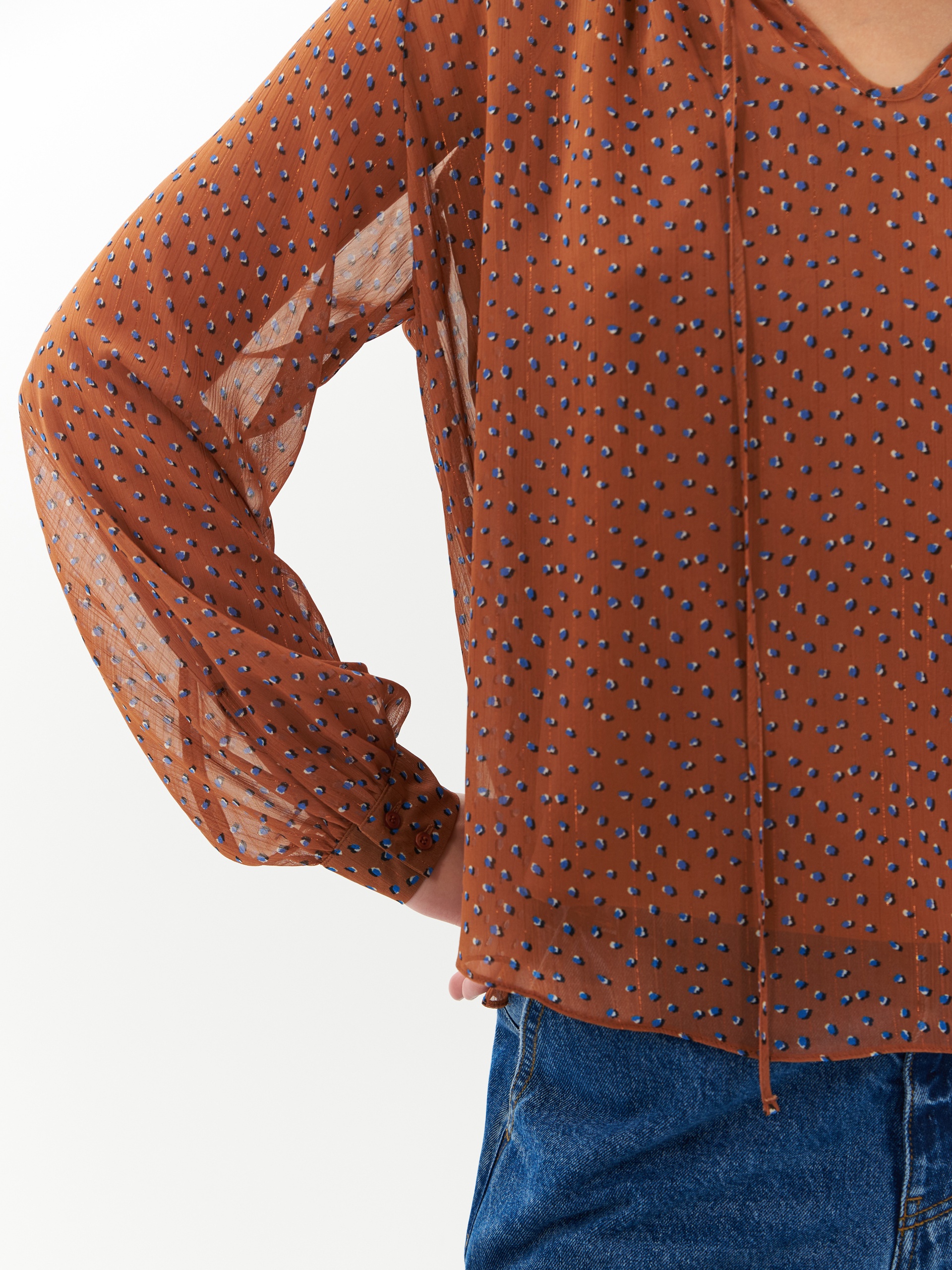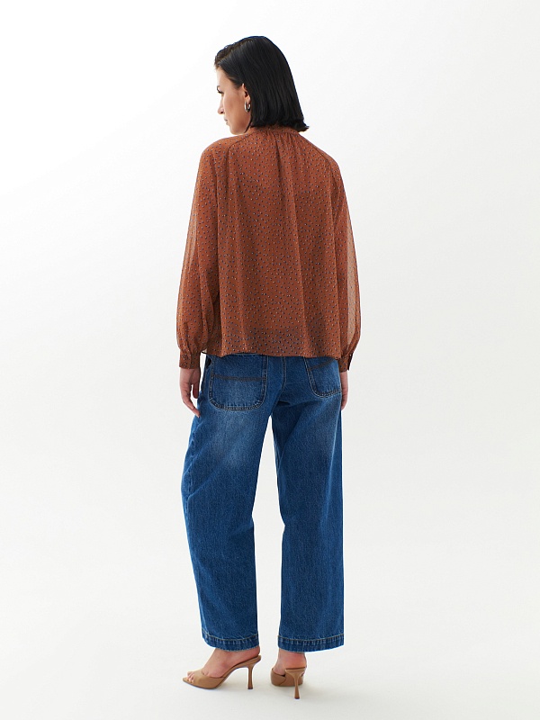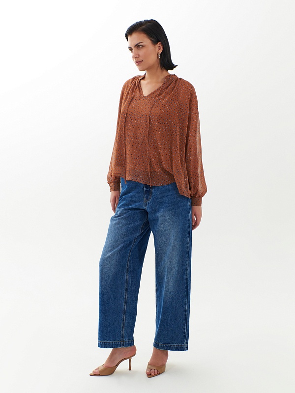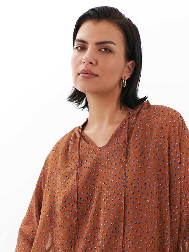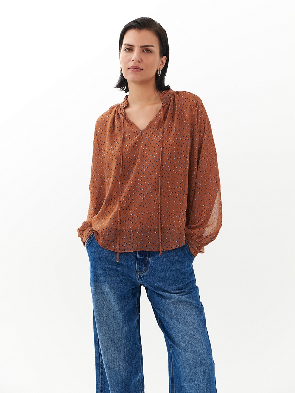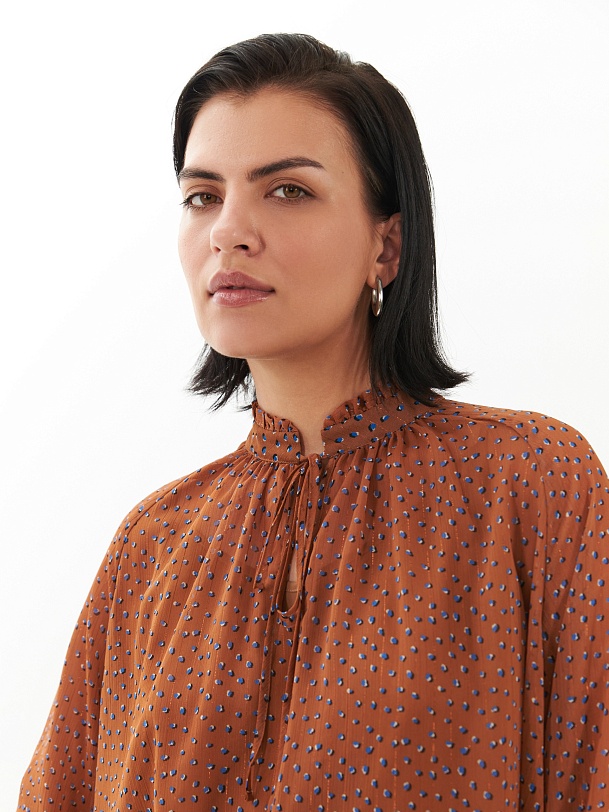 Свободная блуза из кешированного шифона с мелким принтом. Блуза с небольшим воротником стойкой с рюшей и завязками. Рукав реглан. Объемный рукав со сборкой по низу и манжете.