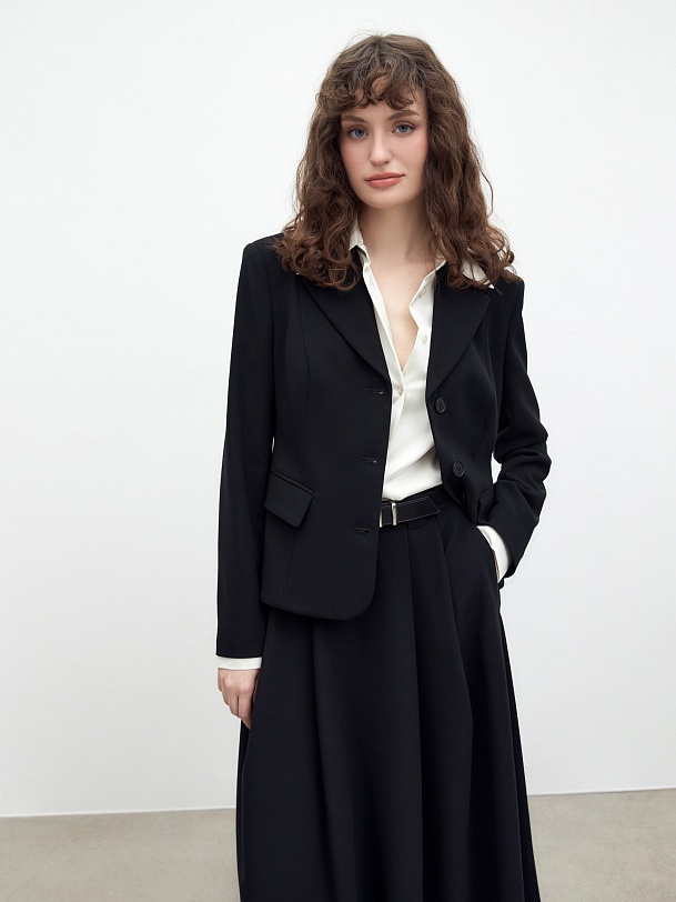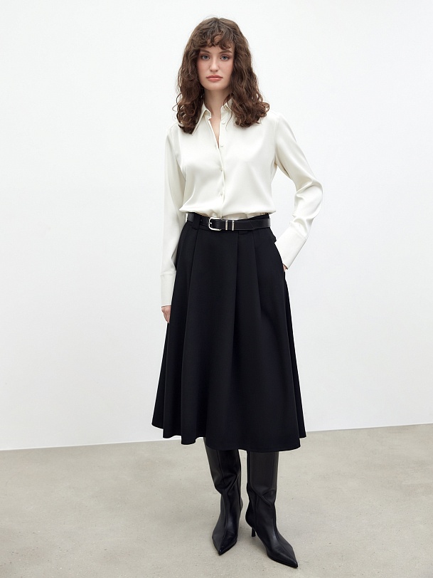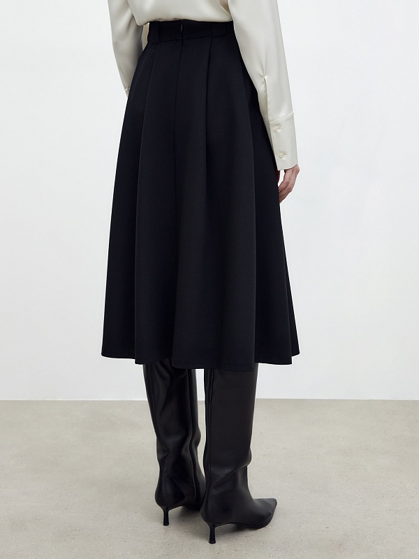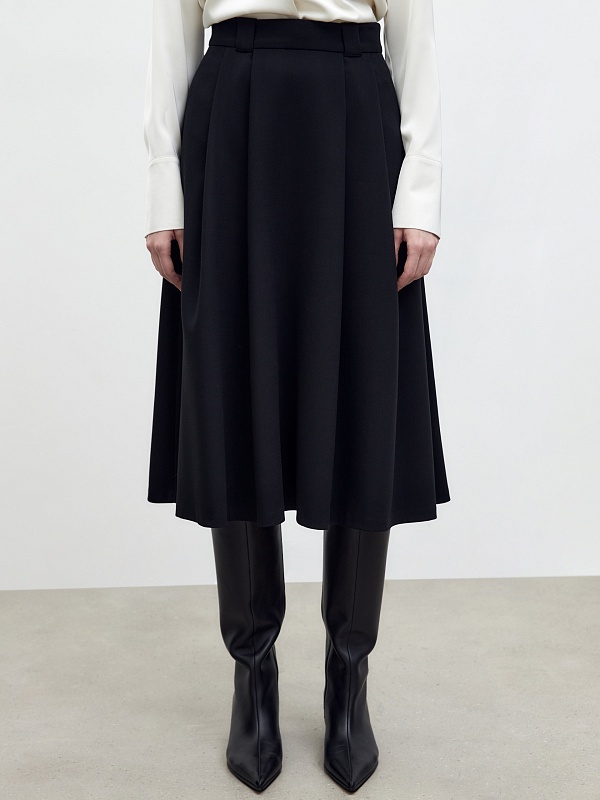 Юбка расклешенная с глубокими складками из костюмной ткани в черном цвете. Юбка на приточном поясе со шлевками. Карманы потайные в боковом шве. На спинке потайная молния. Составит элегантный ансамбль с жакетом из одной ткани.