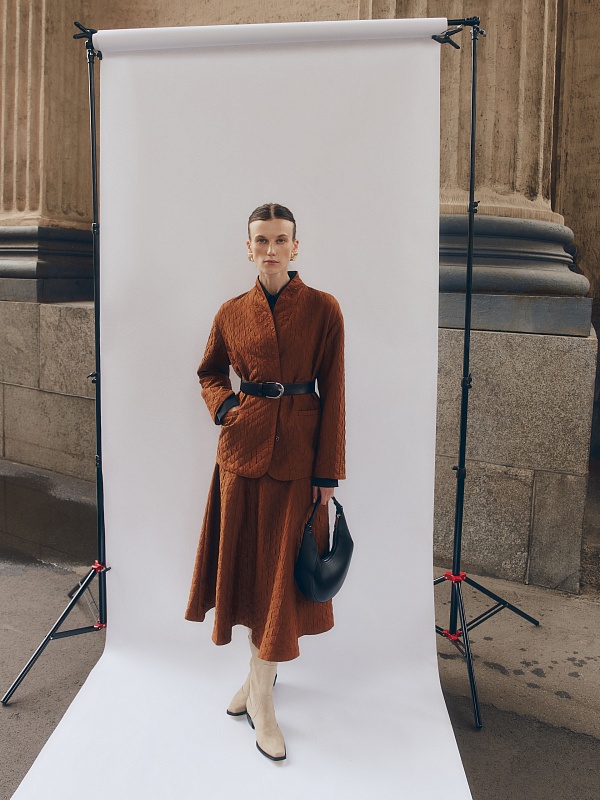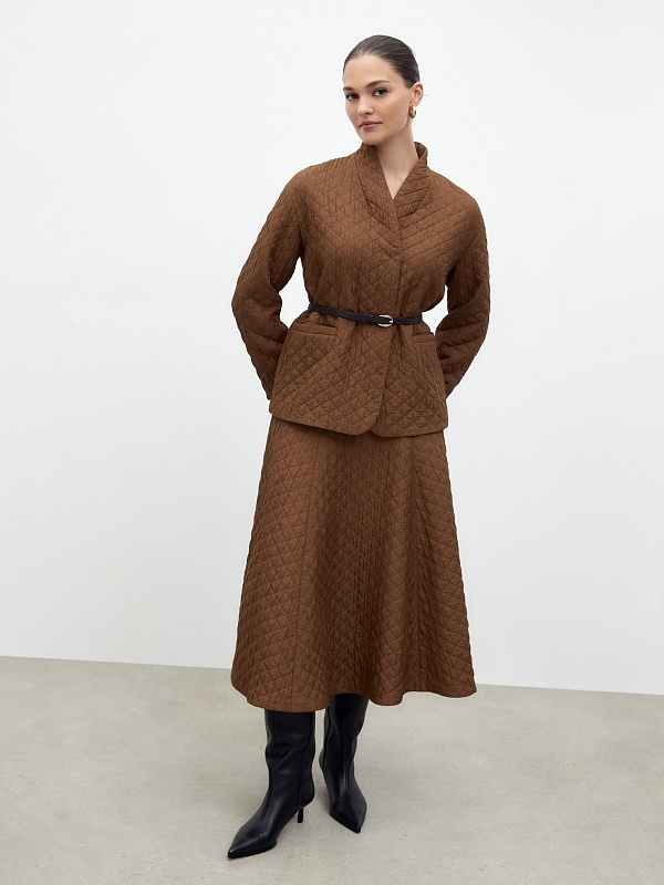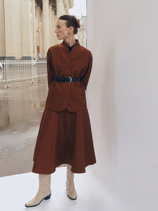Юбка расклешенная миди из стеганной ткани в цвете корица. На высокой талии с обтачкой. Потайная застежка молния на спинке. Составит элегантный комплект с жакетом из одной ткани.