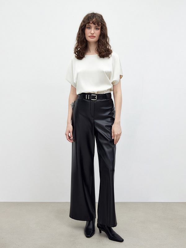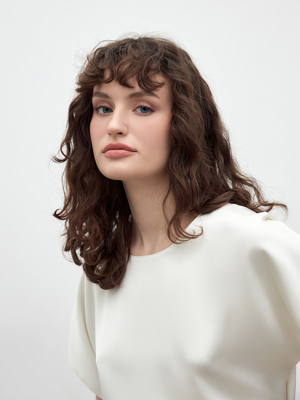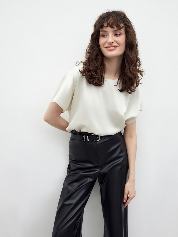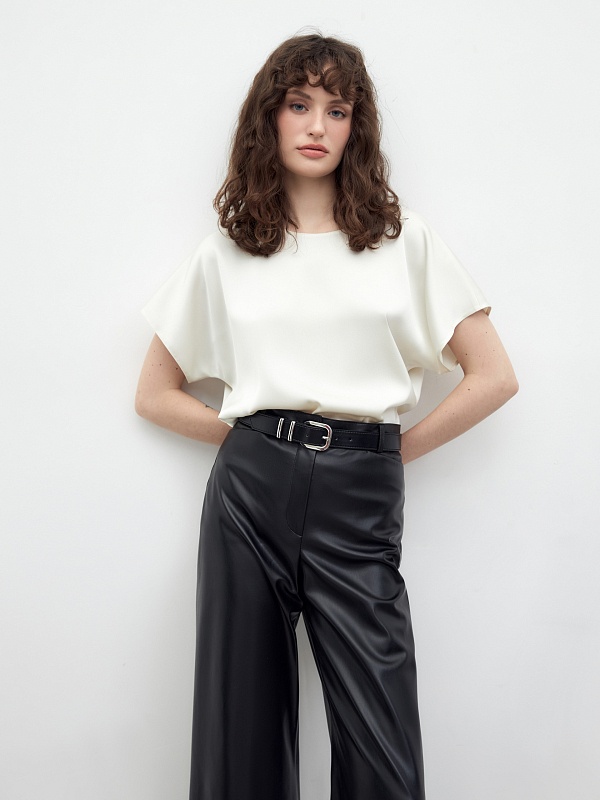 Классическая прямая блуза из блузочной атласной ткани в молочном цвете с горловиной лодочкой.