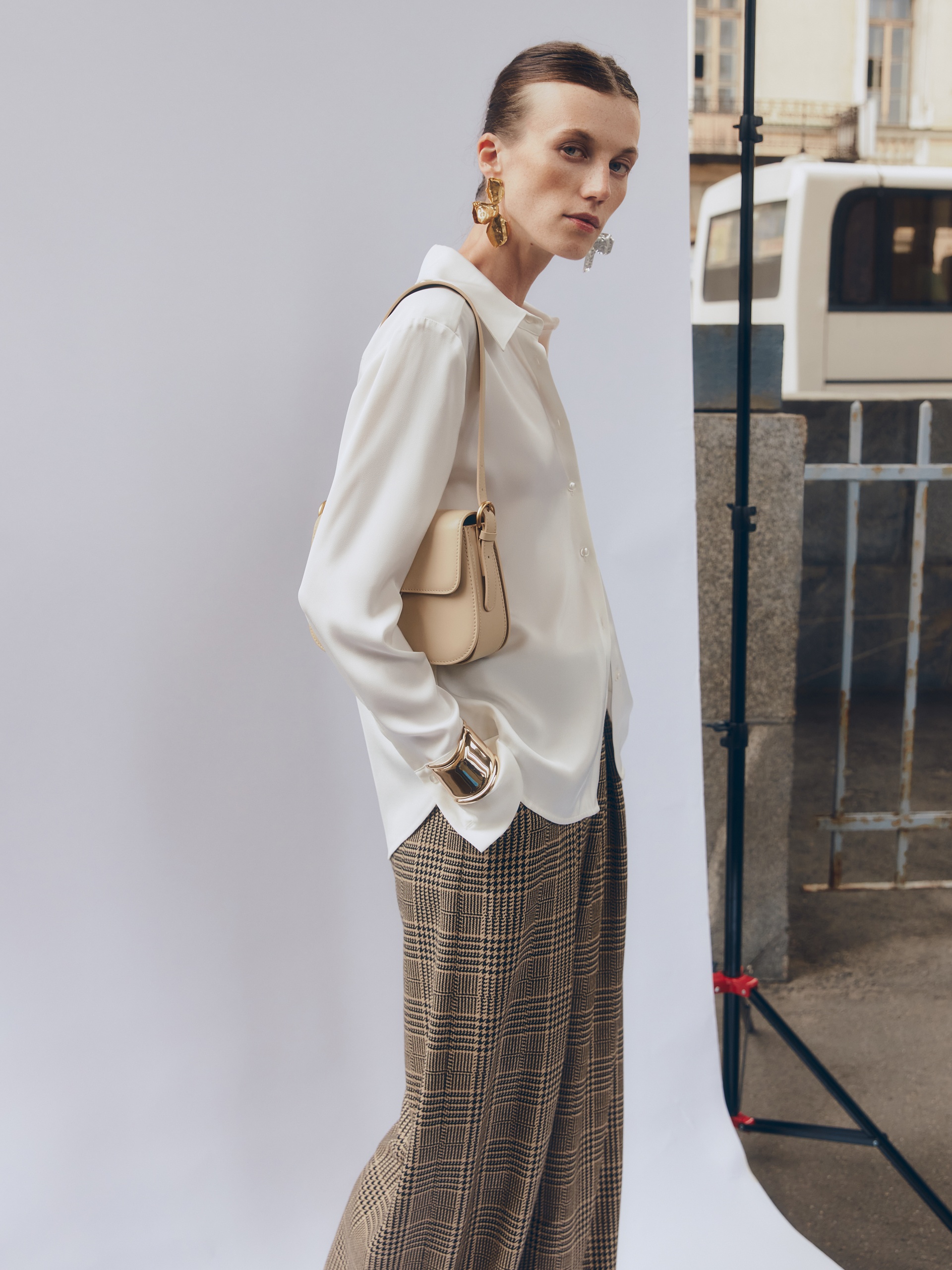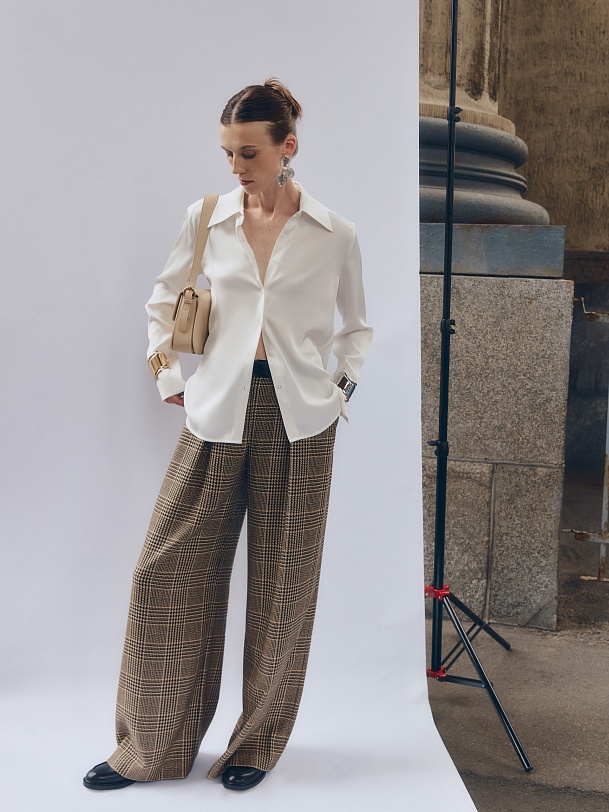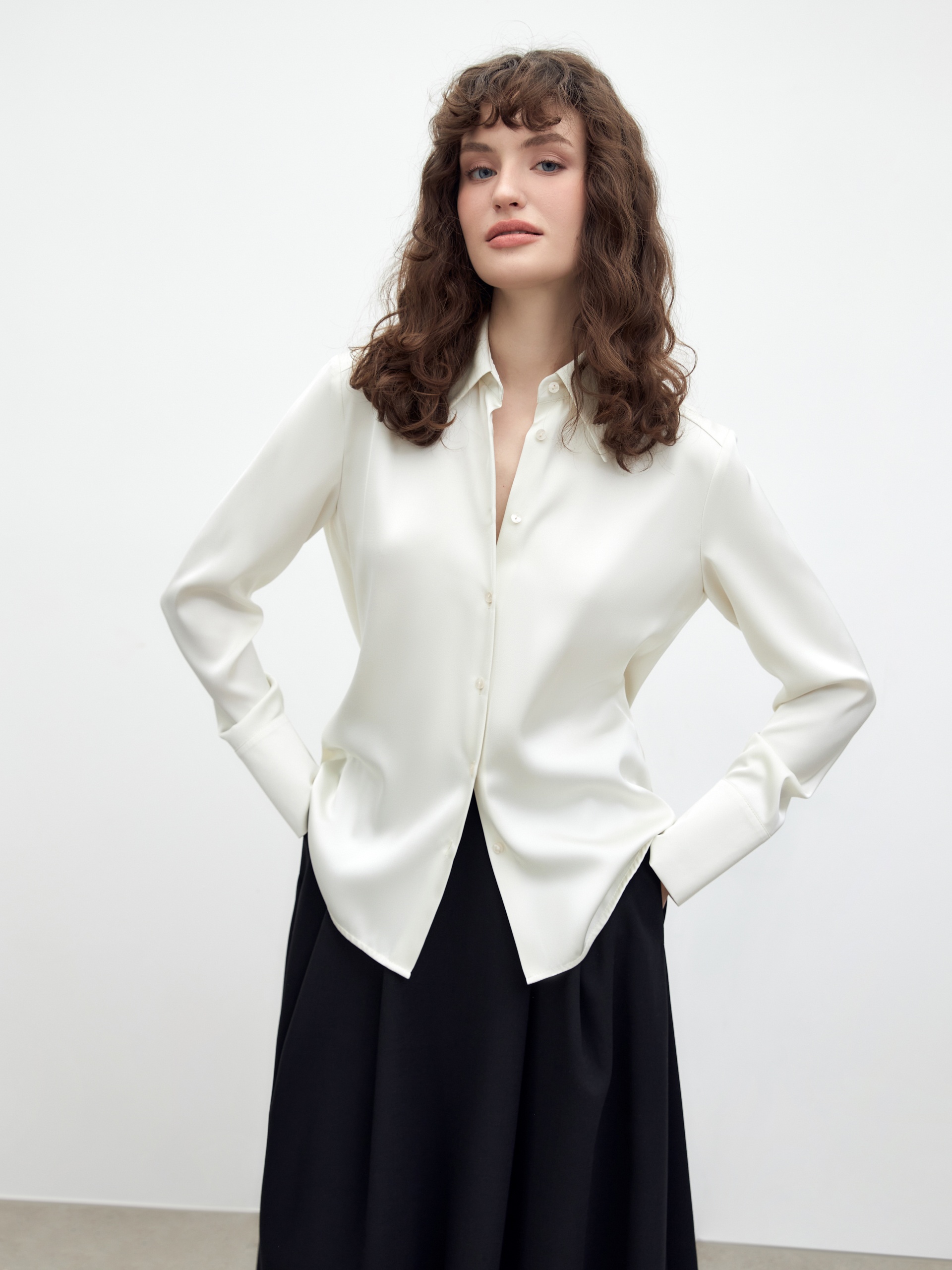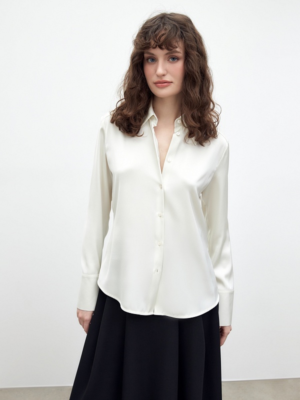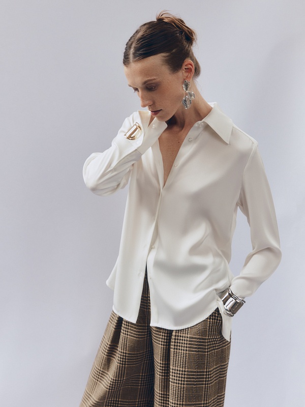 Приталенная блуза из плотной вискозной атласной ткани в молочном цвете с трендовым острым воротником. Блуза с классическим рукавом и широким манжетом. Станет хорошей базой для повседневной жизни так и для вечерних выходов.