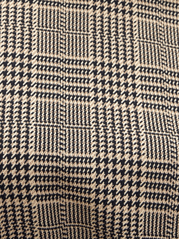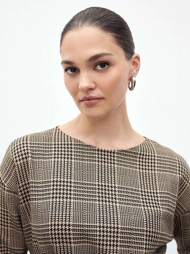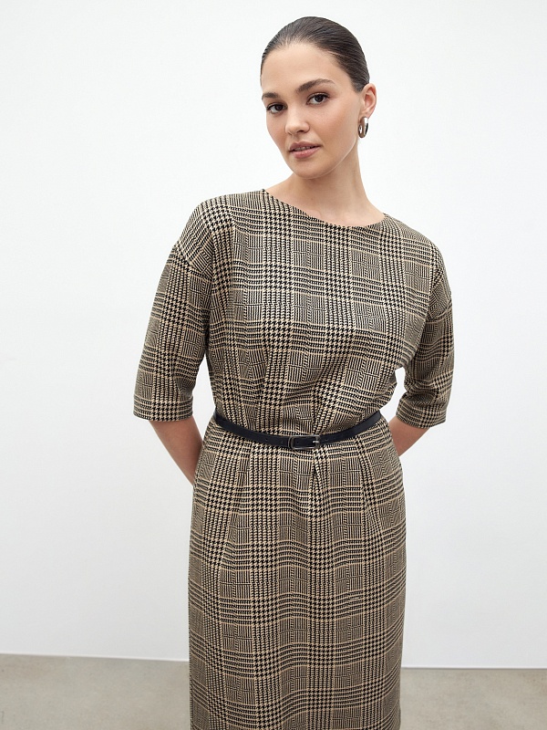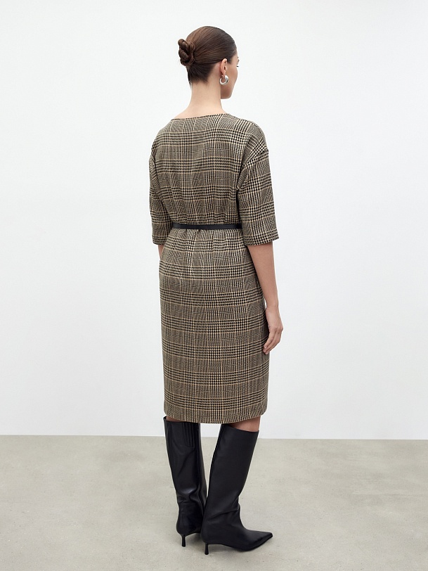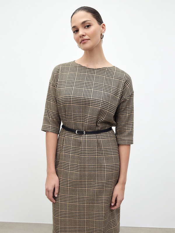 Платье из костюмной ткани в клетку, полуприлегающего силуэта без застежки с горловиной лодочка и спущенным плечом. Пояс фиксирует талию и добавляет мягкие складки. Есть потайные карманы в швах.