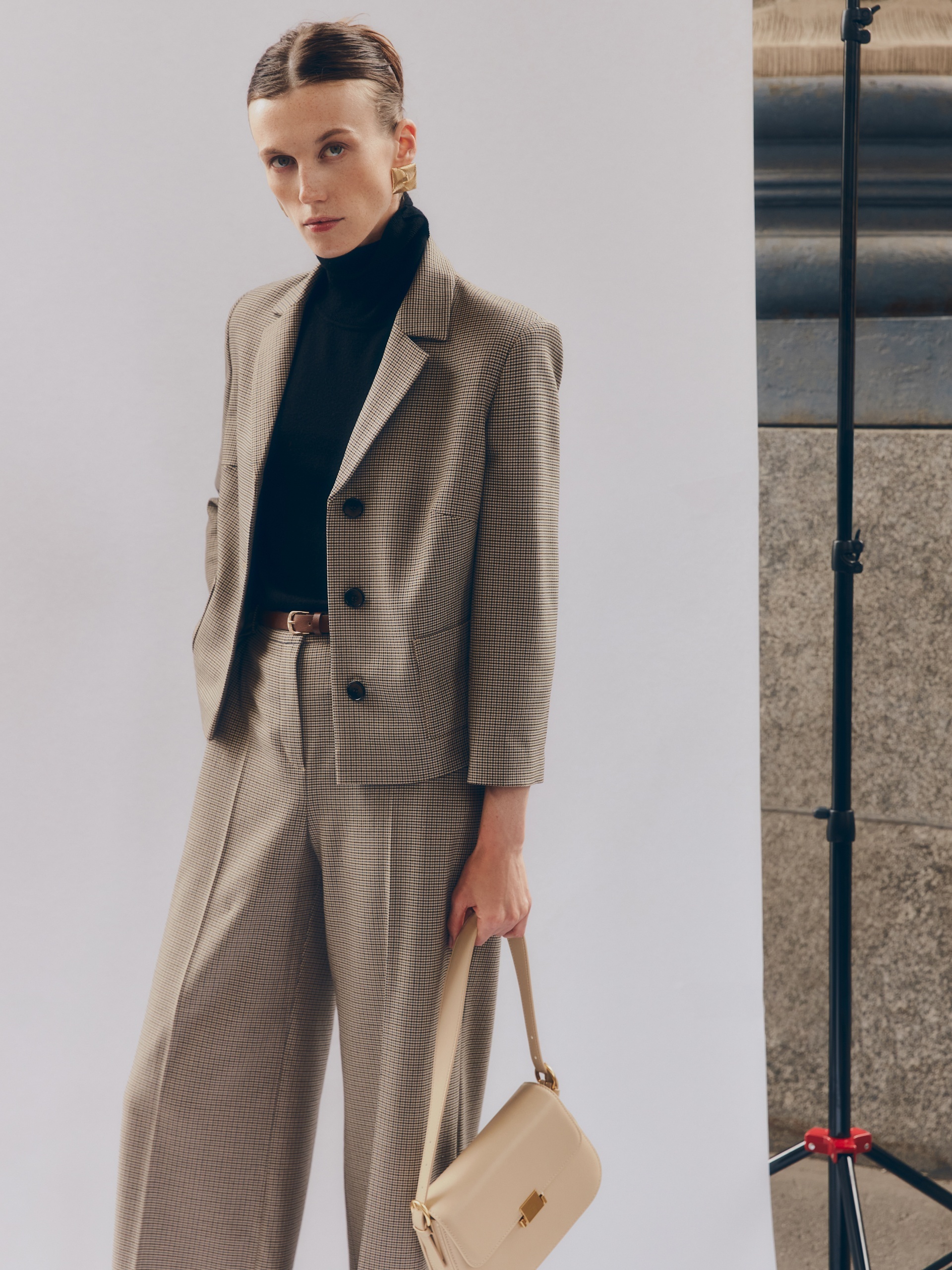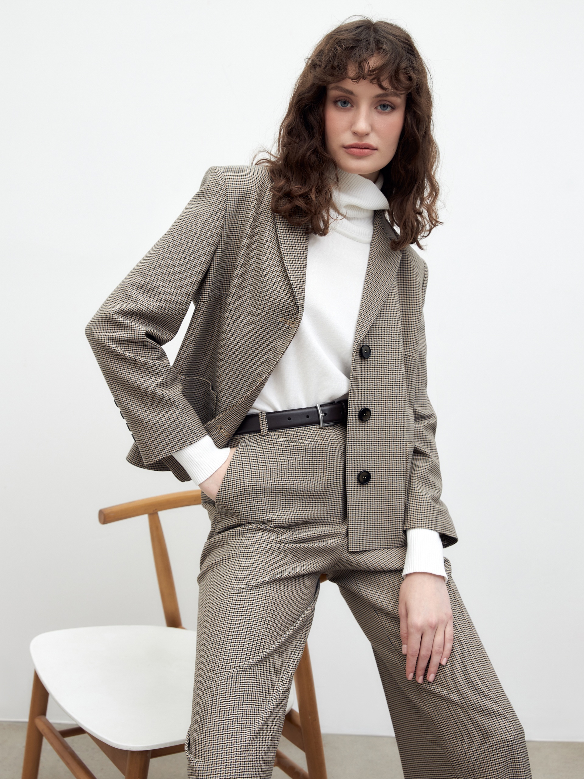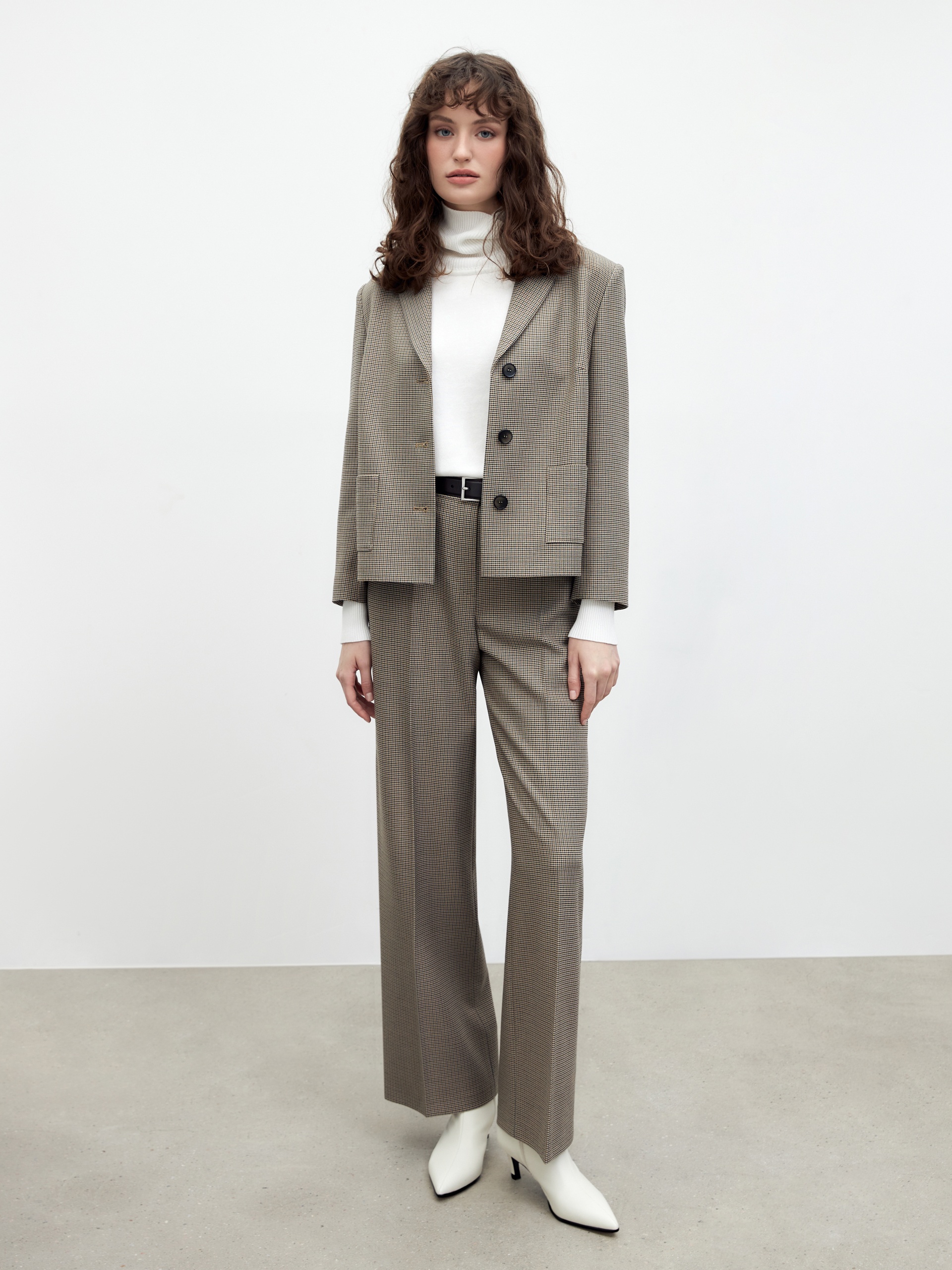 Приталенный укороченный однобортный жакет с небольшим английским воротником на трех пуговицах. На полочке накладные карманы. Рукава полной длины. Жакет на подкладке.