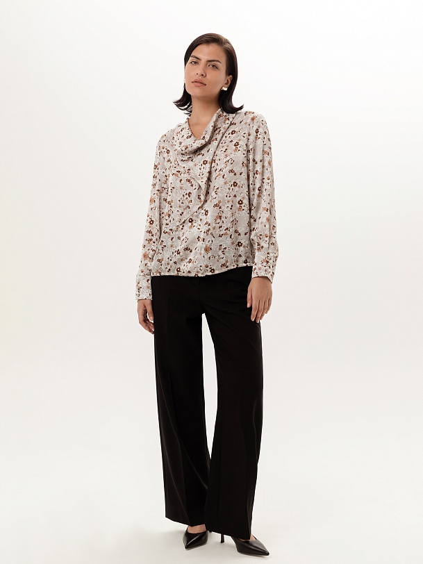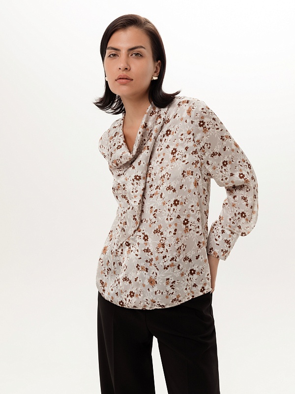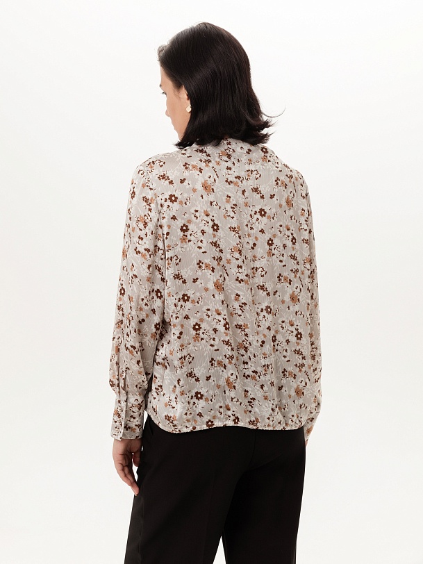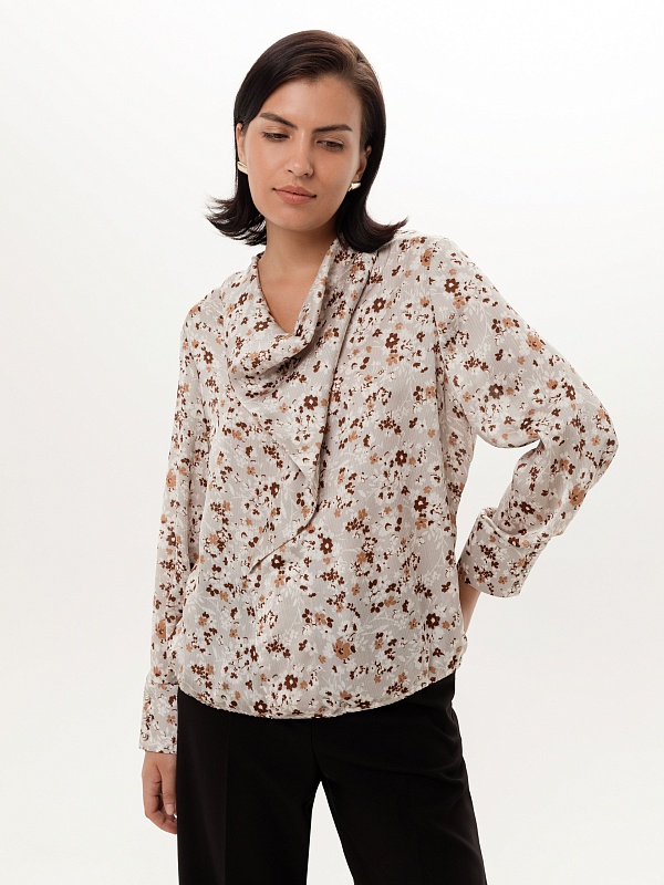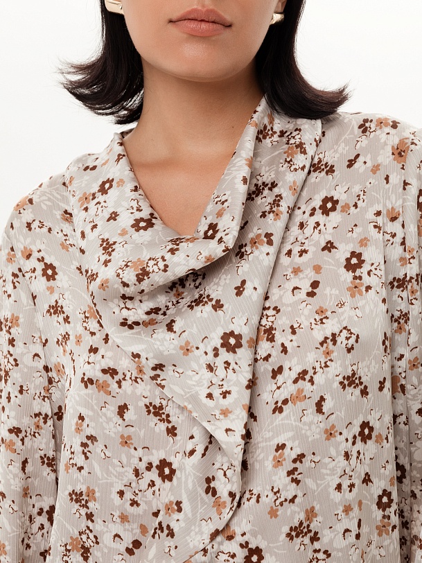 Свободная блуза с вырезом качелями из плательной ткани с принтом по низу блузы вставлена резинка. Рукав втачной с узким высоким манжетом по низу и сборкой для объема.
