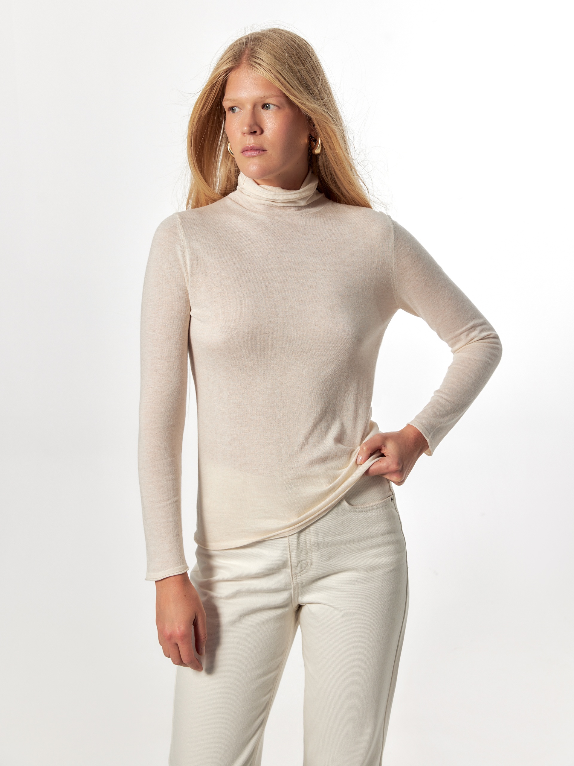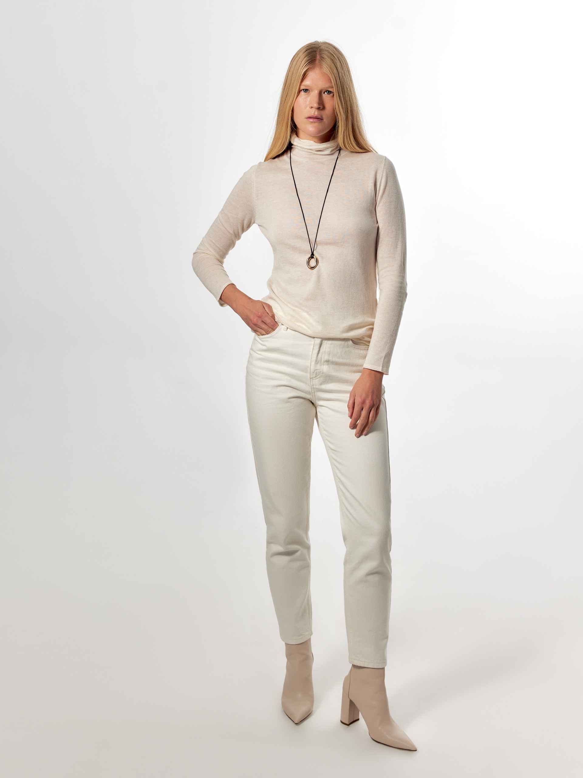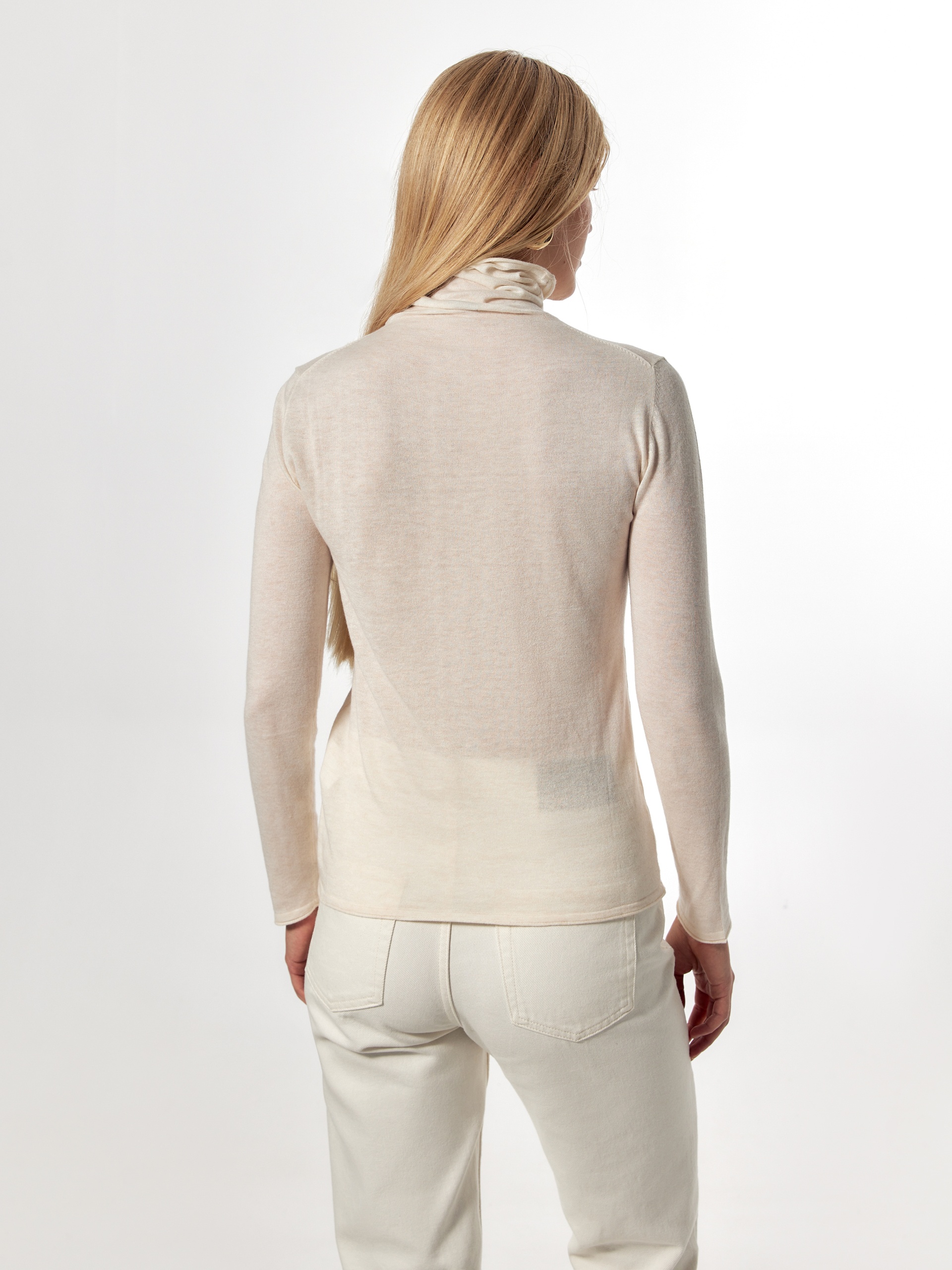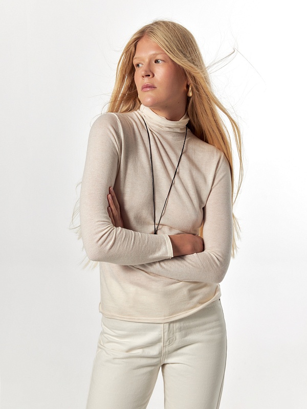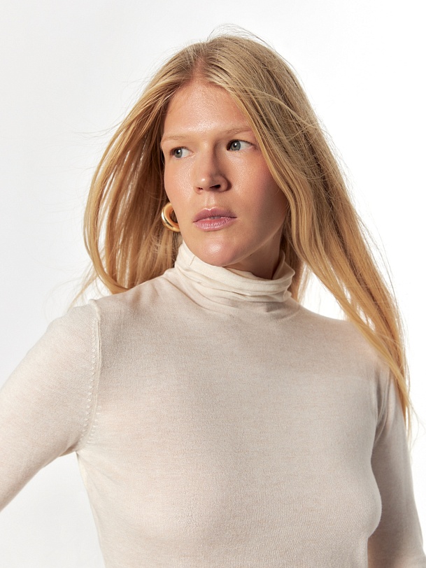Легкая водолазка полуприлегающего силуэта из невесомого кашемира достаточно тонкая, чтобы носить ее под пиджак или пальто в качестве второго слоя. Невесомая пряжа из вычесанного вручную пуха горных коз согревает лучше овечьей шерсти. Такой трикотаж хорошо держит форму, вязанный в одну нить, он остается плотным и пластичным. Модель с цельновязанной стойкой, втачным рукавом и резинкой по линии низа и низу рукава останется фаворитом в Вашем гардеробе не на один сезон.