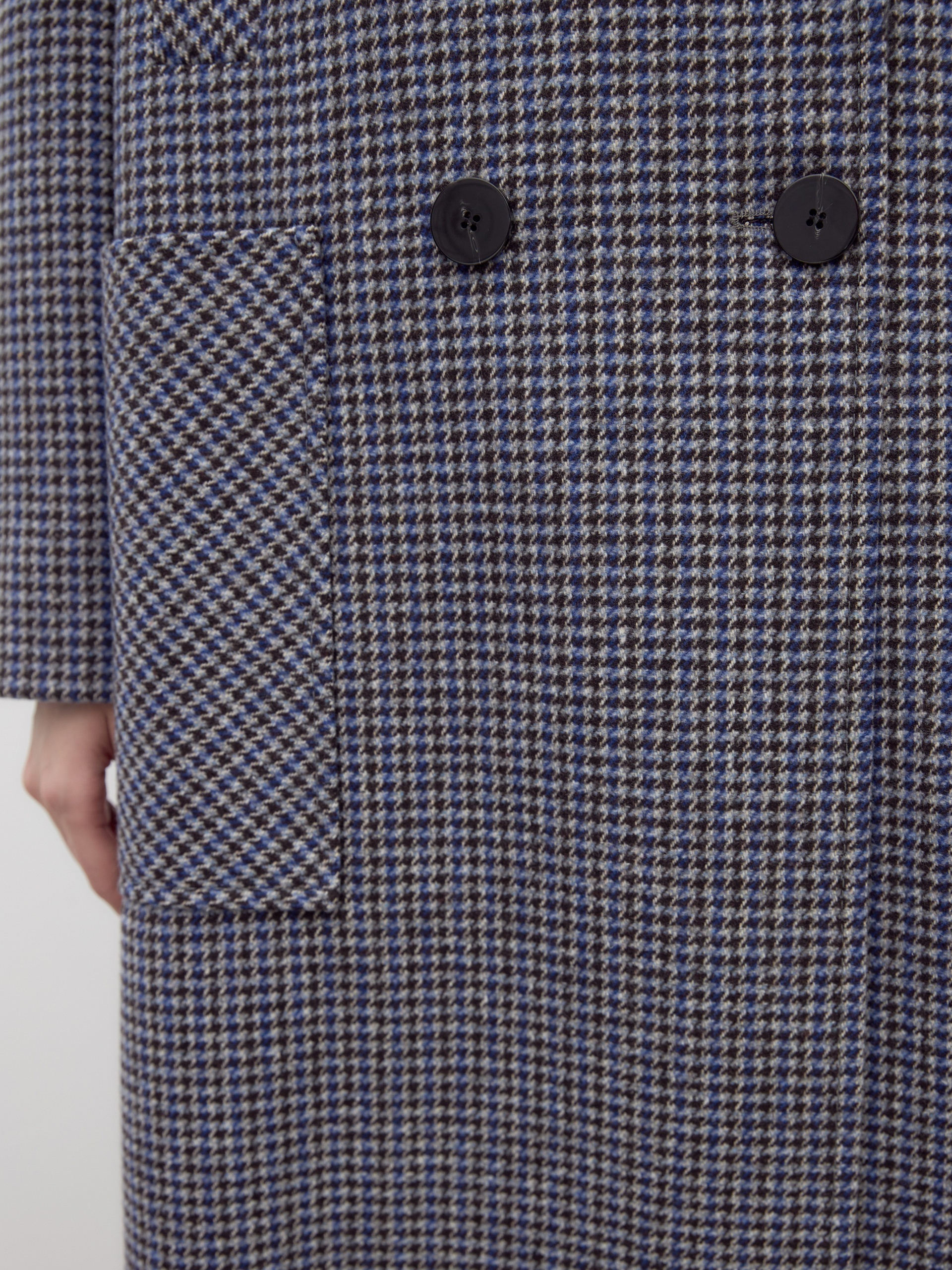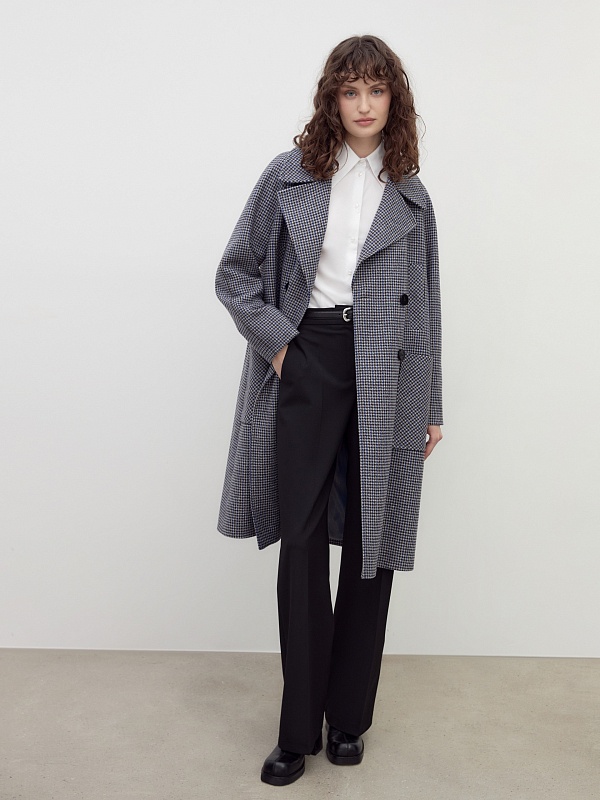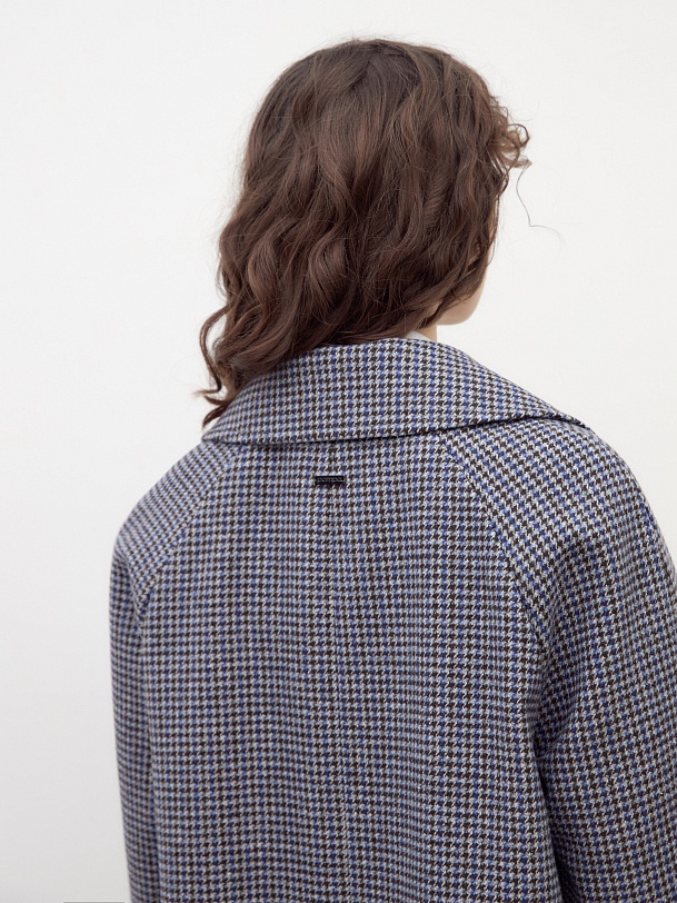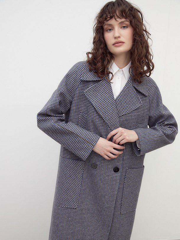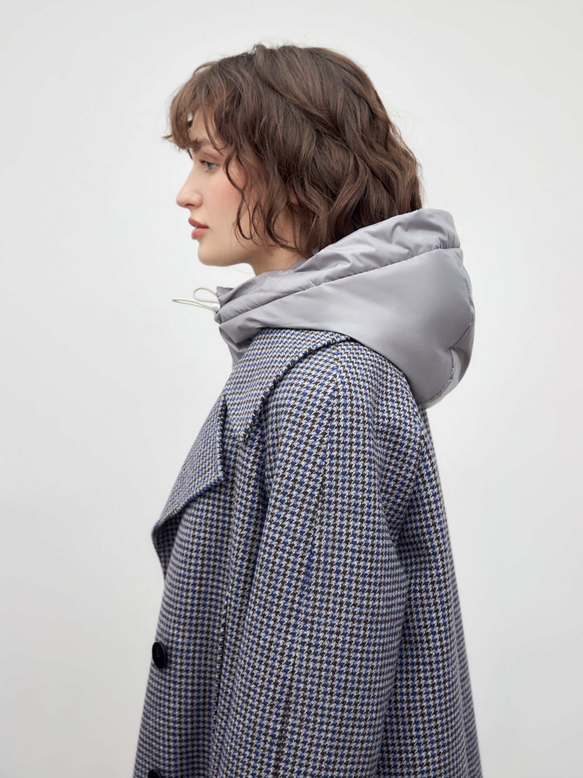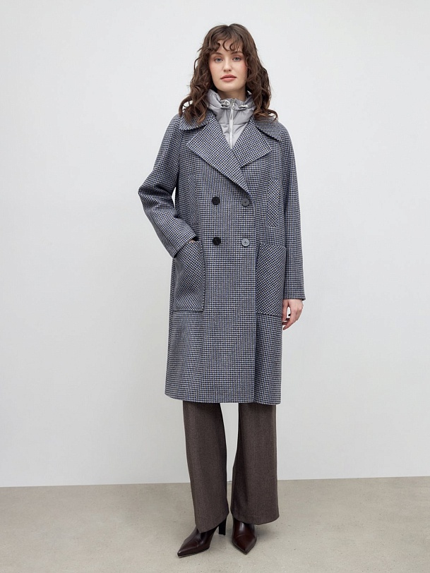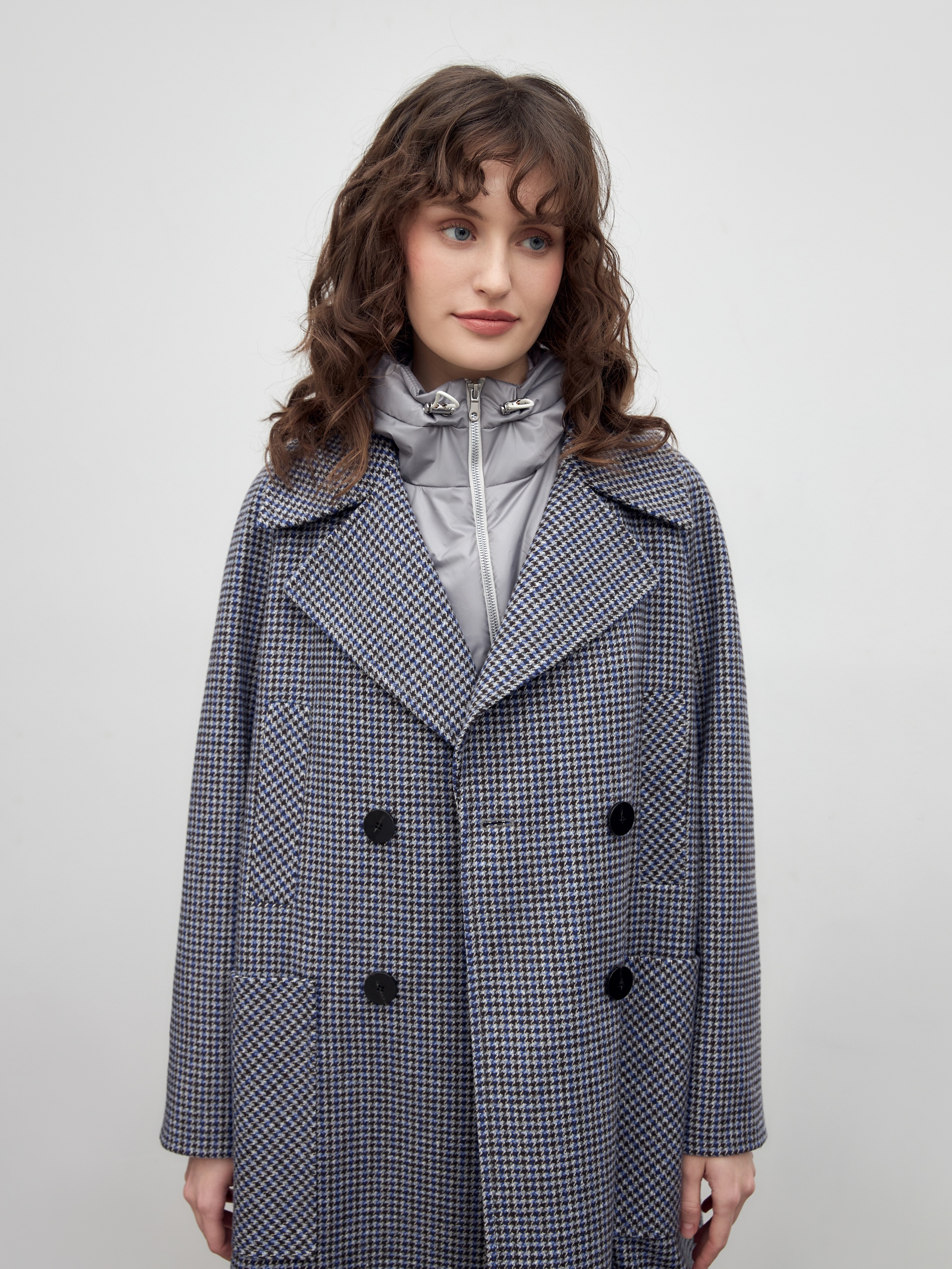 Двубортное пальто трапециевидного силуэта из твидовой ткани в свежем оттенке сине-бежевого пье-де-пуля. Пальто имеет новую уникальную конструкцию: английский воротник с широким лацканом, свободный рукав реглан. Две пары карманов: накладные по бокам и прорезные с листочками на груди, делают изделие невероятно модным. Воротник и карманы декорированы отделочной строчкой. Застежка на два ряда контрастных глянцевых пуговиц. Длина пальто выше колена. В комплекте с пальто предлагается теплый капюшон из плащевой ткани с водонепроницаемым покрытием. Капюшон имеет новую легкую фурнитуру и мягкие стопора, которые не будут замерзать на холоде. Такой капюшон надежно защитит от осадков, а универсальный светло-серый цвет позволяет сочетать его с другими пальто нашей коллекции. А для наилучшей защиты от непогоды изделие выполнено с использованием высокотехнологичной мембраны RaftPro. Произведено в Санкт-Петербурге.