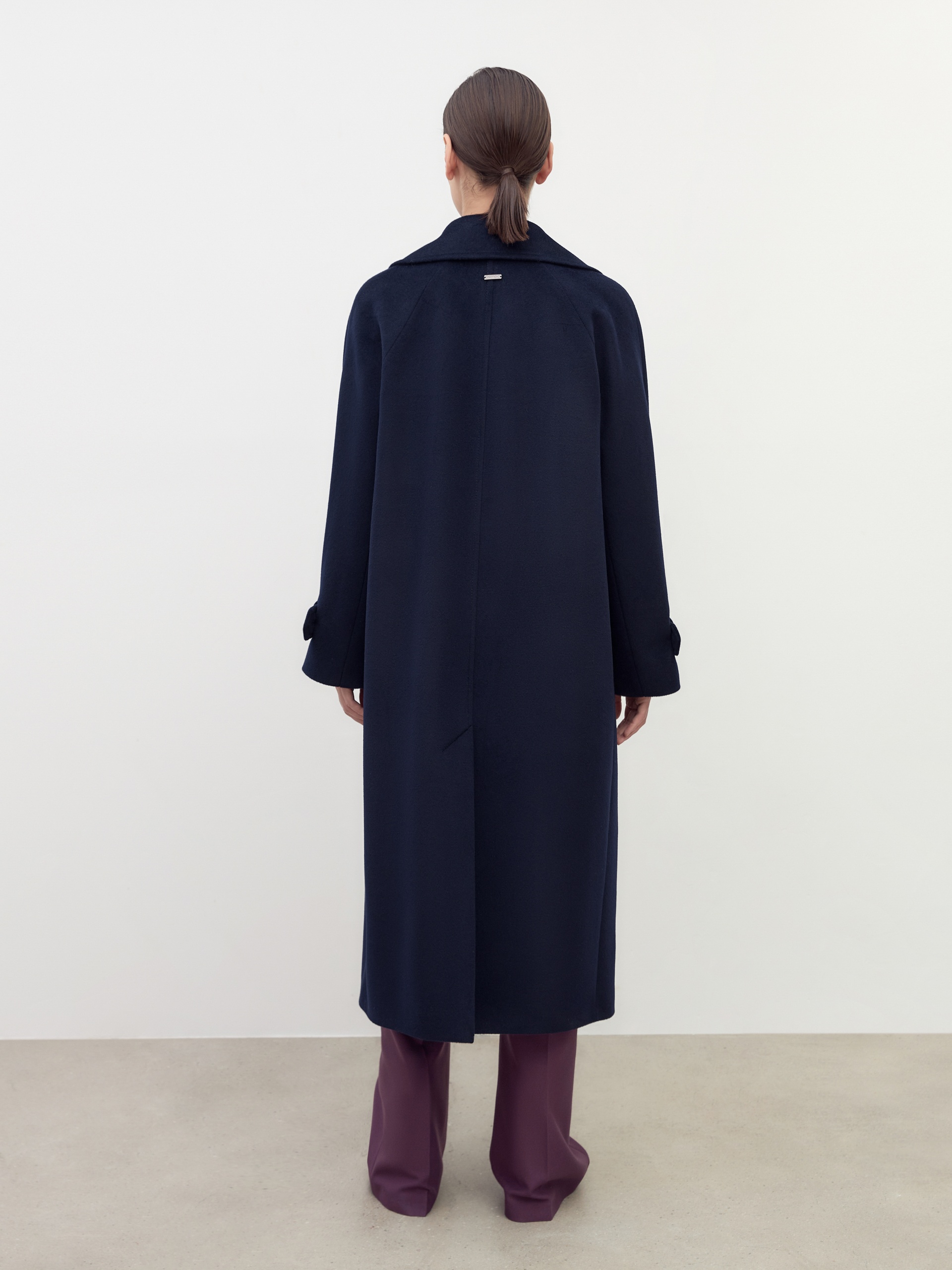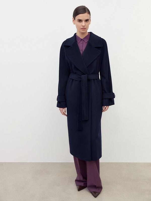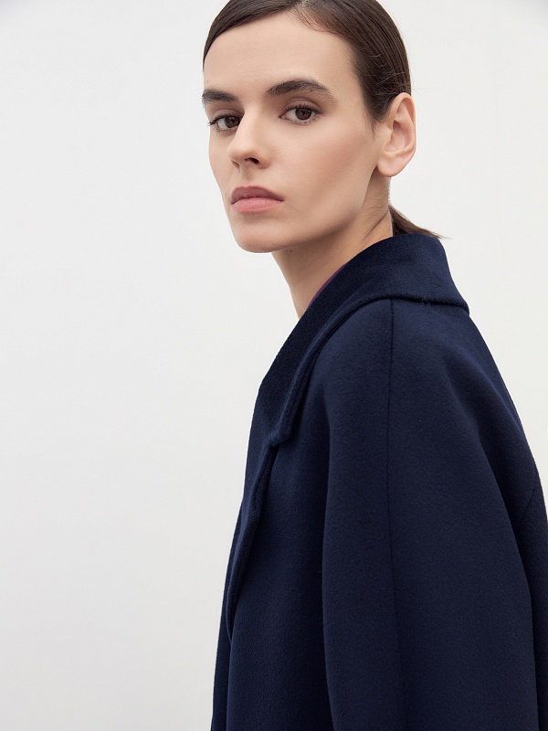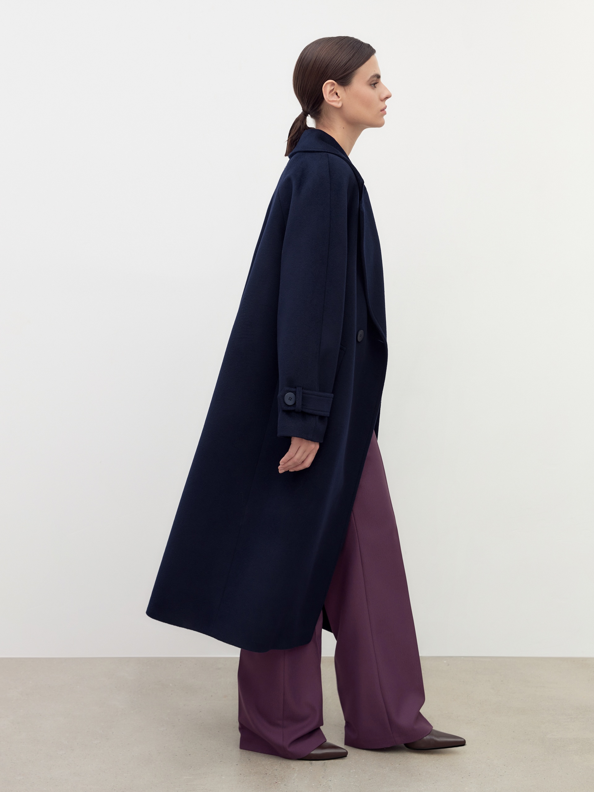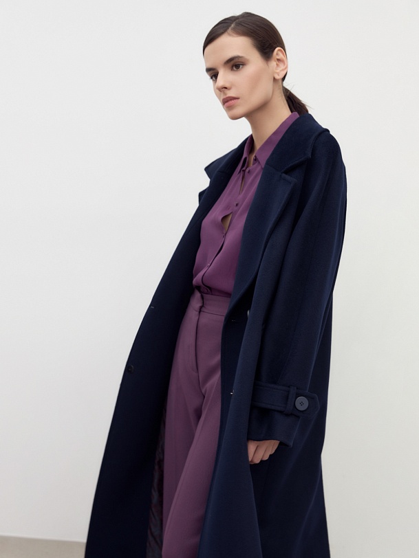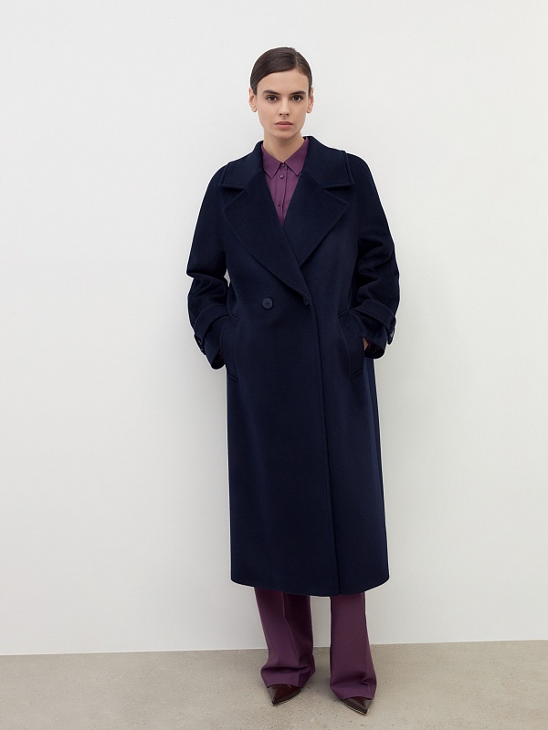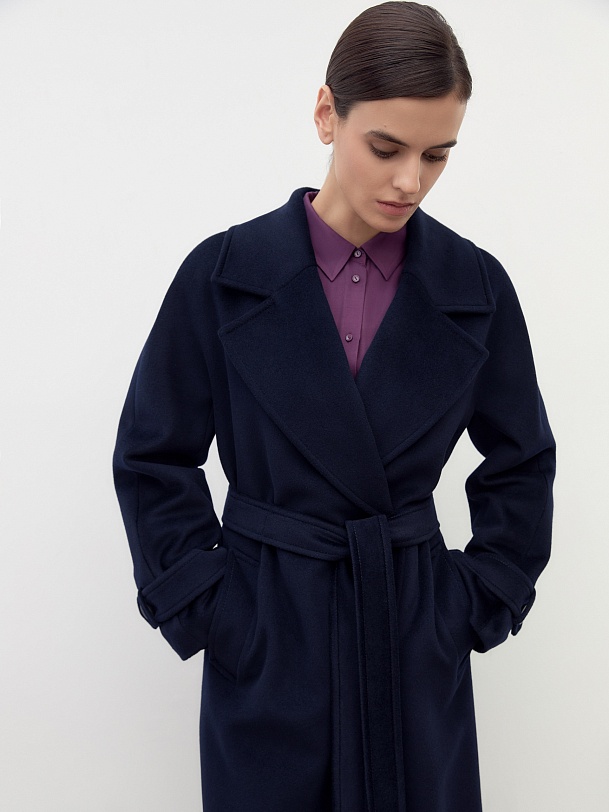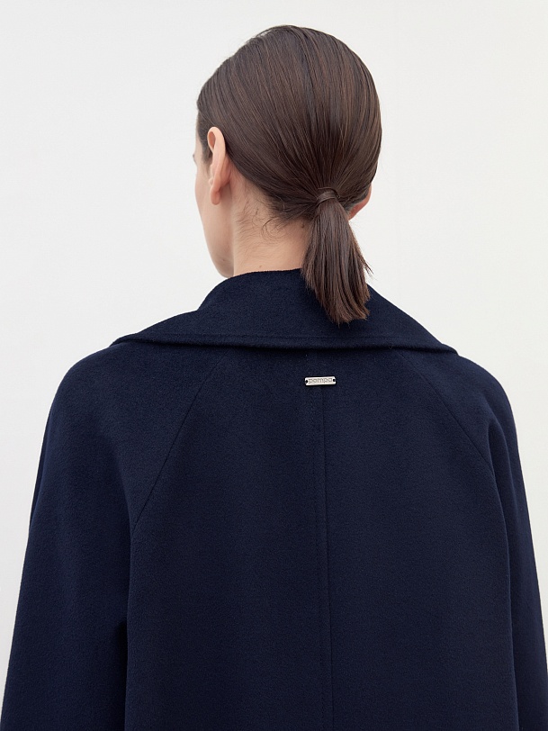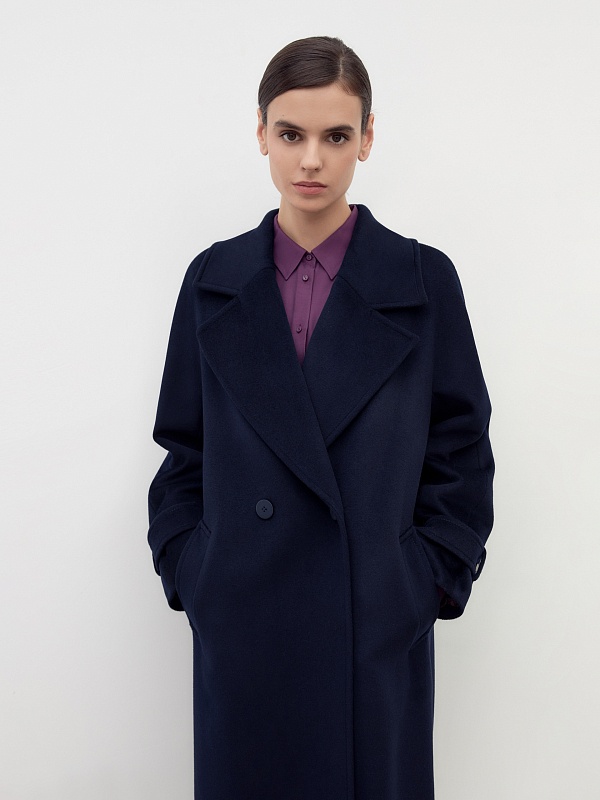 Классическое двубортное пальто силуэта "удлинённый кокон" в глубоком чернильном оттенке. Пальто сшито из премиальной ворсовой ткани с высоким содержанием шерсти. Широкий английский воротник с новой современной конструкцией лацкана и свободный комбинированный рукав делают пальто стильным и удобным. Низ рукава оформлен декоративной патой. По бокам расположены глубокие карманы с листочками. В среднем шве спинки высокая шлица. Застёгивается пальто на пару крупных пуговиц в цвет ткани и пришивные кнопки. Образ дополняет пояс из основной ткани. Длина пальто ниже колена. Для наилучшей защиты от непогоды изделие выполнено с использованием высокотехнологичной мембраны RaftPro, а спинка пальто имеет дополнительное утепление. Произведено в Санкт-Петербурге.