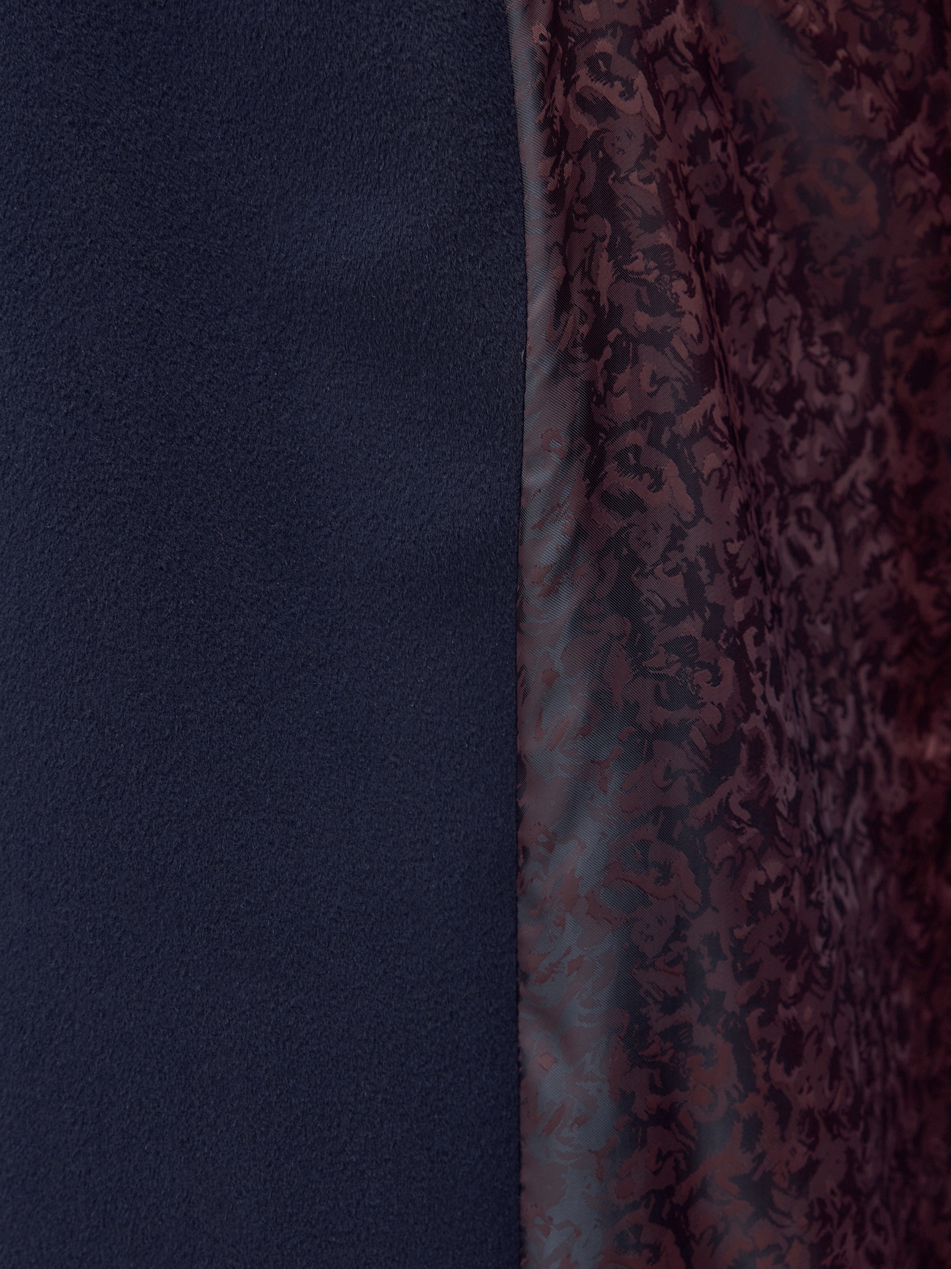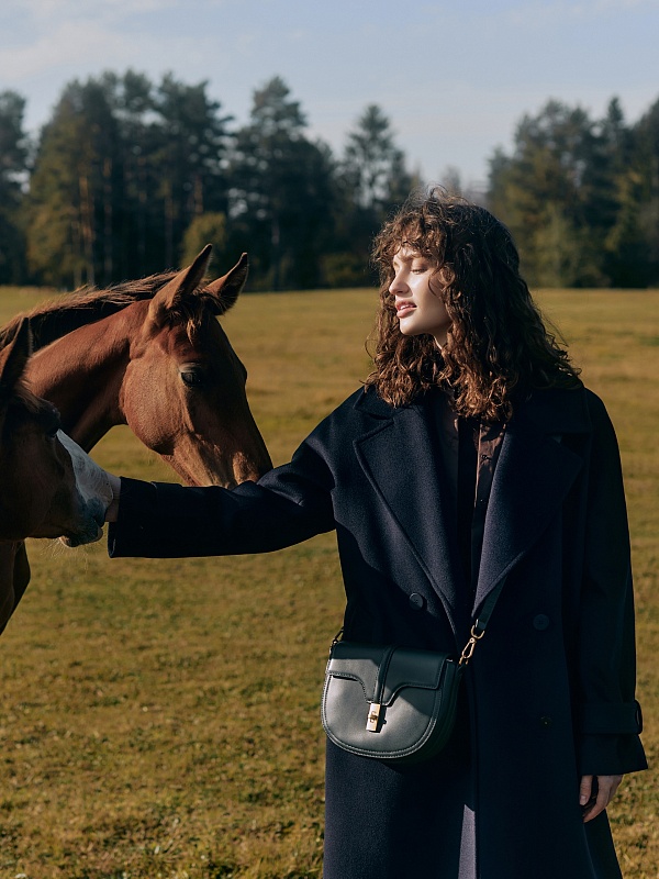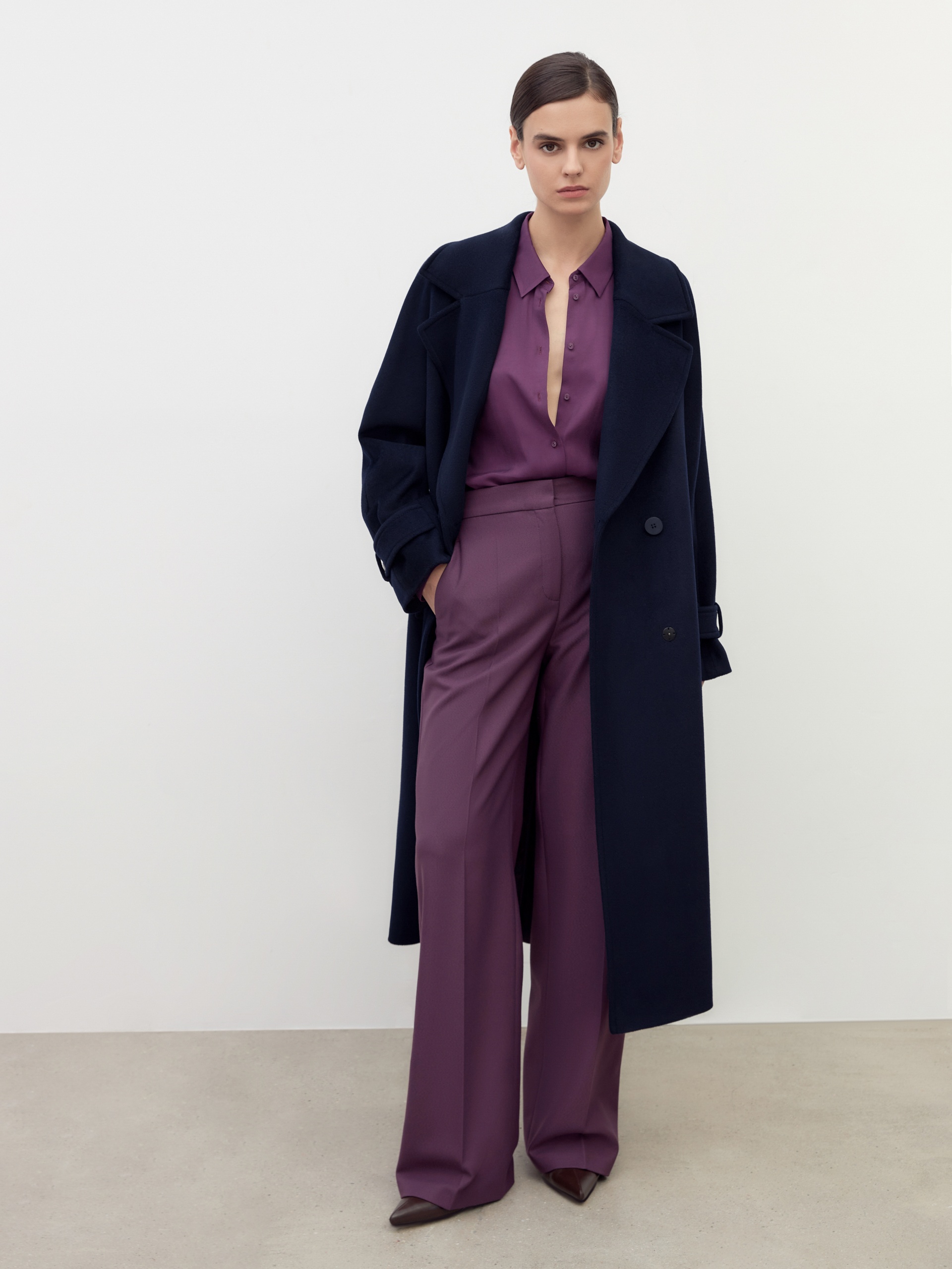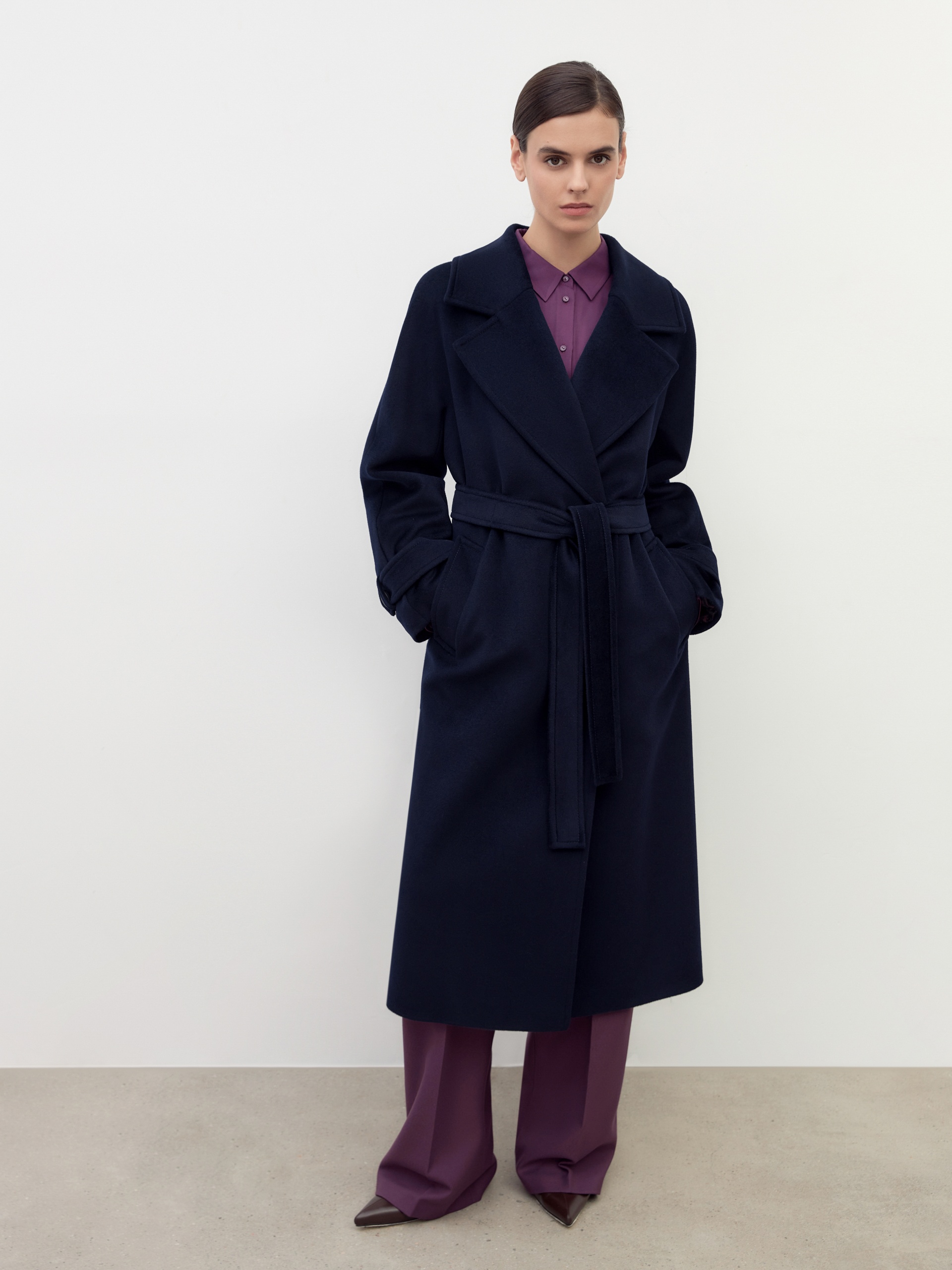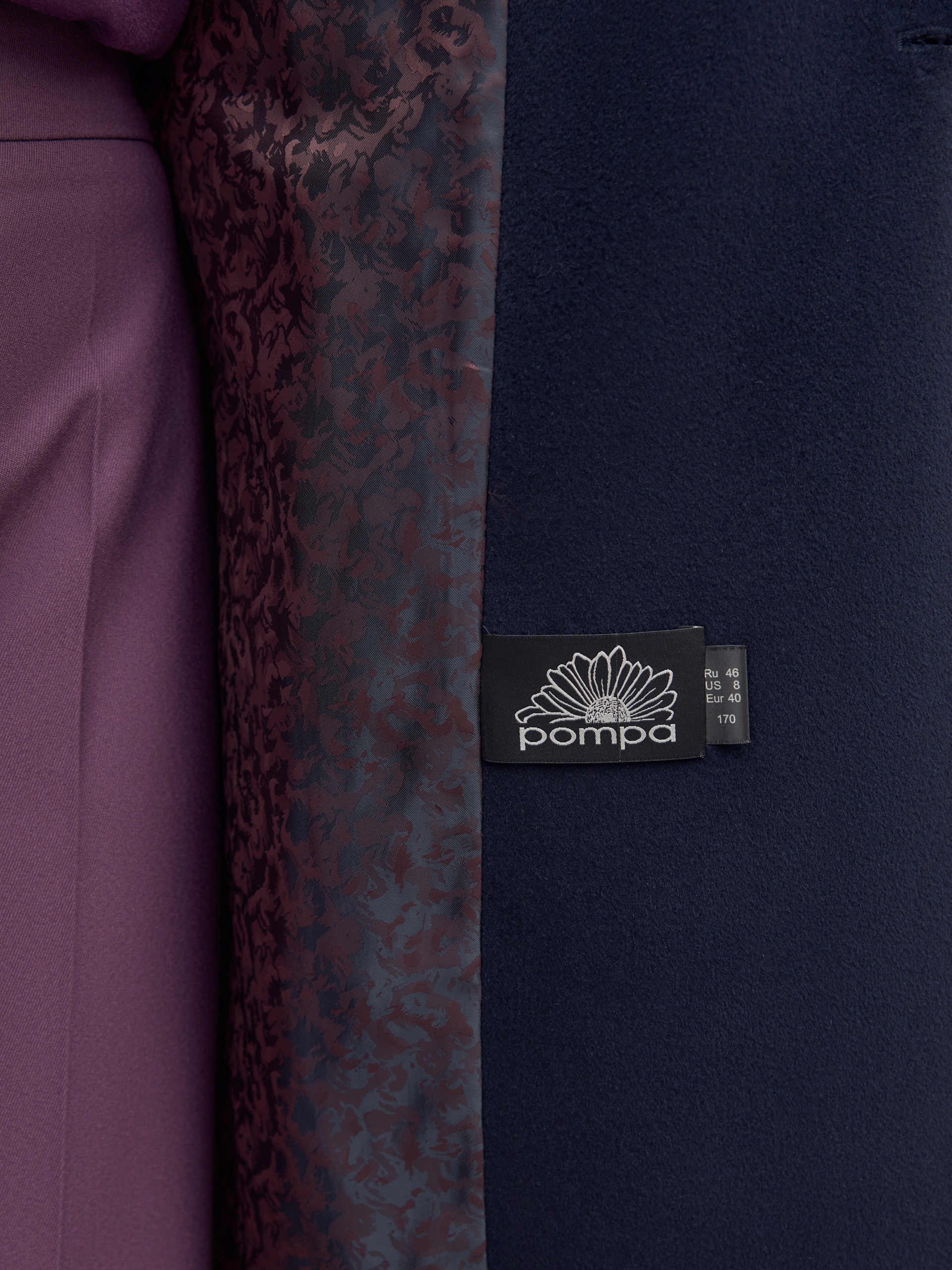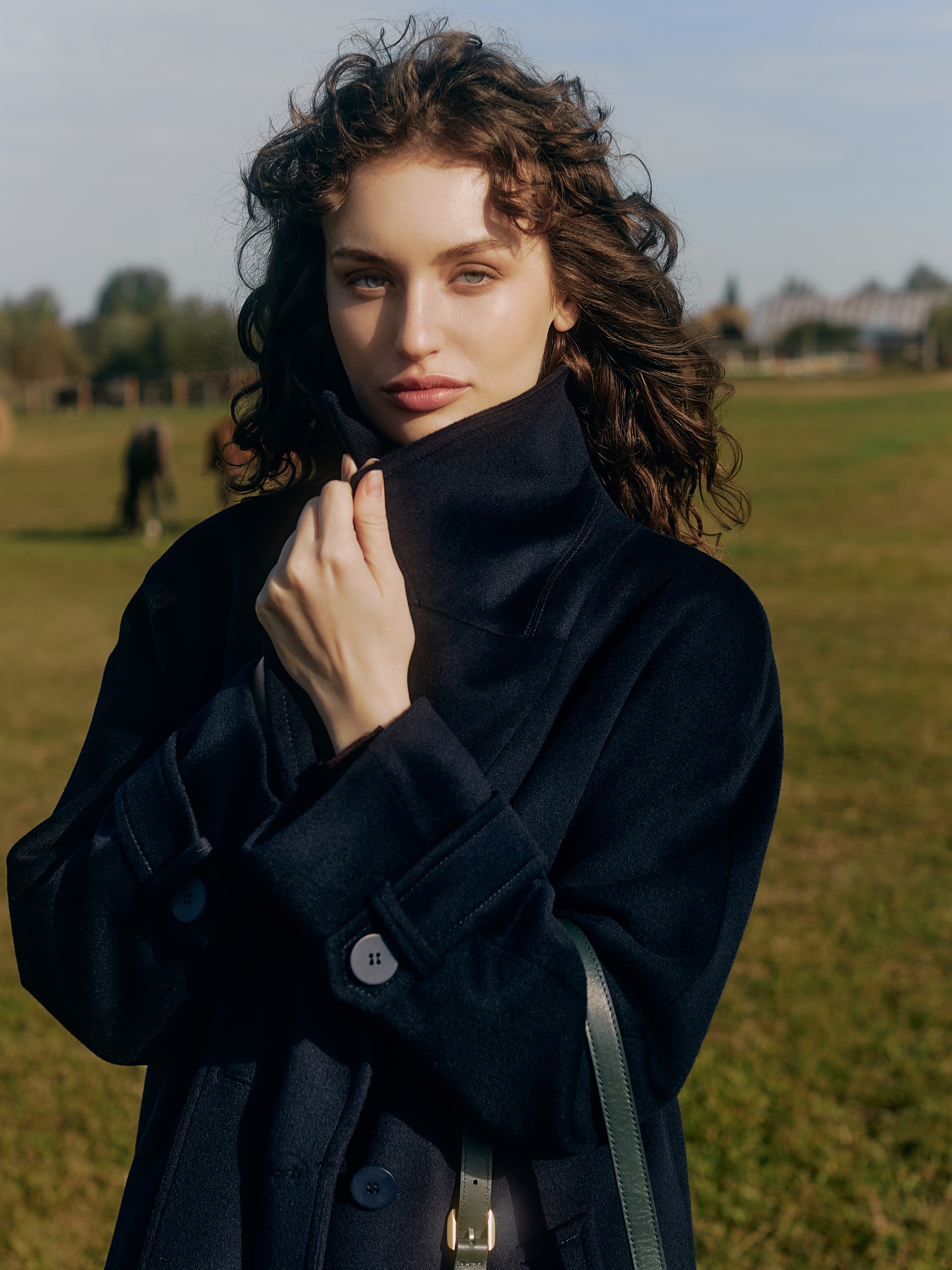 Классическое двубортное пальто силуэта "удлинённый кокон" в глубоком чернильном оттенке. Пальто сшито из премиальной ворсовой ткани с высоким содержанием шерсти. Широкий английский воротник с новой современной конструкцией лацкана и свободный комбинированный рукав делают пальто стильным и удобным. Низ рукава оформлен декоративной патой. По бокам расположены глубокие карманы с листочками. В среднем шве спинки высокая шлица. Застёгивается пальто на пару крупных пуговиц в цвет ткани и пришивные кнопки. Образ дополняет пояс из основной ткани. Длина пальто ниже колена. Для наилучшей защиты от непогоды изделие выполнено с использованием высокотехнологичной мембраны RaftPro, а спинка пальто имеет дополнительное утепление. Произведено в Санкт-Петербурге.