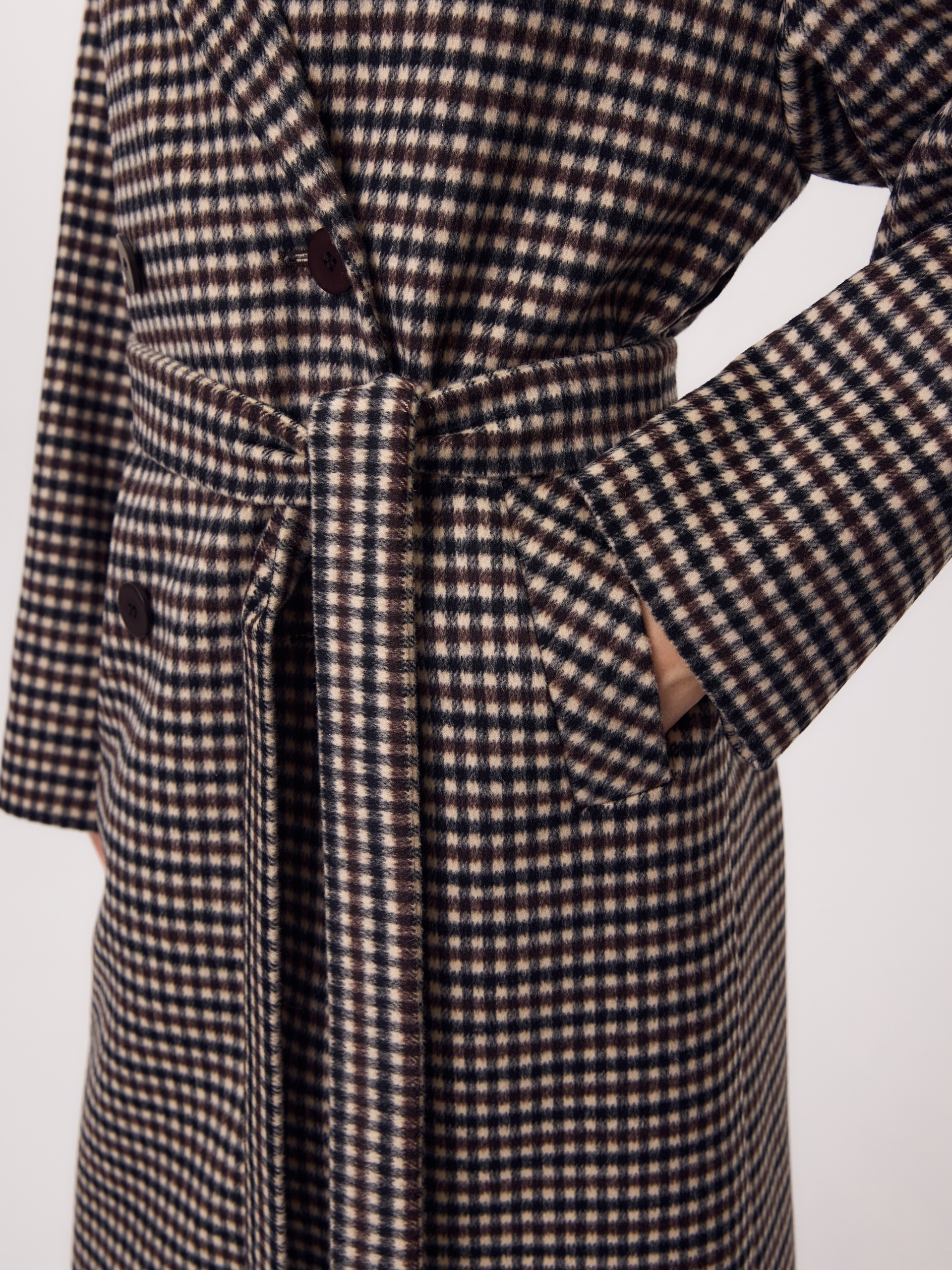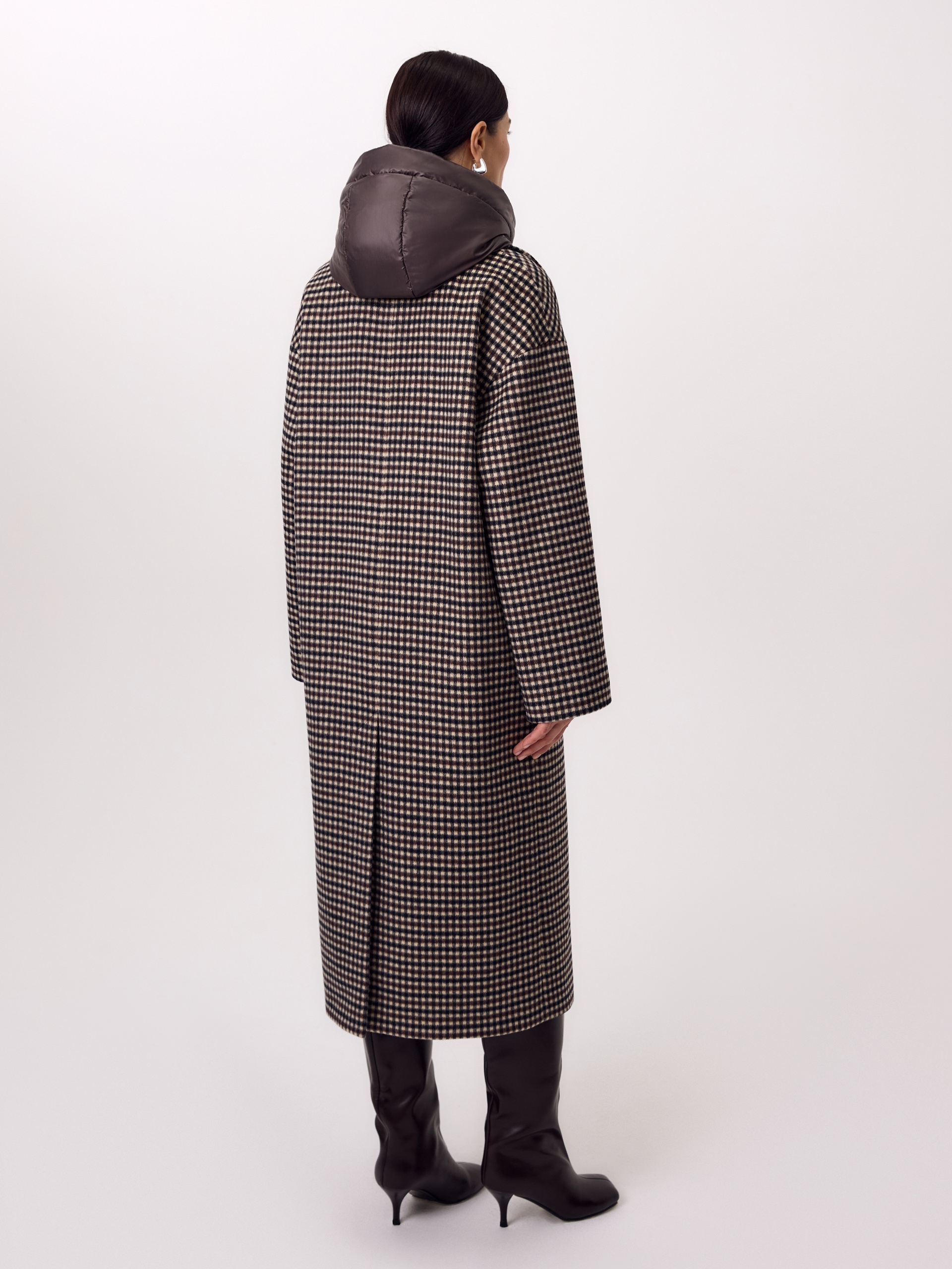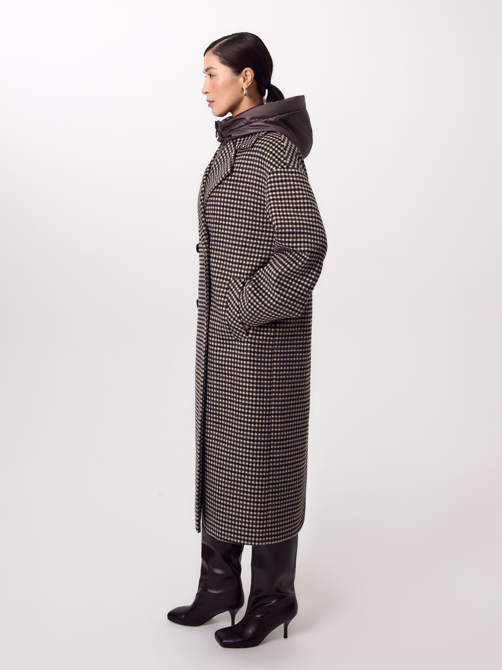 Двубортное пальто прямого силуэта из ворсовой ткани в нежную коричнево-бежевую клетку. Пальто имеет свободный и не стесняющий движений рубашечный рукав, классический английский воротник и универсальную длину ниже колена. По бокам располагаются глубокие карманы с листочками. Застегивается изделие на два ряда стильных матовых пуговиц. Образ дополняет пояс из основной ткани. В комплекте к пальто предлагается теплый капюшон из плащевой ткани с водонепроницаемым покрытием. Он надежно защитит от осадков и разнообразит образ, а универсальный тёмно-коричневый цвет позволяет сочетать его и с другими пальто нашей коллекции. Капюшон имеет новую легкую фурнитуру и мягкие стопора, которые не будут замерзать на холоде. Для наилучшей защиты от непогоды изделие выполнено с использованием высокотехнологичной мембраны RaftPro, а спинка пальто имеет дополнительное утепление. Произведено в Санкт-Петербурге.