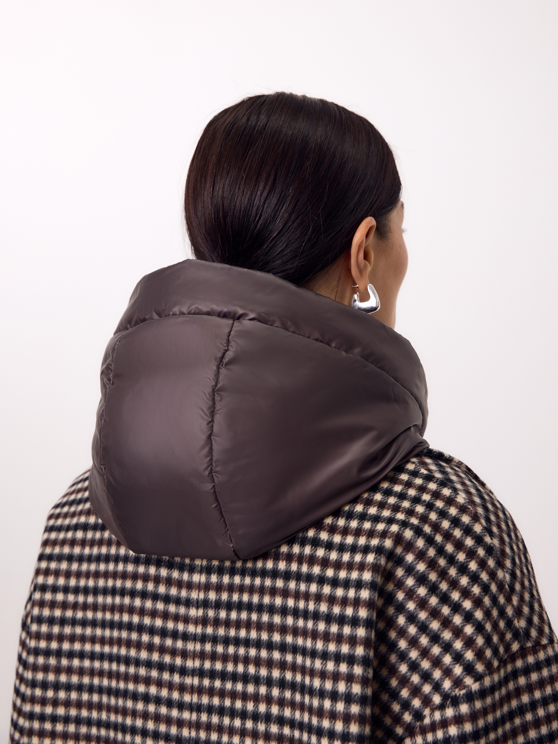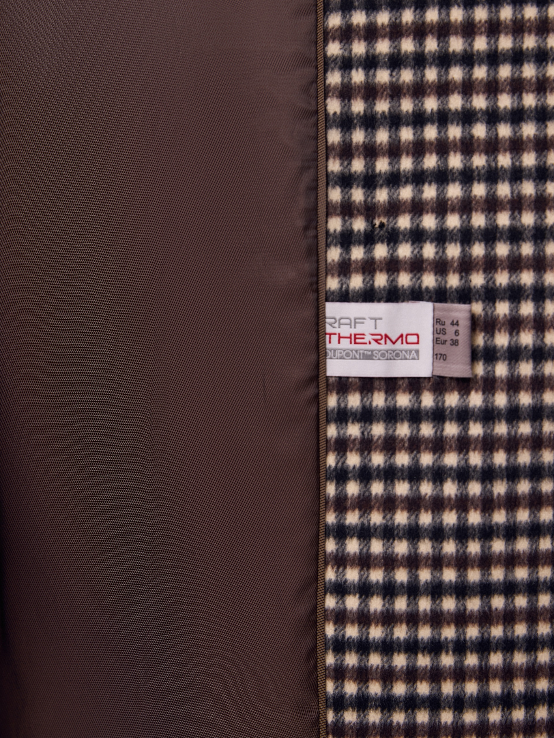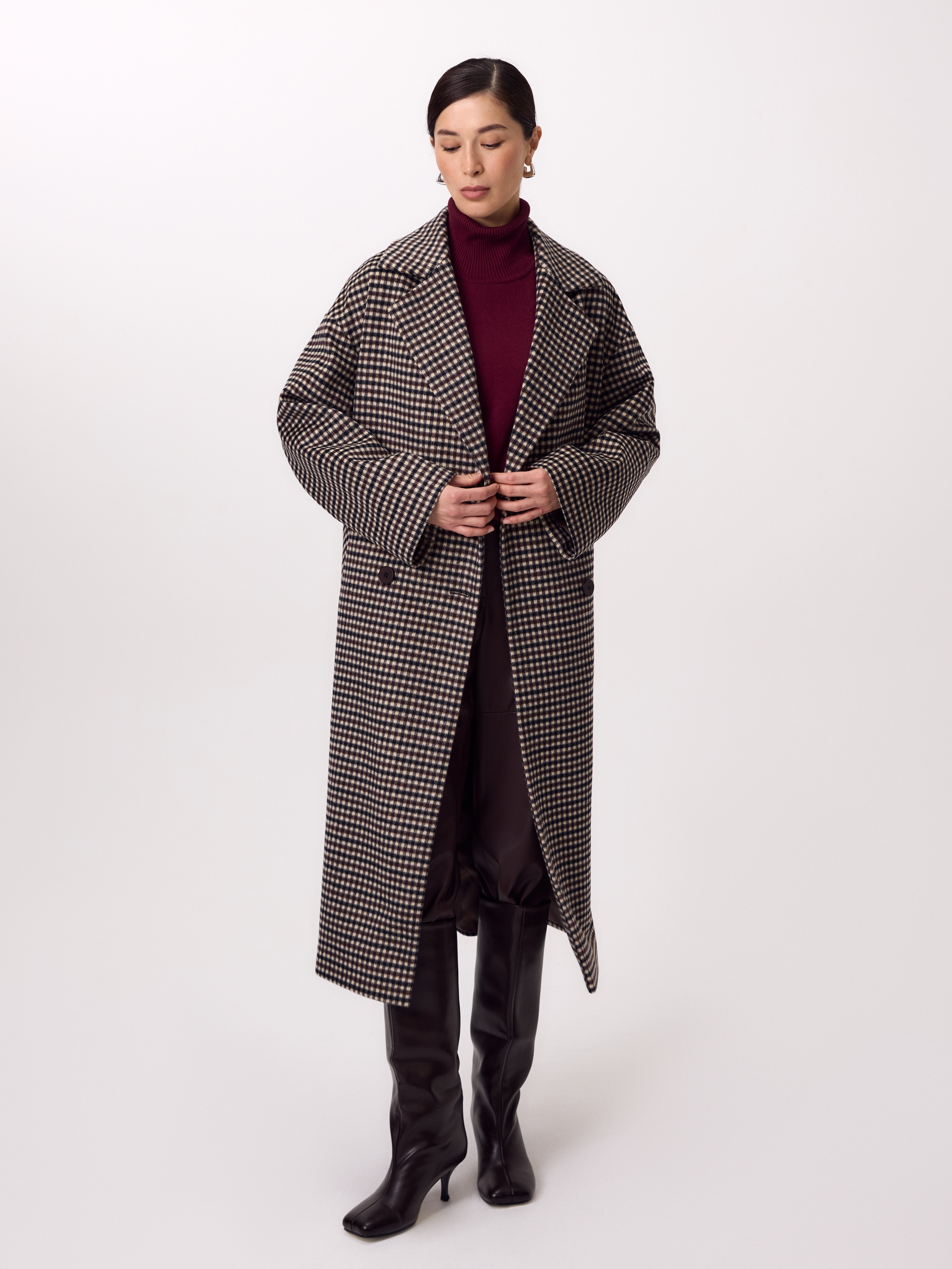 Двубортное пальто прямого силуэта из ворсовой ткани в нежную коричнево-бежевую клетку. Пальто имеет свободный и не стесняющий движений рубашечный рукав, классический английский воротник и универсальную длину ниже колена. По бокам располагаются глубокие карманы с листочками. Застегивается изделие на два ряда стильных матовых пуговиц. Образ дополняет пояс из основной ткани. В комплекте к пальто предлагается теплый капюшон из плащевой ткани с водонепроницаемым покрытием. Он надежно защитит от осадков и разнообразит образ, а универсальный тёмно-коричневый цвет позволяет сочетать его и с другими пальто нашей коллекции. Капюшон имеет новую легкую фурнитуру и мягкие стопора, которые не будут замерзать на холоде. Для наилучшей защиты от непогоды изделие выполнено с использованием высокотехнологичной мембраны RaftPro, а спинка пальто имеет дополнительное утепление. Произведено в Санкт-Петербурге.