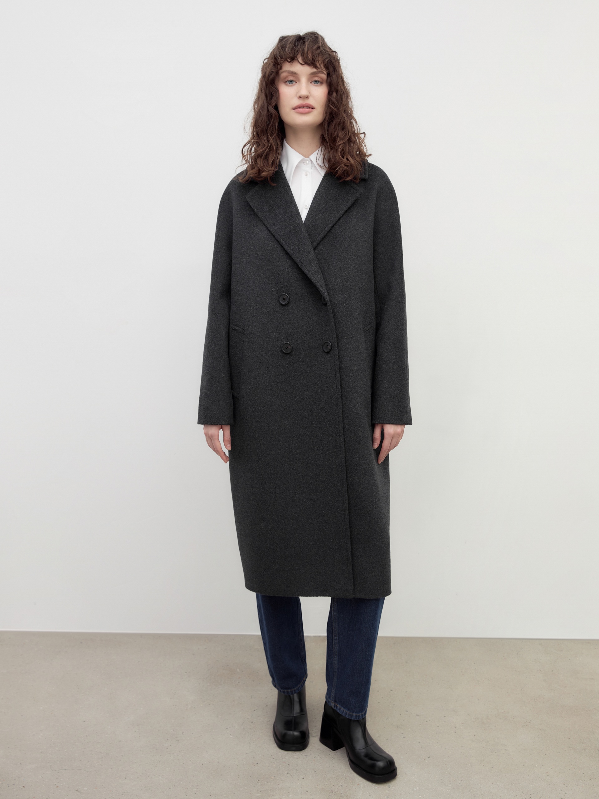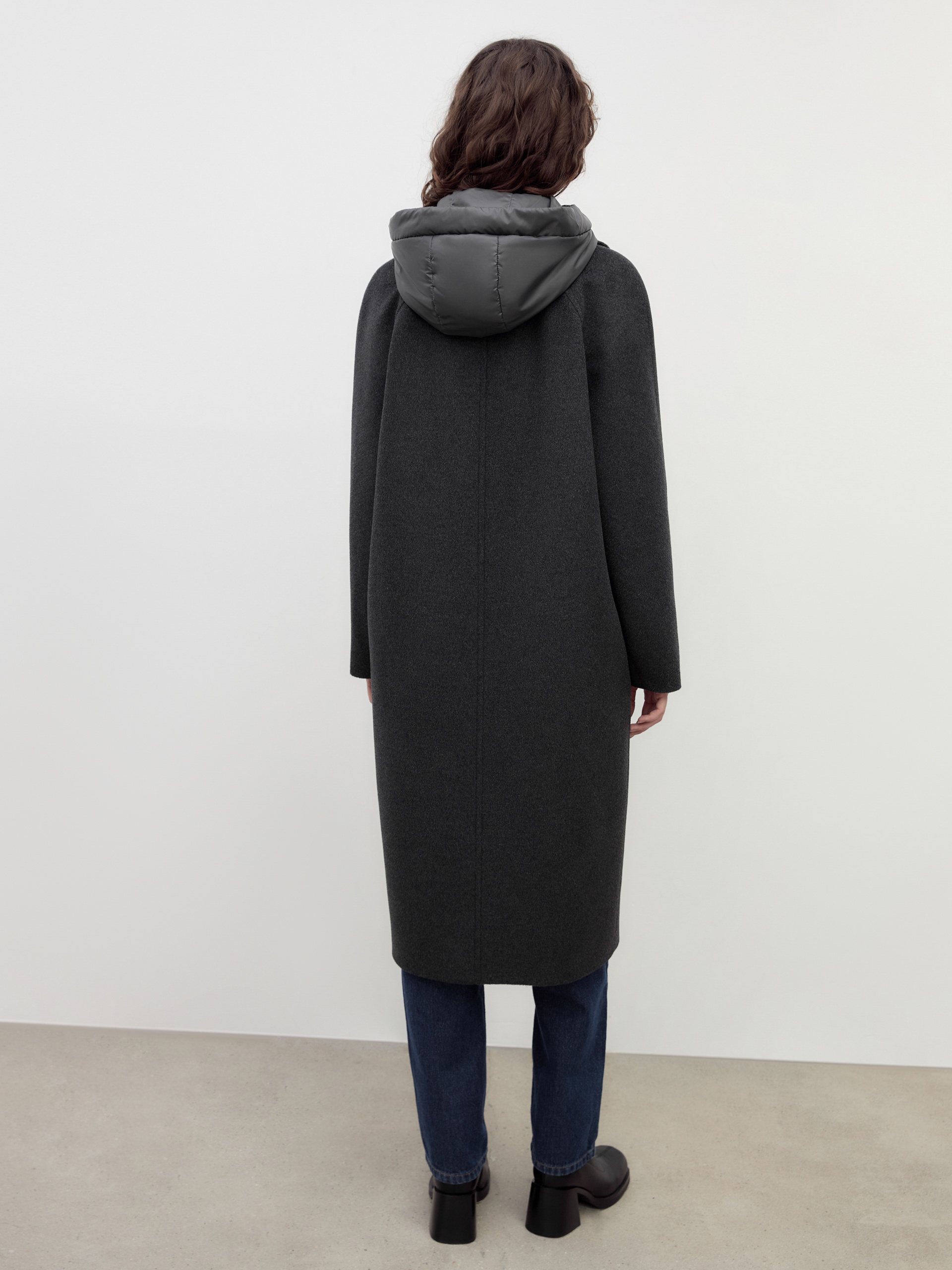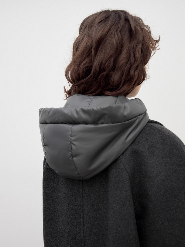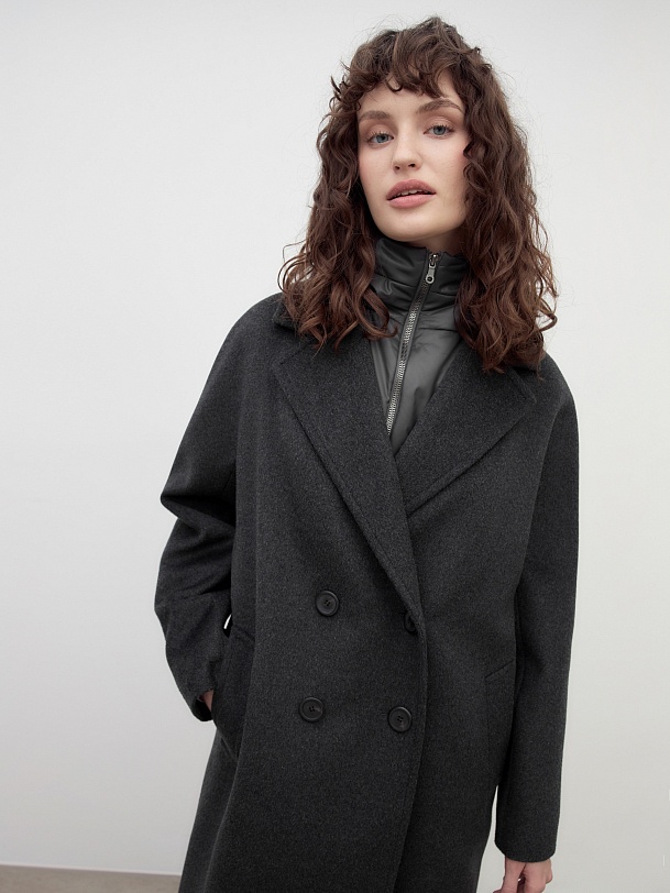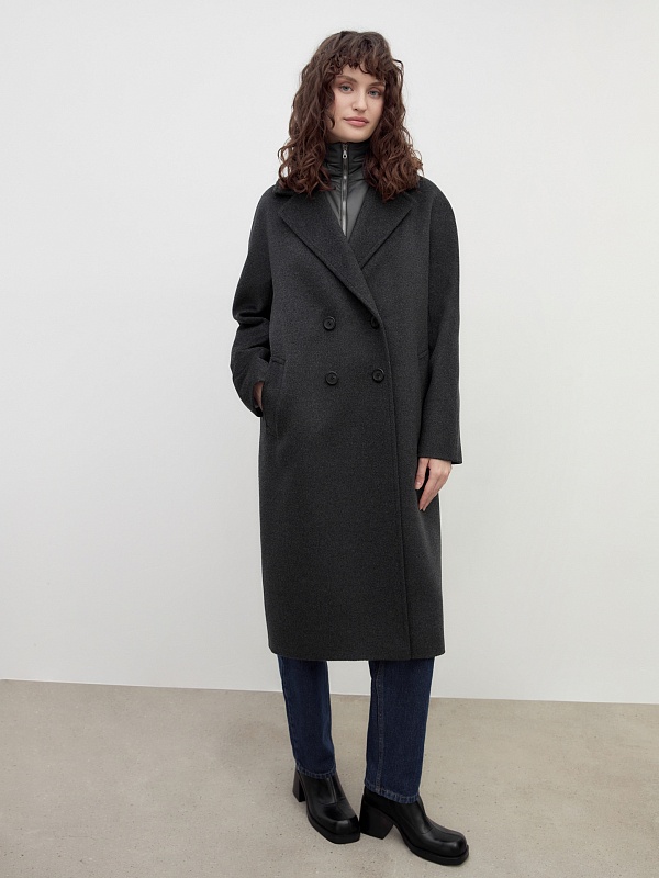 Двубортное пальто силуэта "удлиненный кокон" в благородном цвете темно-серый меланж. Пальто сшито из премиальной ворсовой ткани с высоким содержанием шерсти. Пальто имеет множество уникальных деталей: заведенные вперед боковые швы, объемный и мягкий силуэт, нетипичную линию английского воротника. Комбинированный рукав (цельнокроенный спереди и реглан на спинке) делает линию плеч мягкой и спокойной, не стесняет движений. Пальто универсальной длины ниже колена. Спинка имеет дополнительное утепление. Застежка на два ряда крупных темных пуговиц. В комплекте с пальто предлагается теплый капюшон из плащевой ткани с водонепроницаемым покрытием. Капюшон имеет новую легкую фурнитуру и мягкие стопора, которые не будут замерзать на холоде. Такой капюшон надежно защитит от осадков, а универсальный серый цвет позволит сочетать его и с другими пальто нашей коллекции. А для наилучшей защиты от непогоды пальто произведено с использованием высокотехнологичной мембраны RaftPro. Произведено в Санкт-Петербурге.