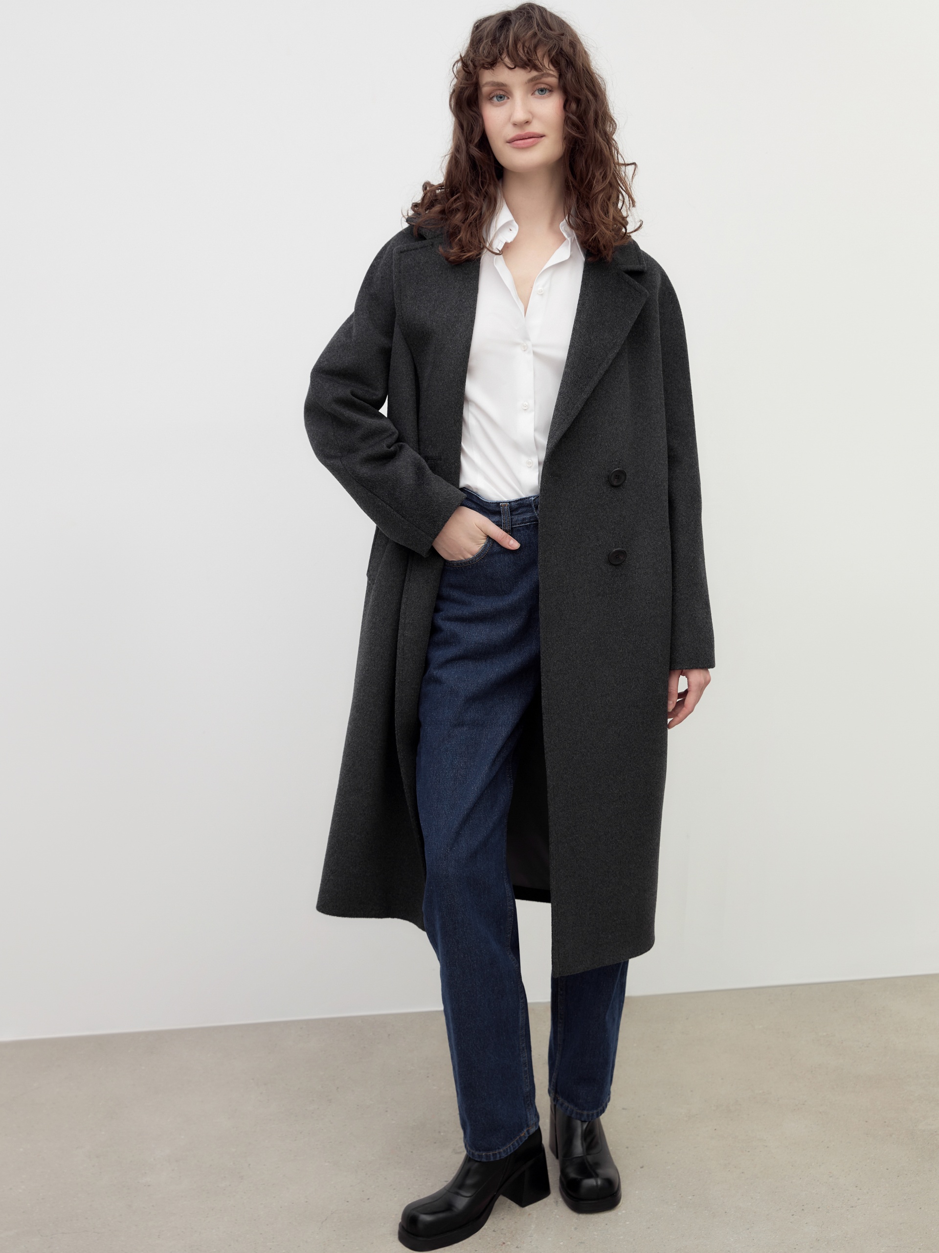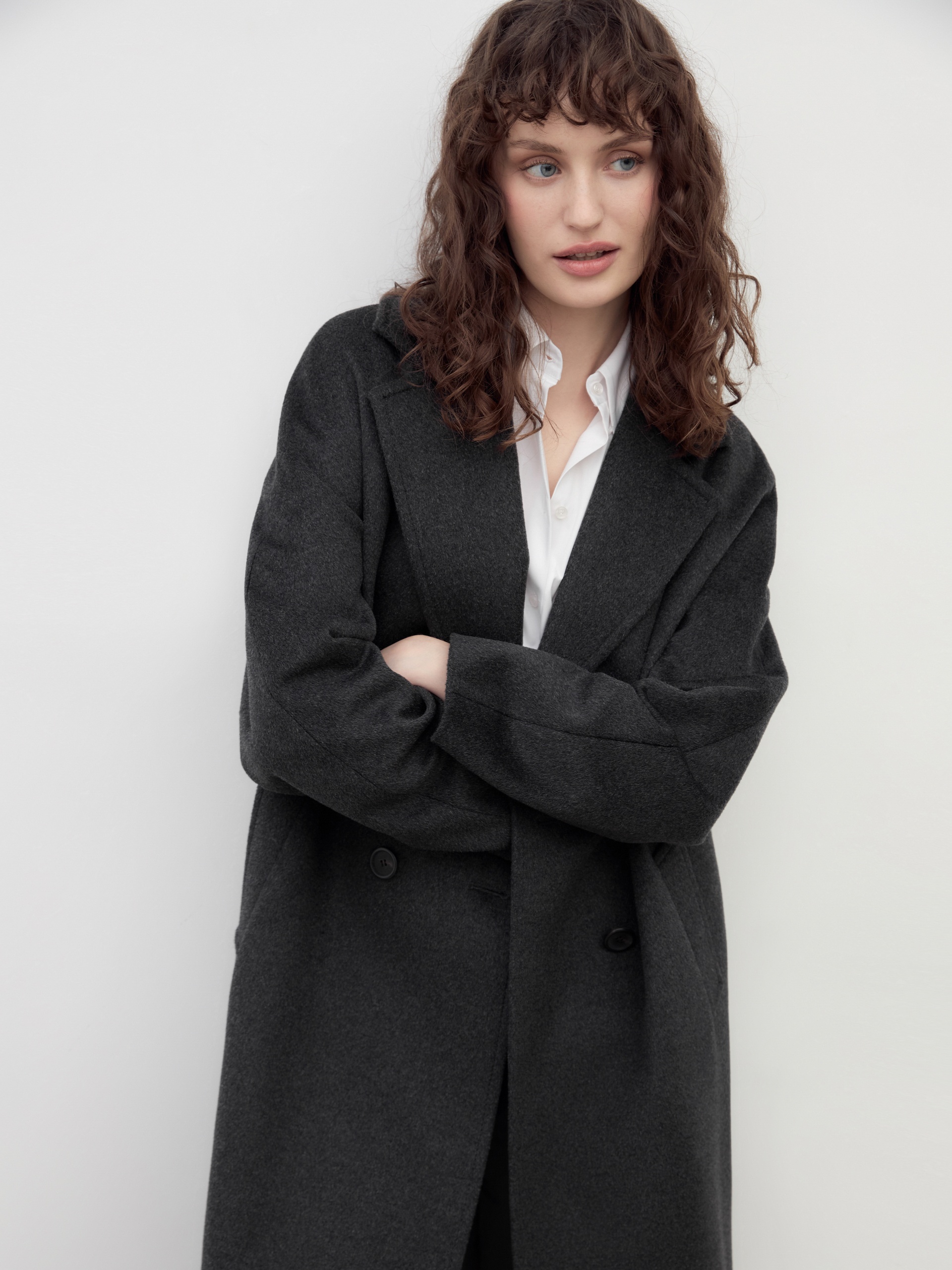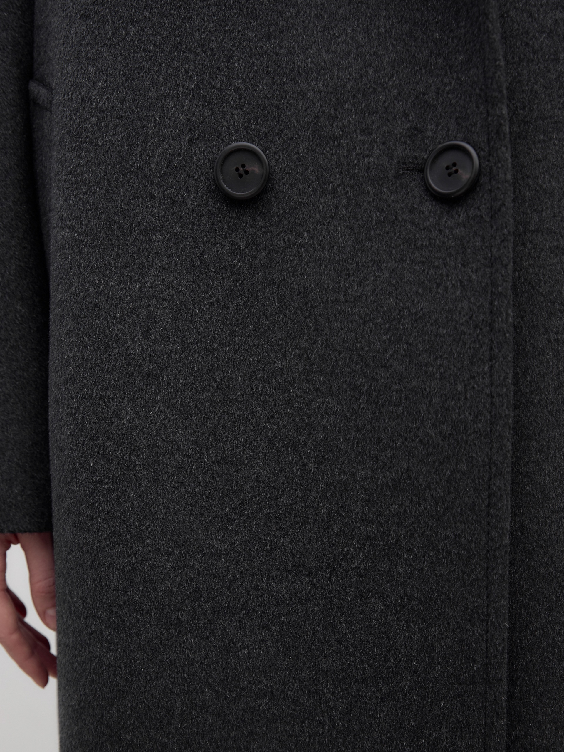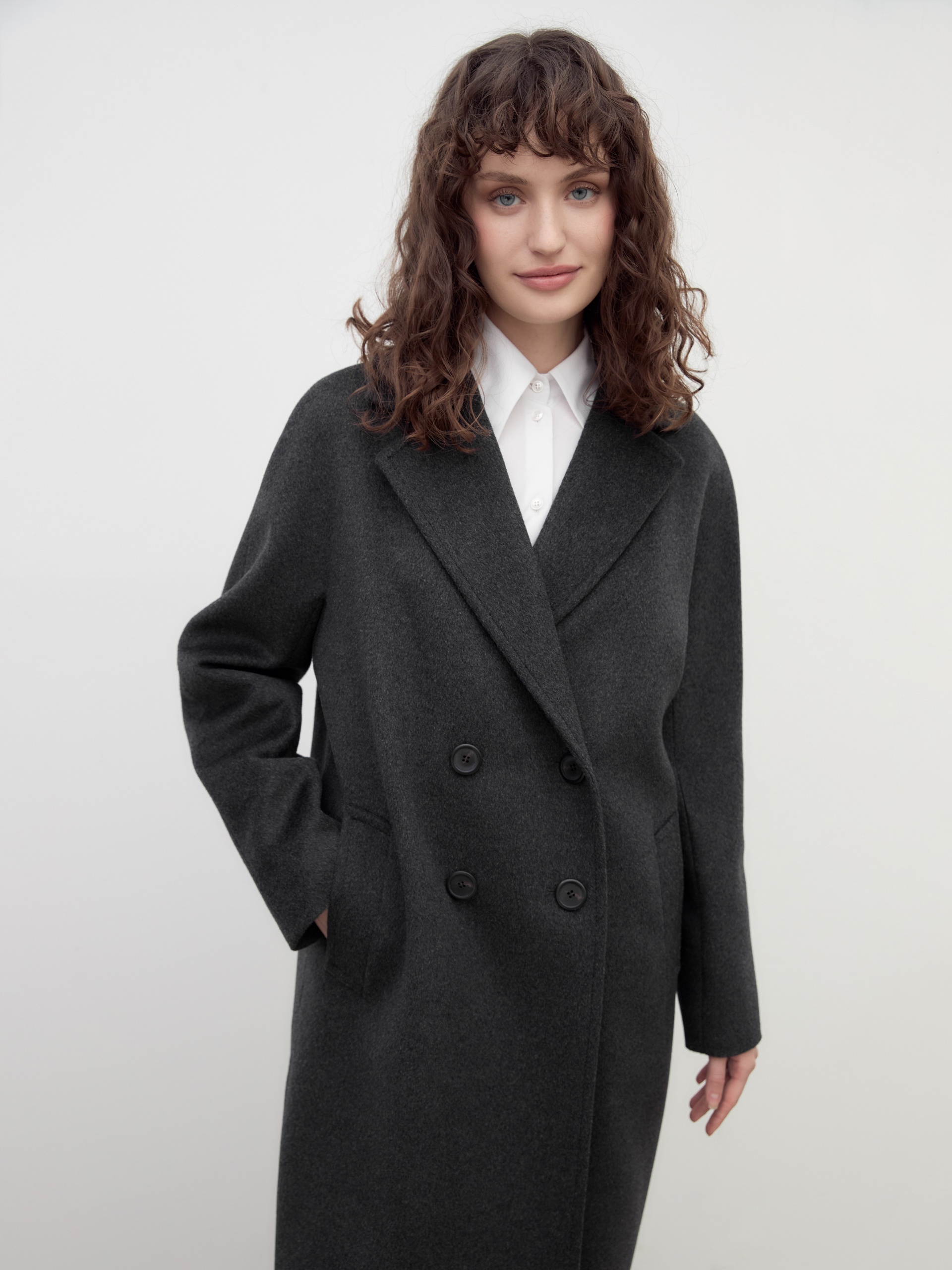 Двубортное пальто силуэта "удлиненный кокон" в благородном цвете темно-серый меланж. Пальто сшито из премиальной ворсовой ткани с высоким содержанием шерсти. Пальто имеет множество уникальных деталей: заведенные вперед боковые швы, объемный и мягкий силуэт, нетипичную линию английского воротника. Комбинированный рукав (цельнокроенный спереди и реглан на спинке) делает линию плеч мягкой и спокойной, не стесняет движений. Пальто универсальной длины ниже колена. Спинка имеет дополнительное утепление. Застежка на два ряда крупных темных пуговиц. В комплекте с пальто предлагается теплый капюшон из плащевой ткани с водонепроницаемым покрытием. Капюшон имеет новую легкую фурнитуру и мягкие стопора, которые не будут замерзать на холоде. Такой капюшон надежно защитит от осадков, а универсальный серый цвет позволит сочетать его и с другими пальто нашей коллекции. А для наилучшей защиты от непогоды пальто произведено с использованием высокотехнологичной мембраны RaftPro. Произведено в Санкт-Петербурге.