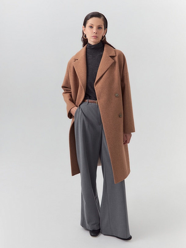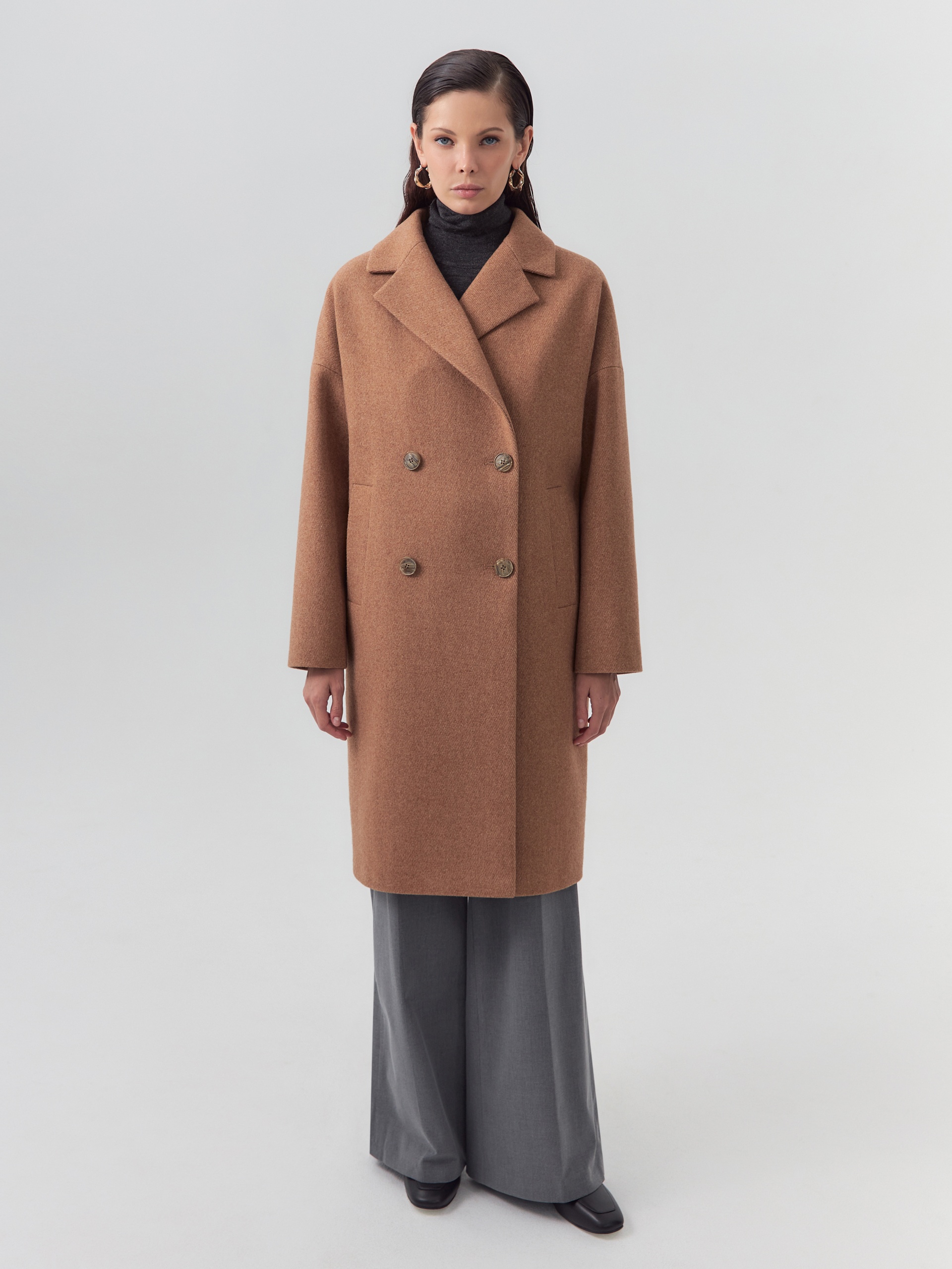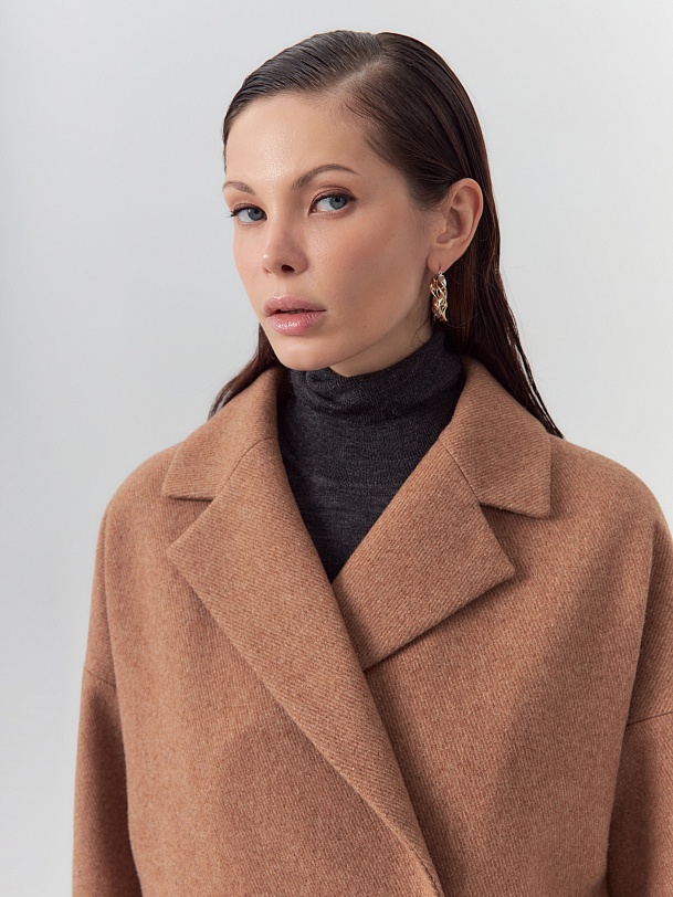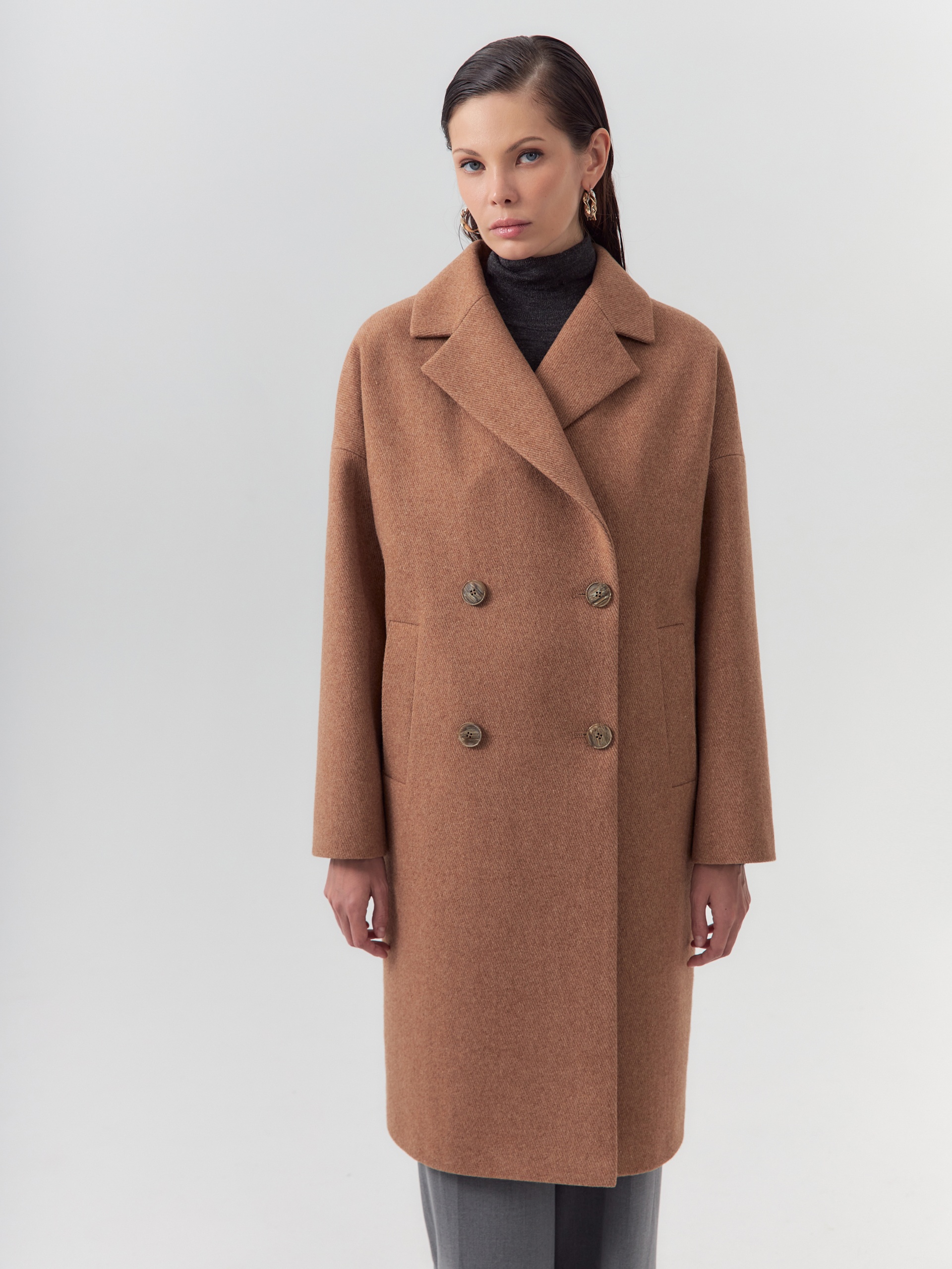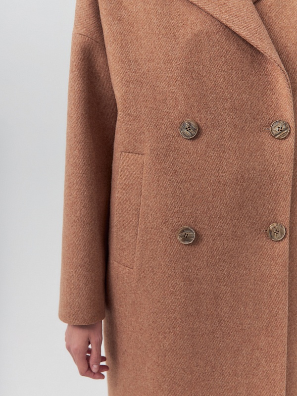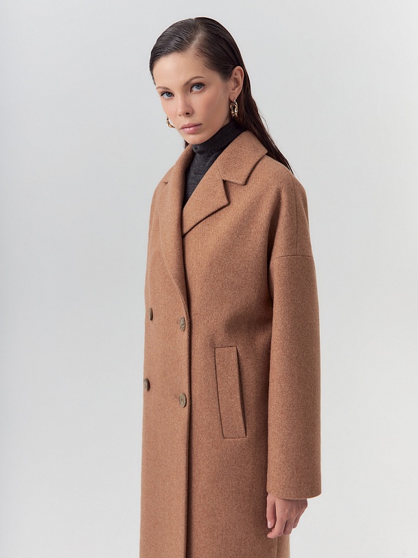 Двубортное пальто прямого силуэта из пальтовой ворсовой ткани с эффектом "диагональ" в карамельном цвете. Пальто имеет английский воротник, комфортный рубашечный рукав и оптимальную длину, закрывающую колено. По бокам располагаются вместительные карманы с листочками. Застежка на два ряда стильных крупных пуговиц. Спинка пальто имеет дополнительное утепление. А для наилучшей защиты от непогоды пальто произведено с использованием высокотехнологичной мембраны RaftPro. Произведено в Санкт-Петербурге.