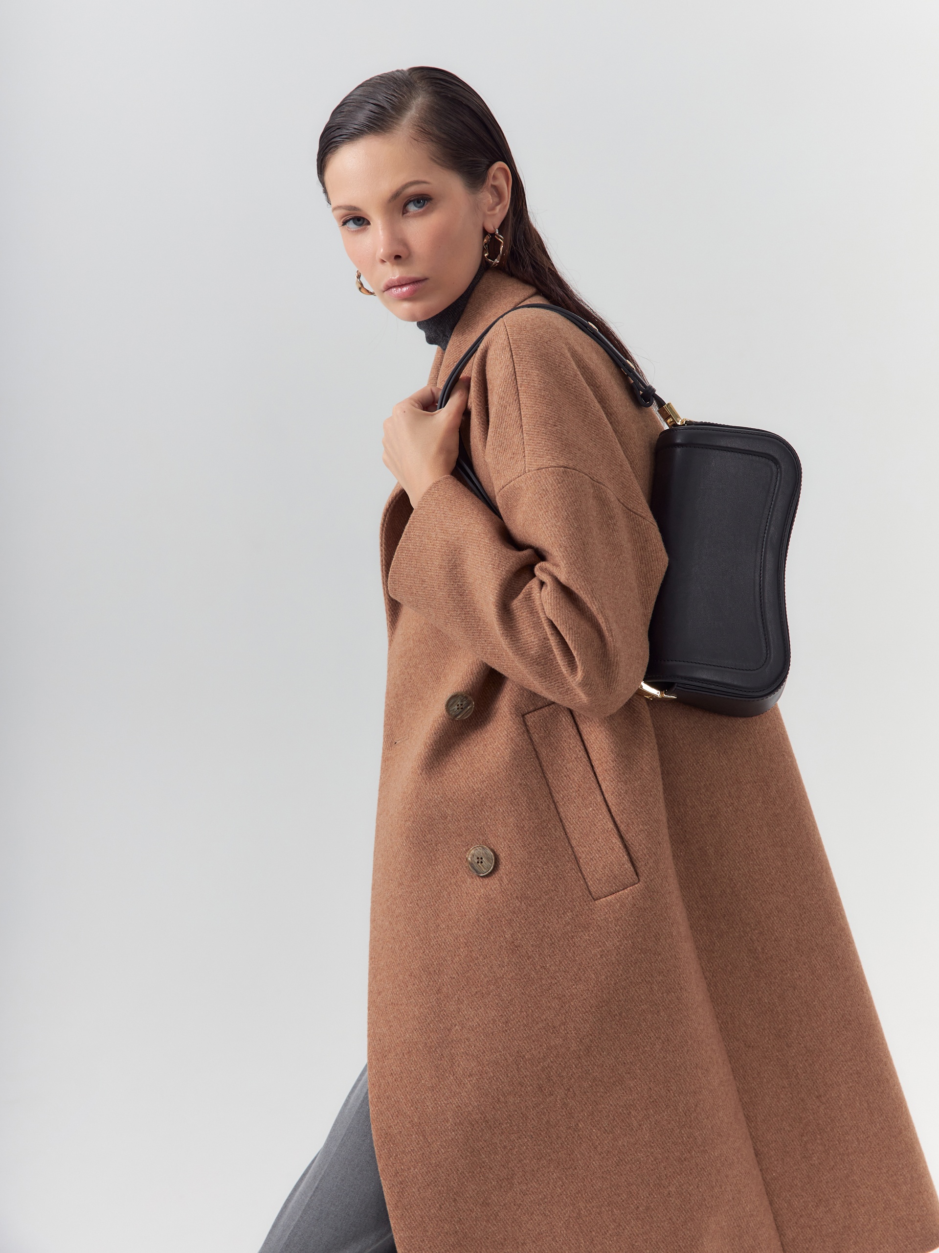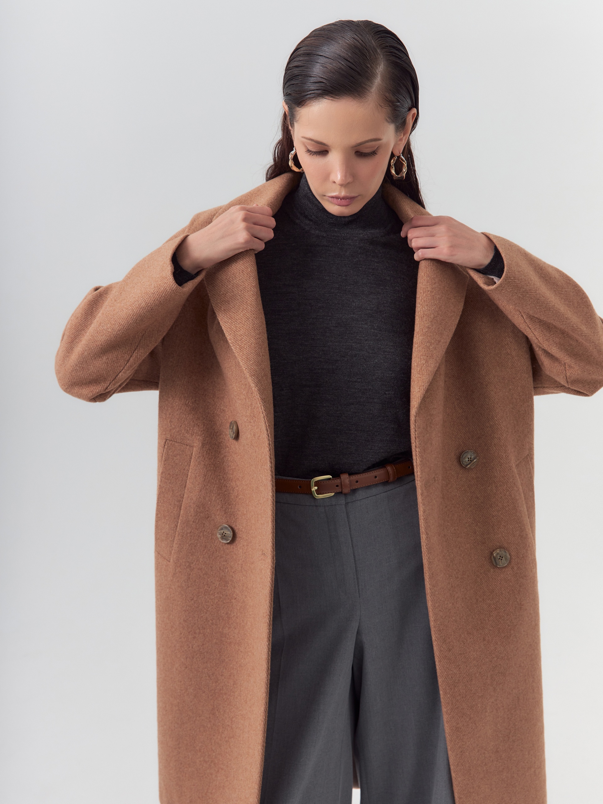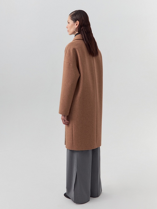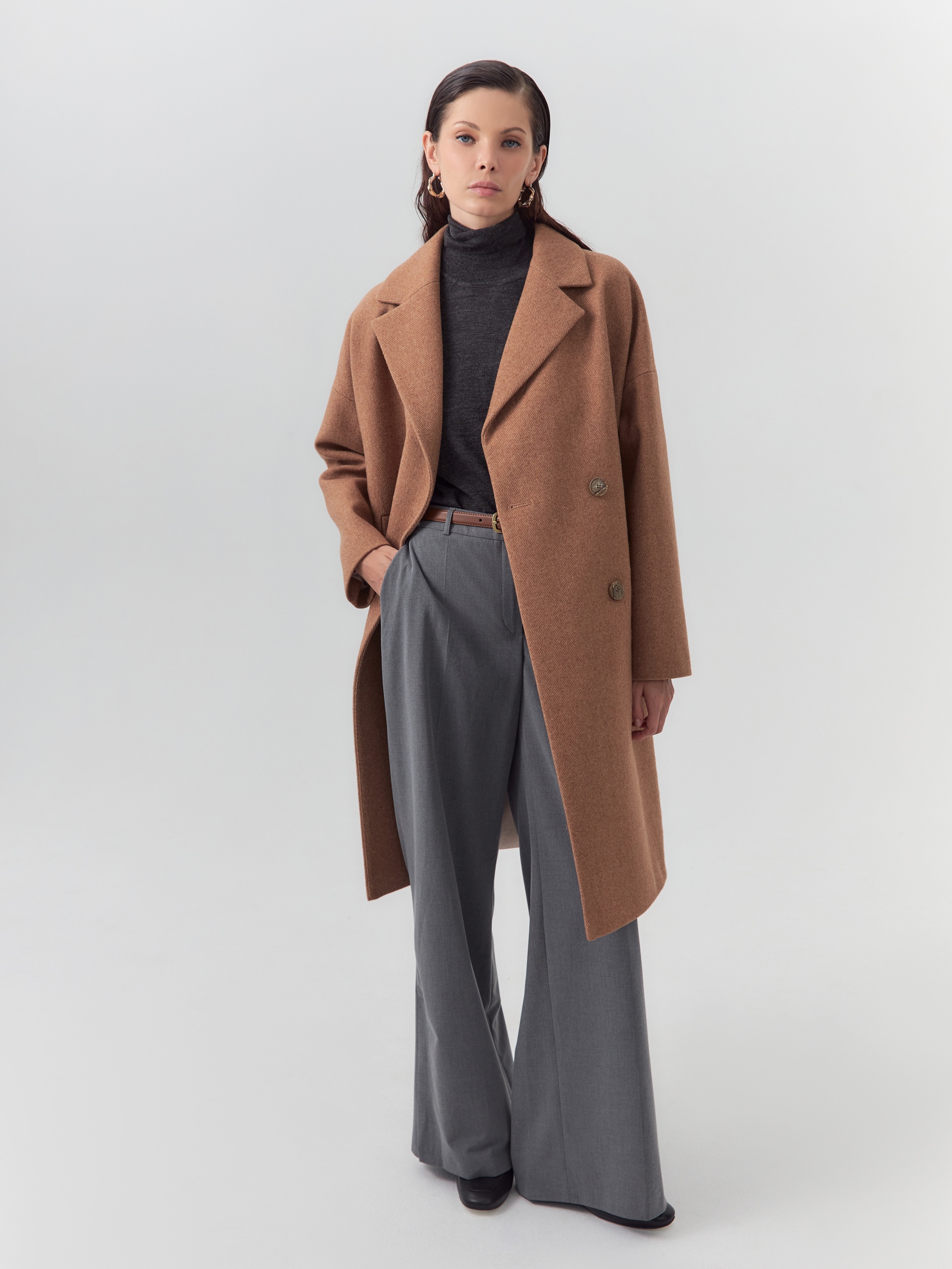 Двубортное пальто прямого силуэта из пальтовой ворсовой ткани с эффектом "диагональ" в карамельном цвете. Пальто имеет английский воротник, комфортный рубашечный рукав и оптимальную длину, закрывающую колено. По бокам располагаются вместительные карманы с листочками. Застежка на два ряда стильных крупных пуговиц. Спинка пальто имеет дополнительное утепление. А для наилучшей защиты от непогоды пальто произведено с использованием высокотехнологичной мембраны RaftPro. Произведено в Санкт-Петербурге.