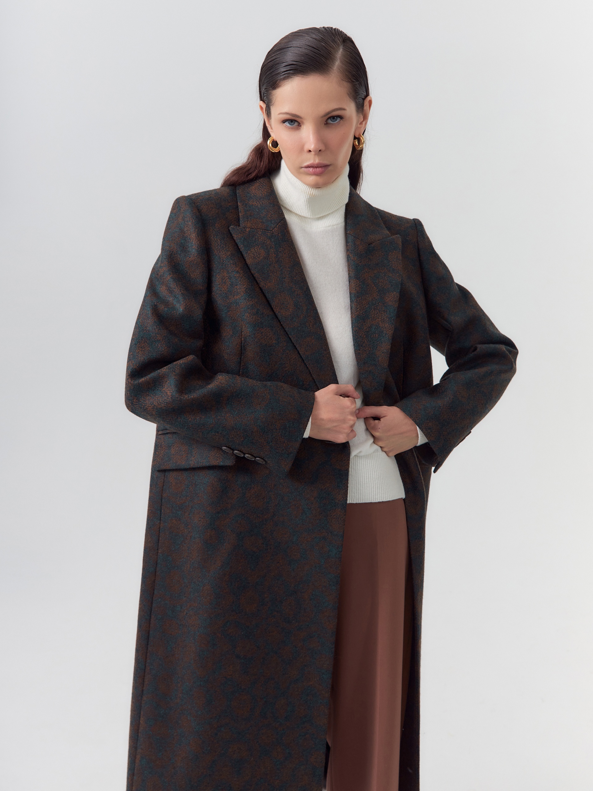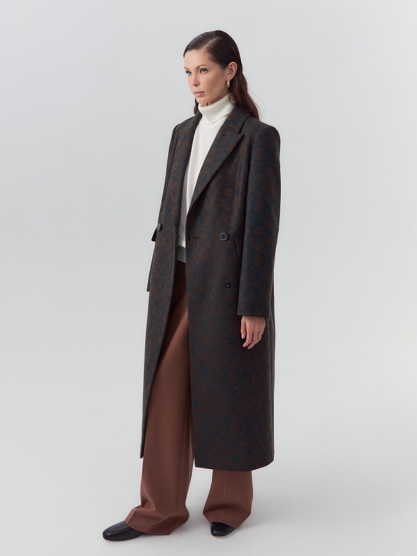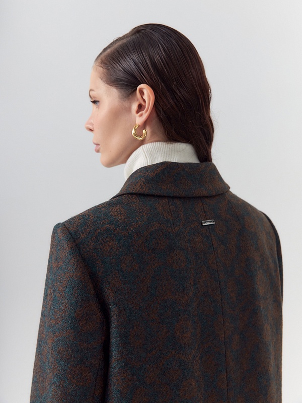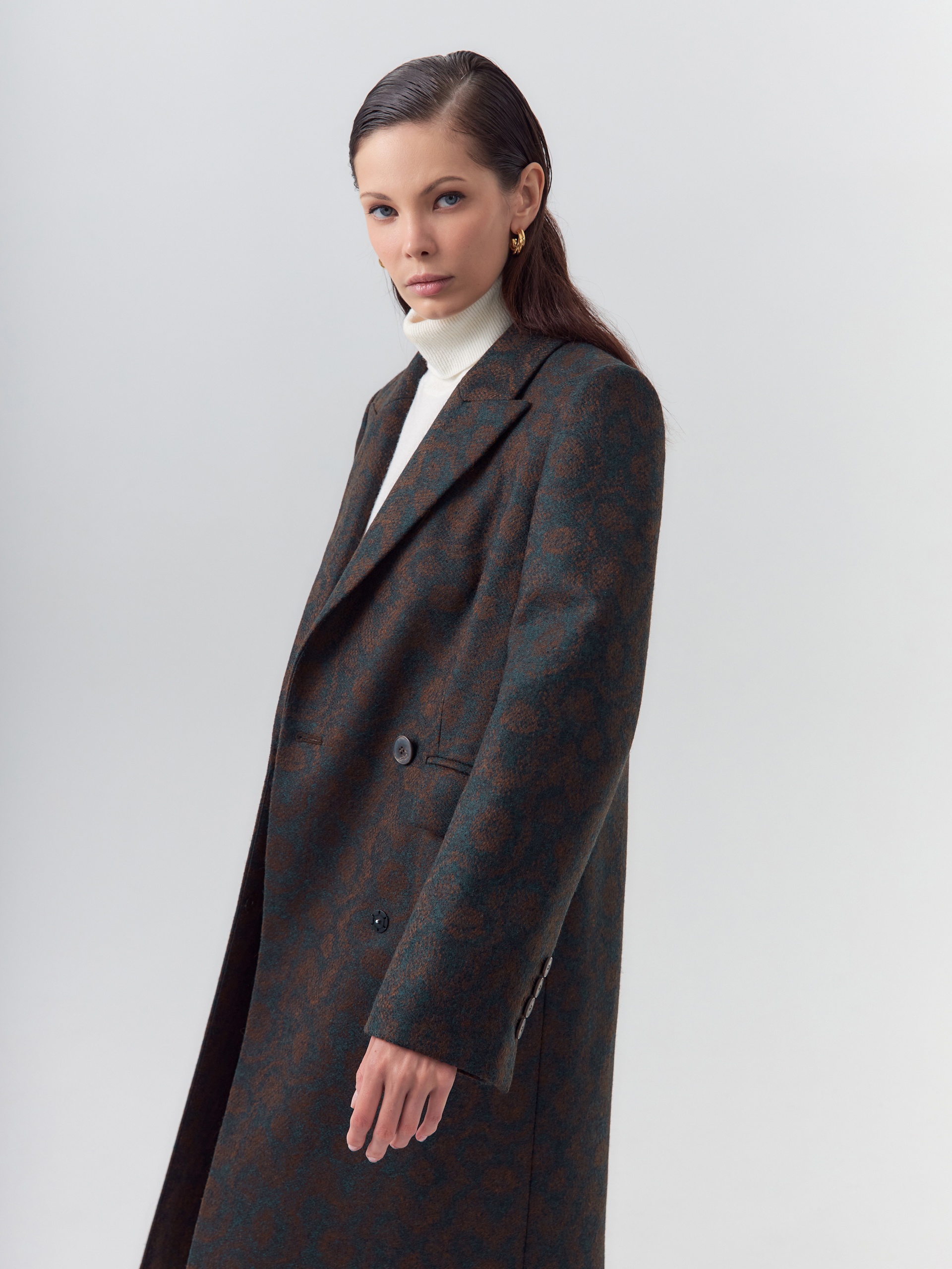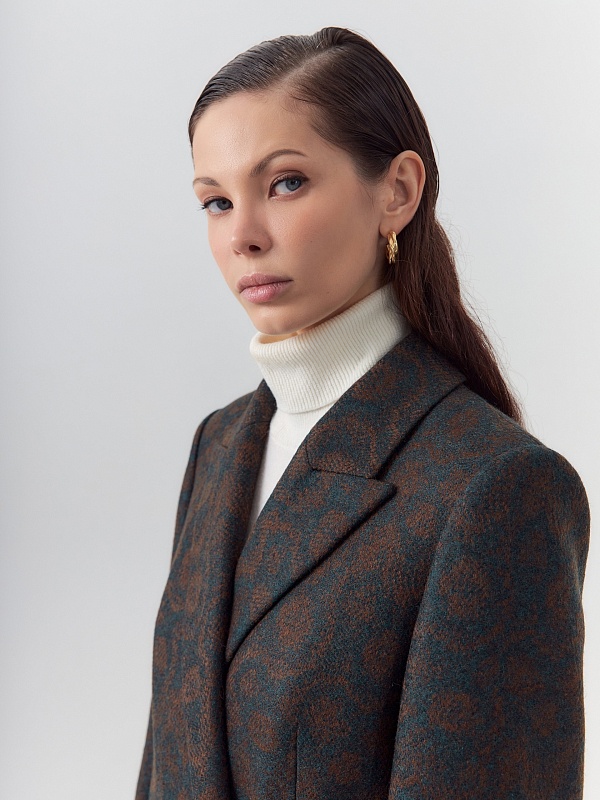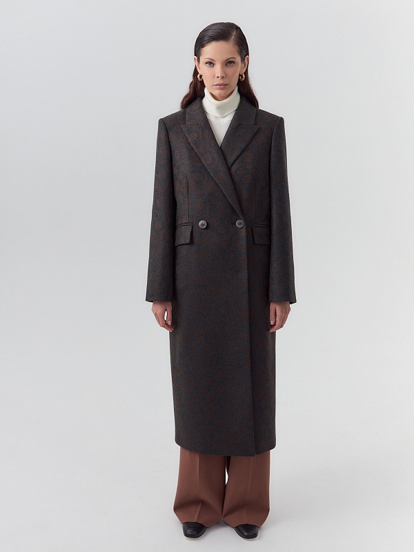 Классическое двубортное пальто прямого силуэта из твидовой ткани остромодной расцветки "изумрудно-коричневый леопард". Пальто сшито из премиальной ткани с высоким содержанием шерсти. Пальто имеет удобный втачной рукав с застёжкой по низу рукава, и английский воротник новой формы с заострёнными концами воротника. По бокам располагаются карманы с клапанами. Застёжка на два ряда крупных пуговиц. Для наилучшей защиты от непогоды изделие выполнено с использованием высокотехнологичной мембраны RaftPro, а спинка пальто имеет дополнительное утепление. Произведено в Санкт-Петербурге.