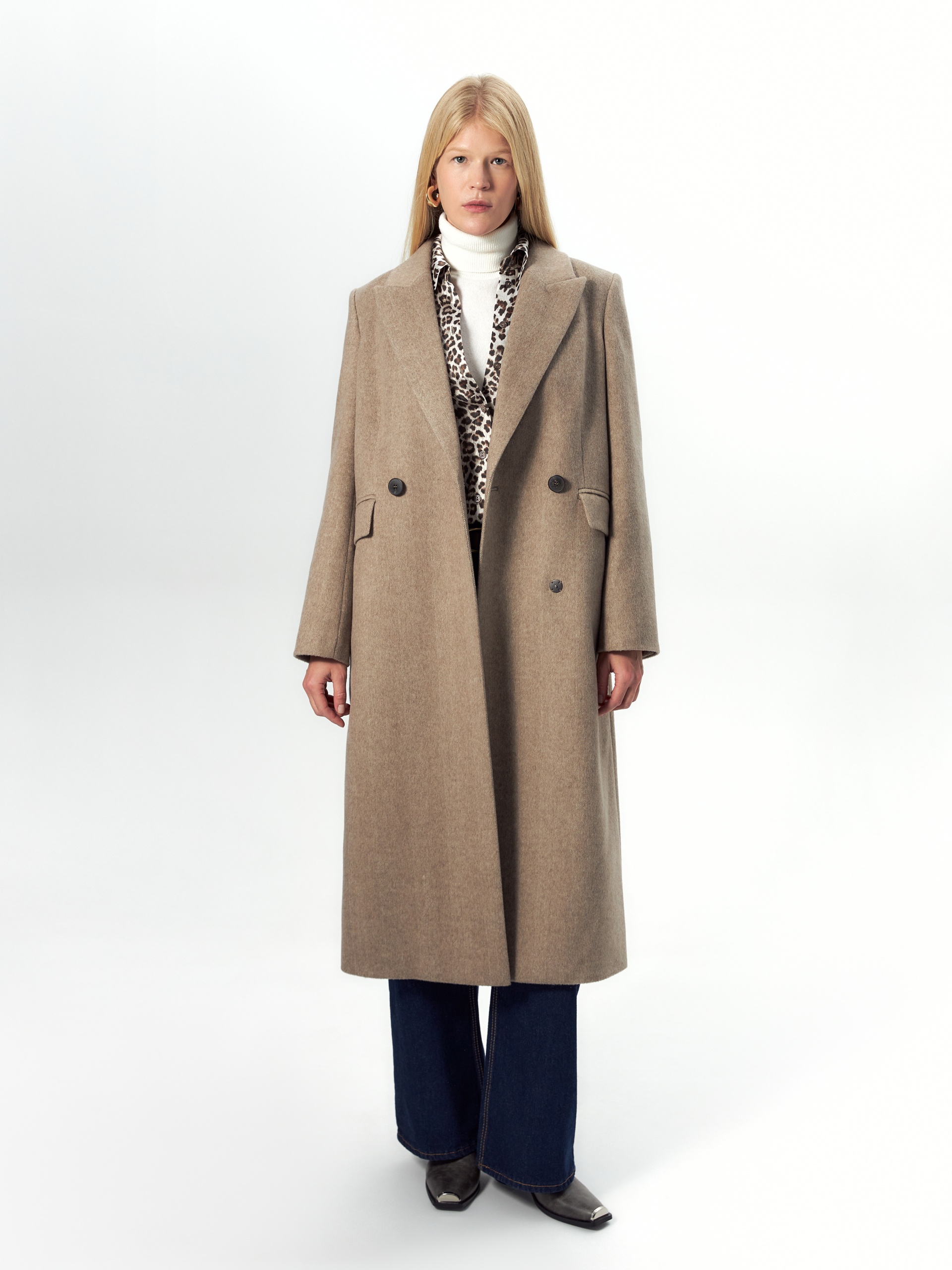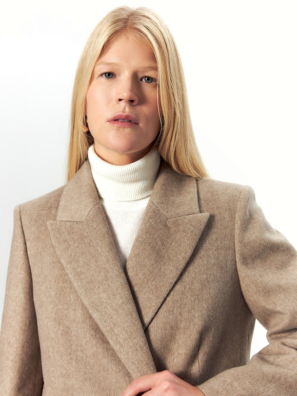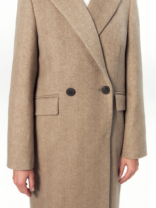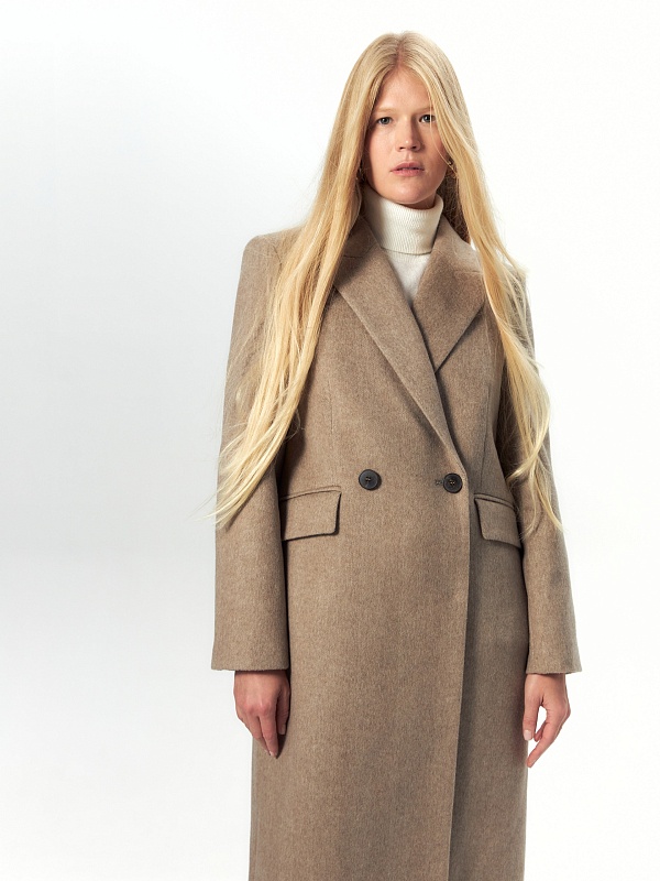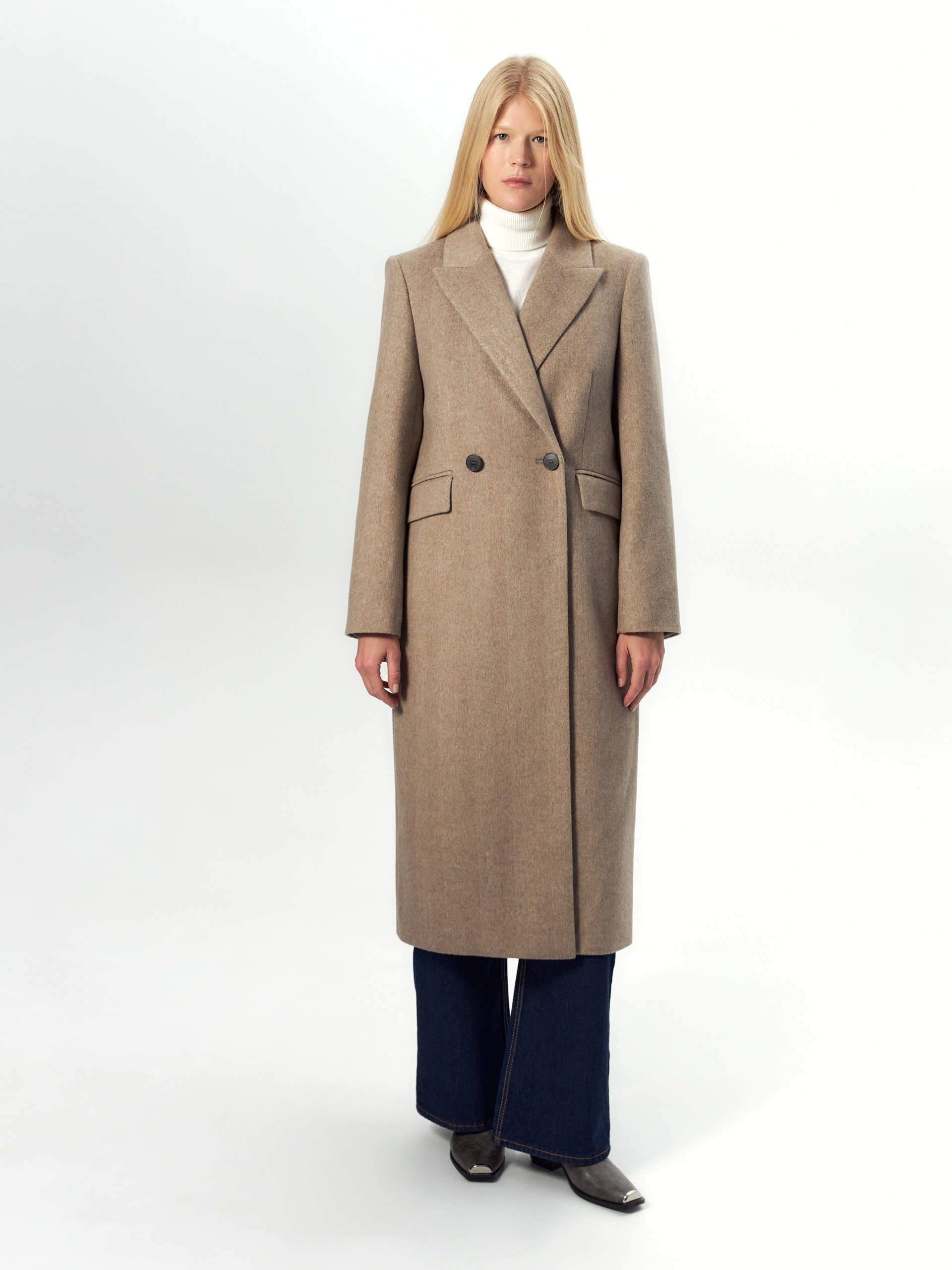 Классическое двубортное пальто прямого силуэта из ворсовой ткани в цвете темно-бежевая елка. Пальто сшито из премиальной ткани с высоким содержанием шерсти. Пальто имеет удобный втачной рукав с застёжкой по низу рукава, и английский воротник новой формы с заострёнными концами воротника. По бокам располагаются карманы с клапанами. Застёжка на два ряда крупных пуговиц. Для наилучшей защиты от непогоды изделие выполнено с использованием высокотехнологичной мембраны RaftPro, а спинка пальто имеет дополнительное утепление. Произведено в Санкт-Петербурге.