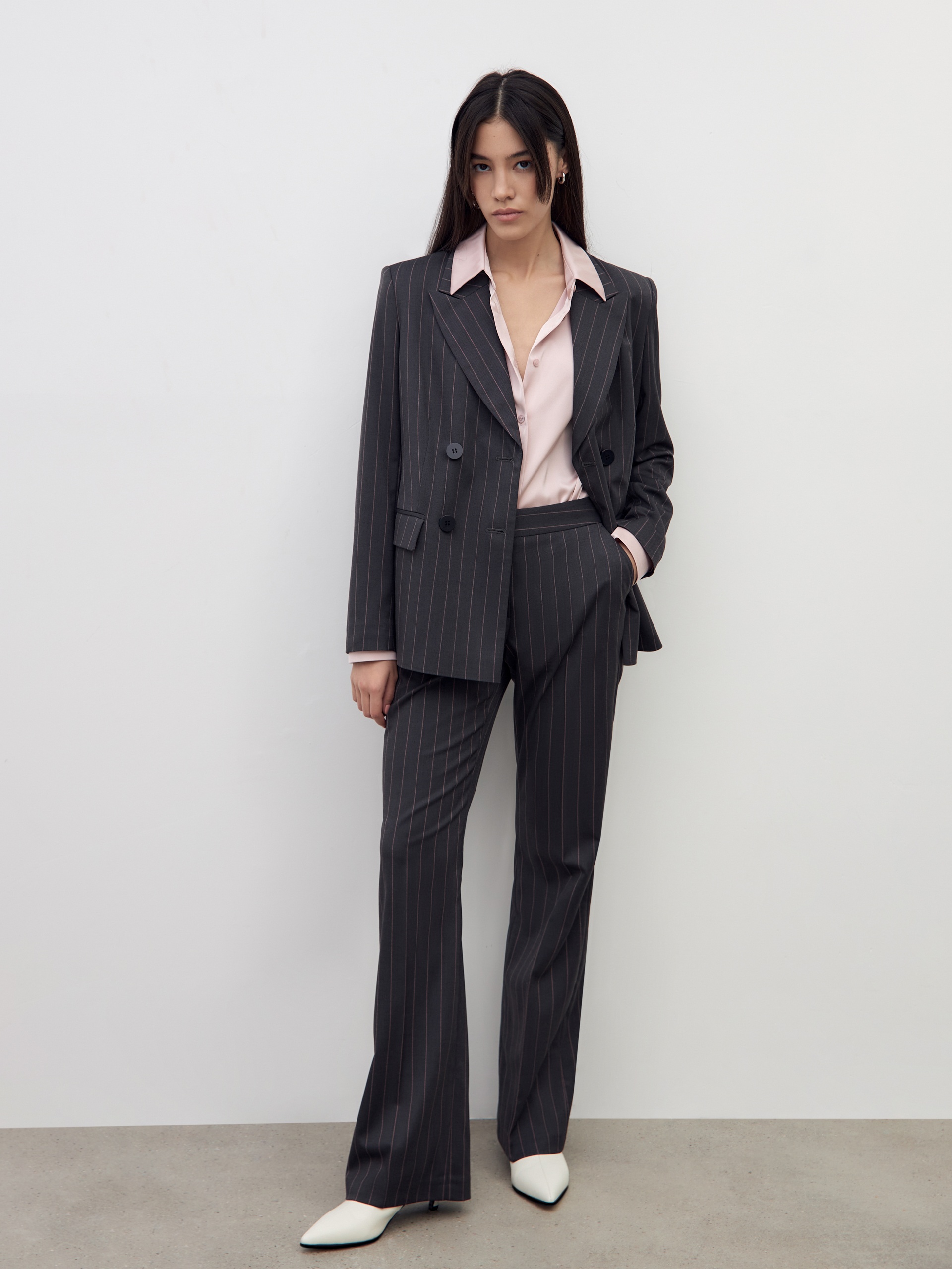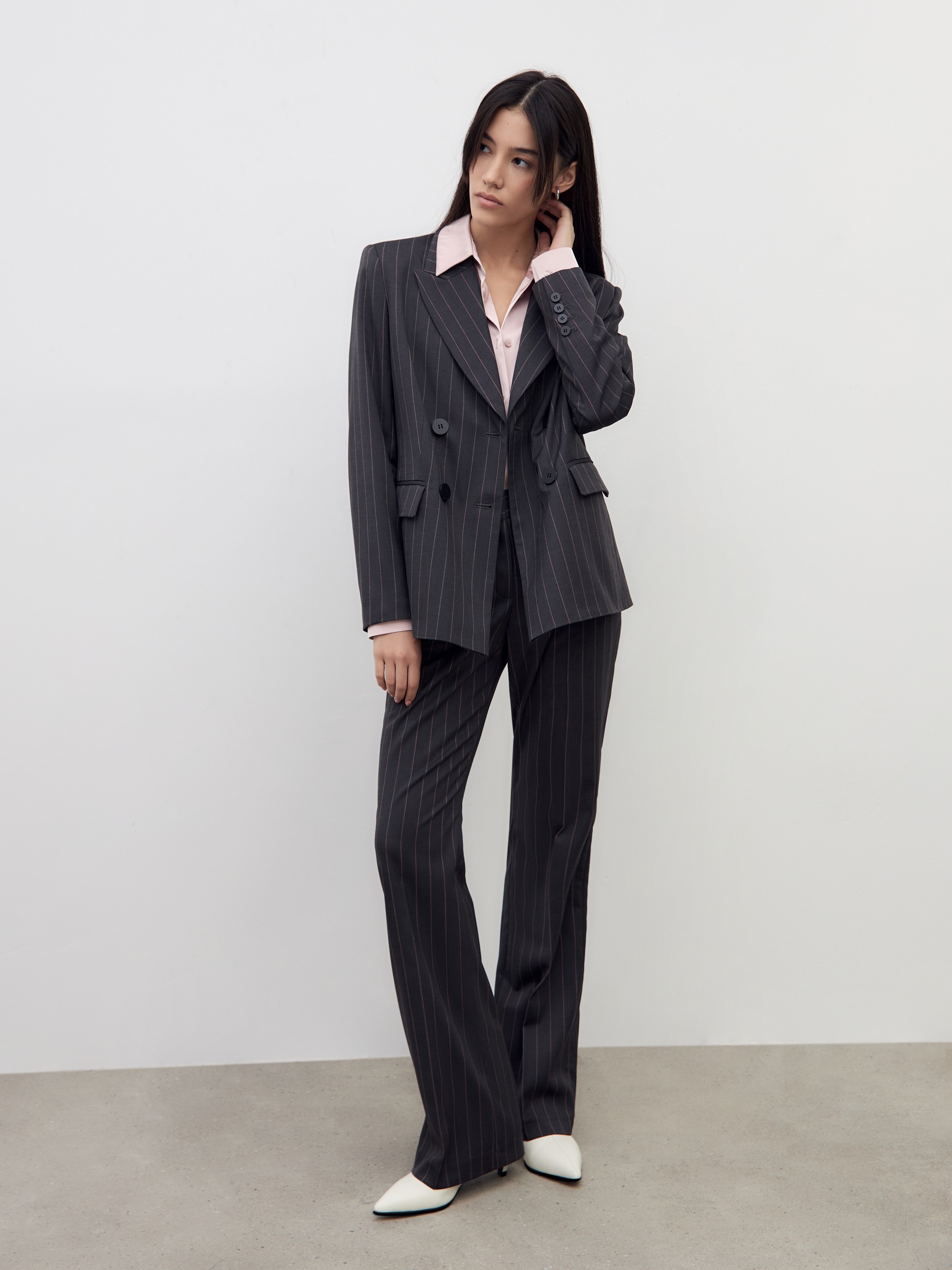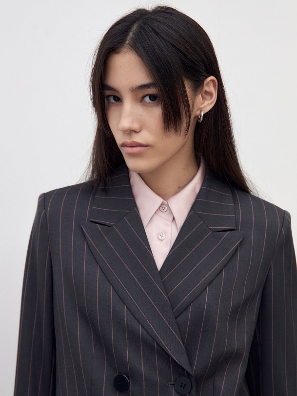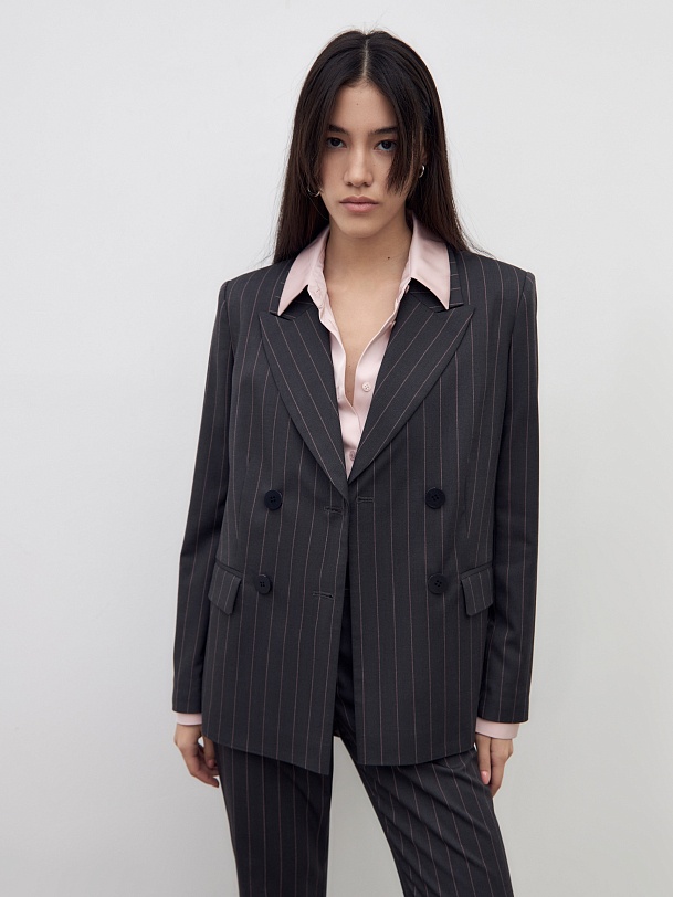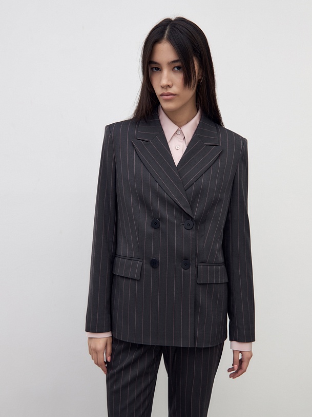 Прямой жакет в мужском стиле из костюмной ткани в тонкую и редкую розовую полоску. Жакет двубортный с классическим английским воротником на 6 пуговицах. Спереди прорезной карман и клапан. Рукава полной длины. Жакет на подкладке. В комплекте с прямыми брюками из одной ткани, комплект будет идеально смотреться в офисе.