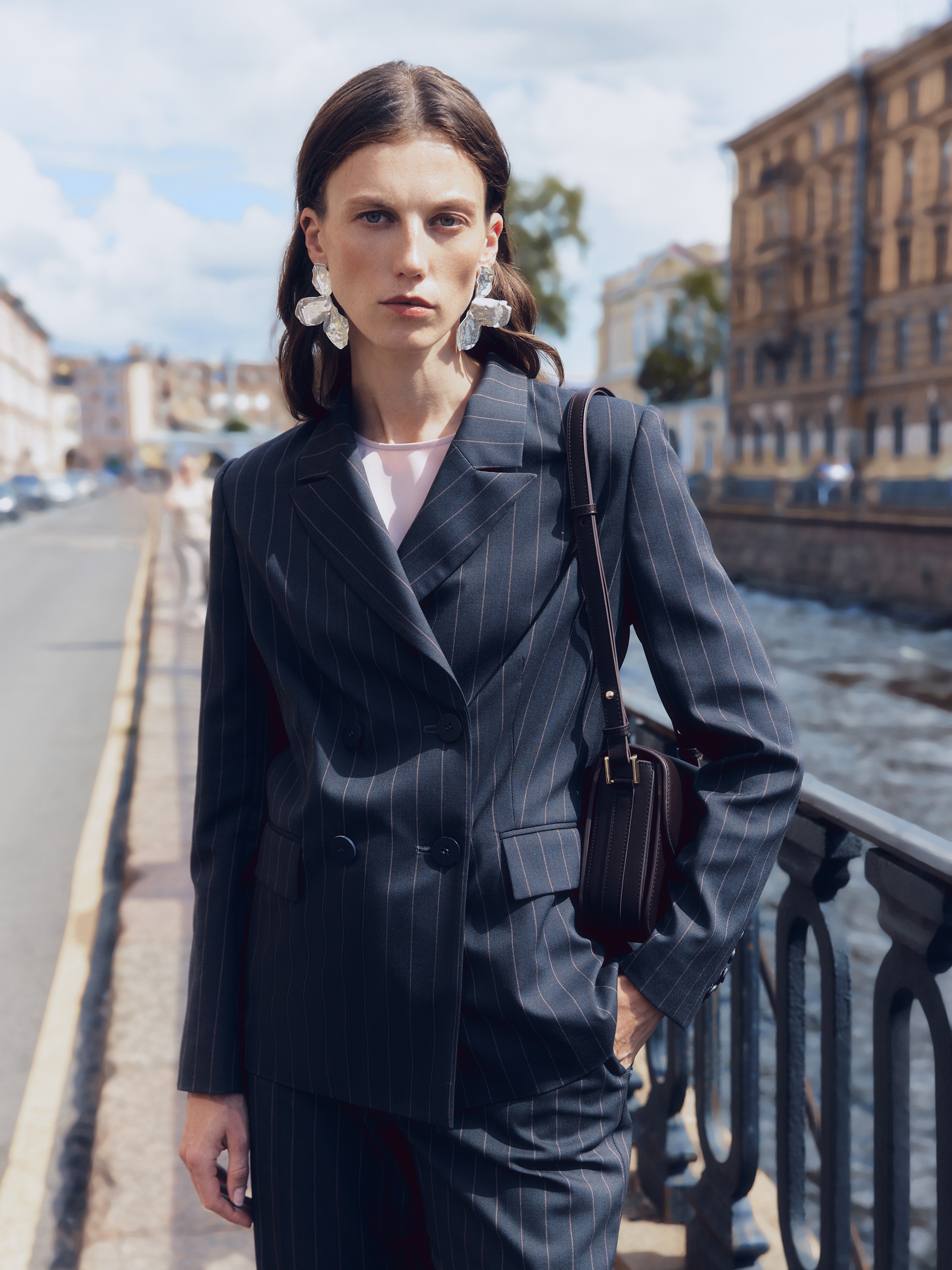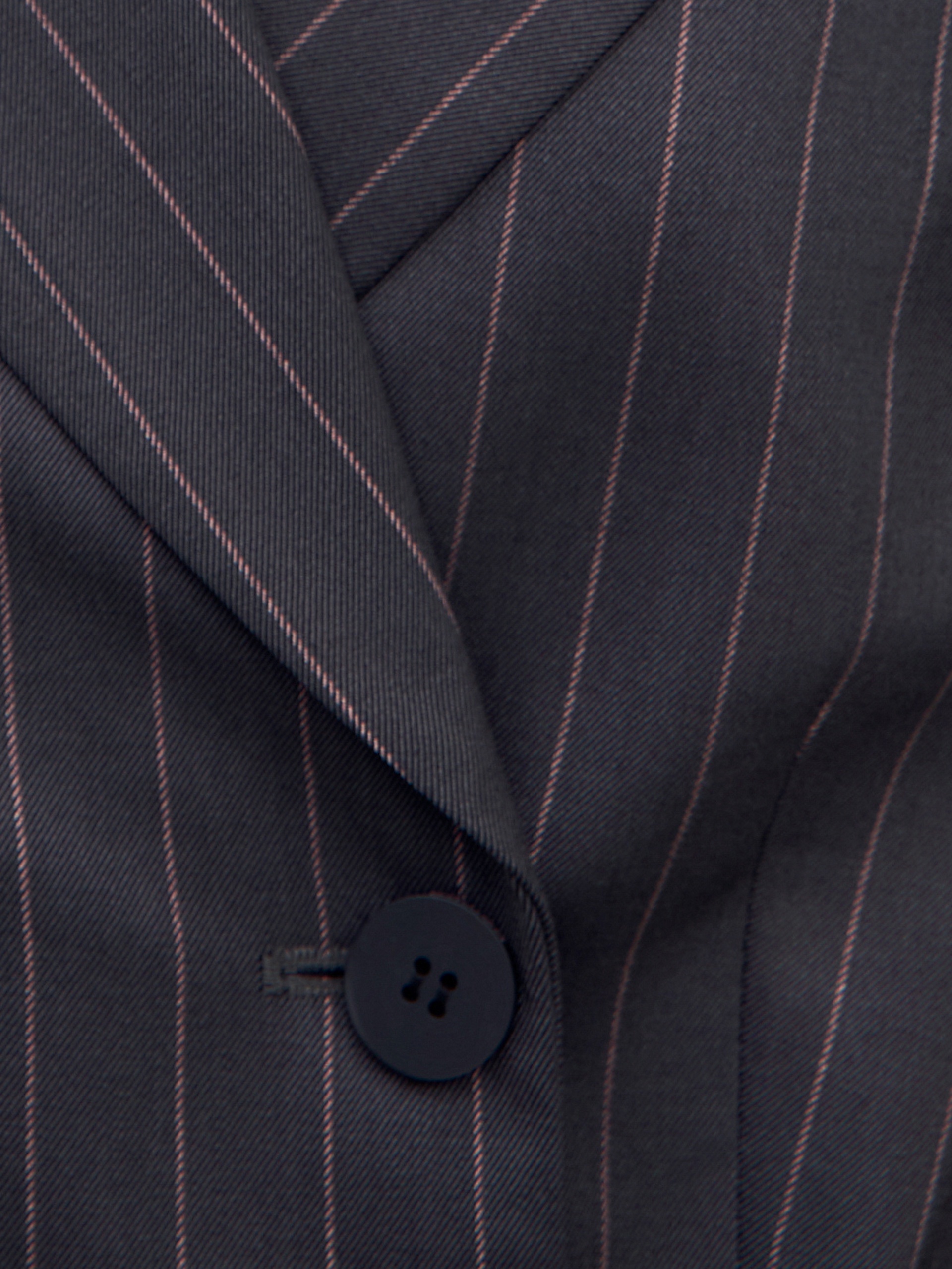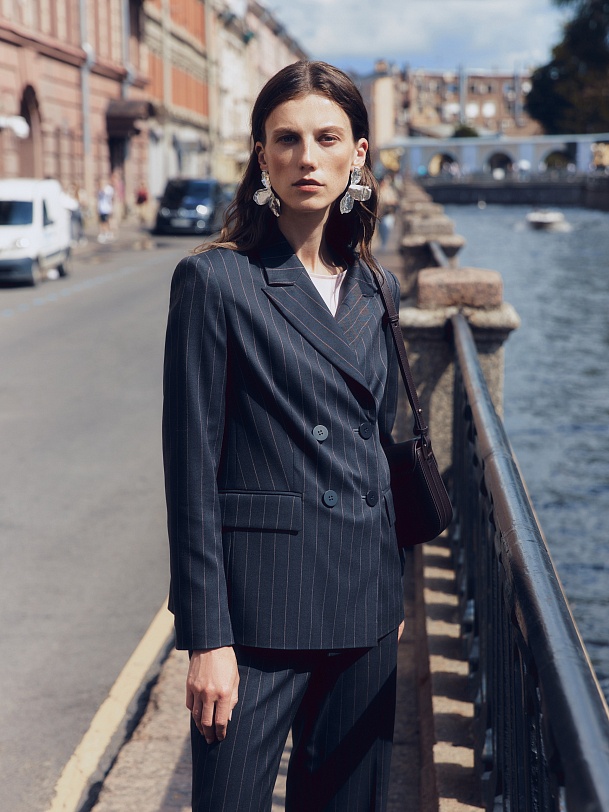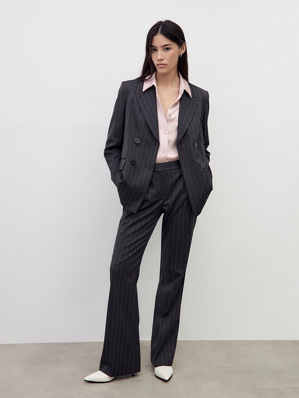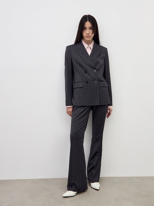 Прямой жакет в мужском стиле из костюмной ткани в тонкую и редкую розовую полоску. Жакет двубортный с классическим английским воротником на 6 пуговицах. Спереди прорезной карман и клапан. Рукава полной длины. Жакет на подкладке. В комплекте с прямыми брюками из одной ткани, комплект будет идеально смотреться в офисе.