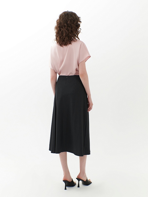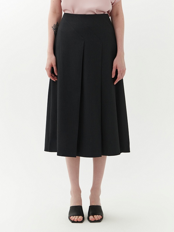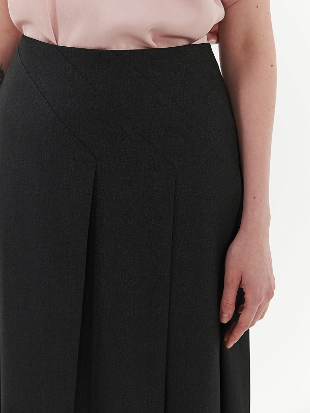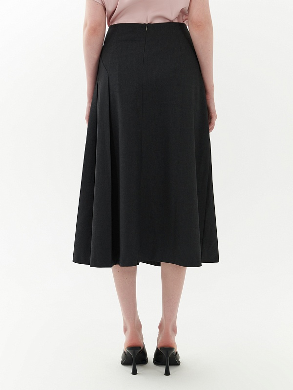 Юбка расклешенная с разрезами и складками для лучшей посадки на бедрах. Юбка выполнена из костюмной ткани темно-серого цвета с потайной молнией на спинке. Юбка имеет асимметричный крой и станет новым решением в вашем гардеробе.