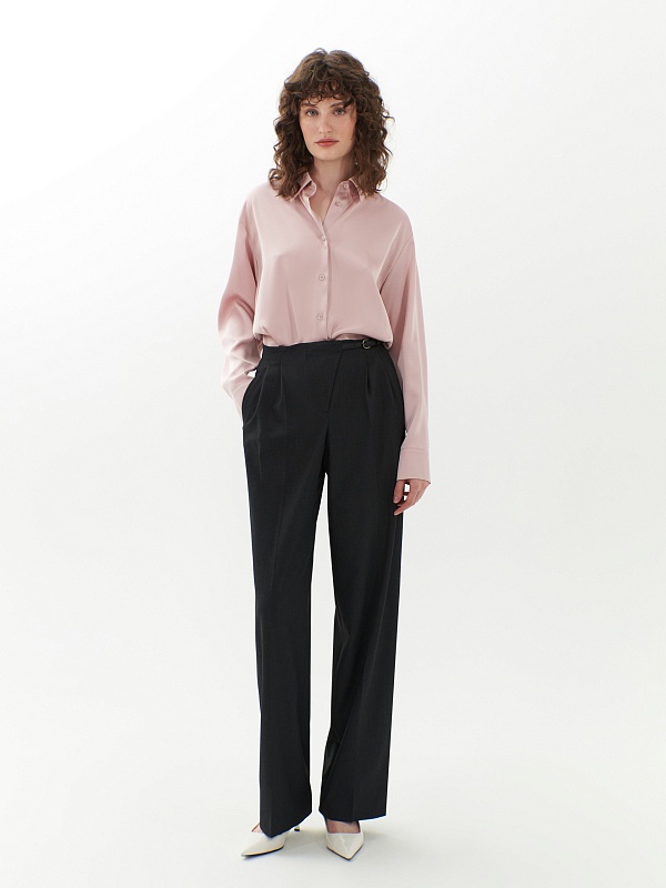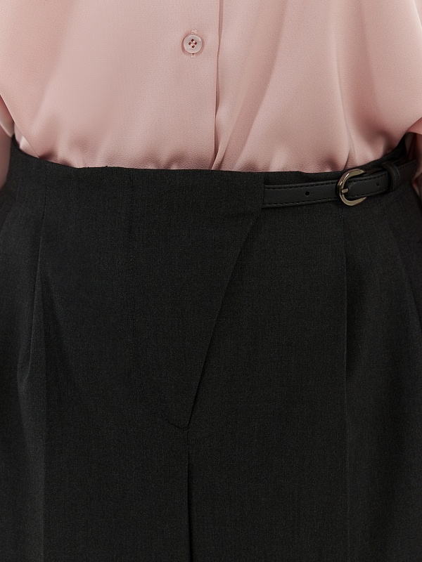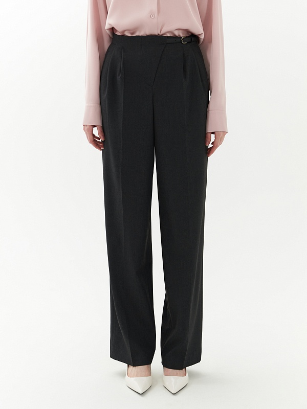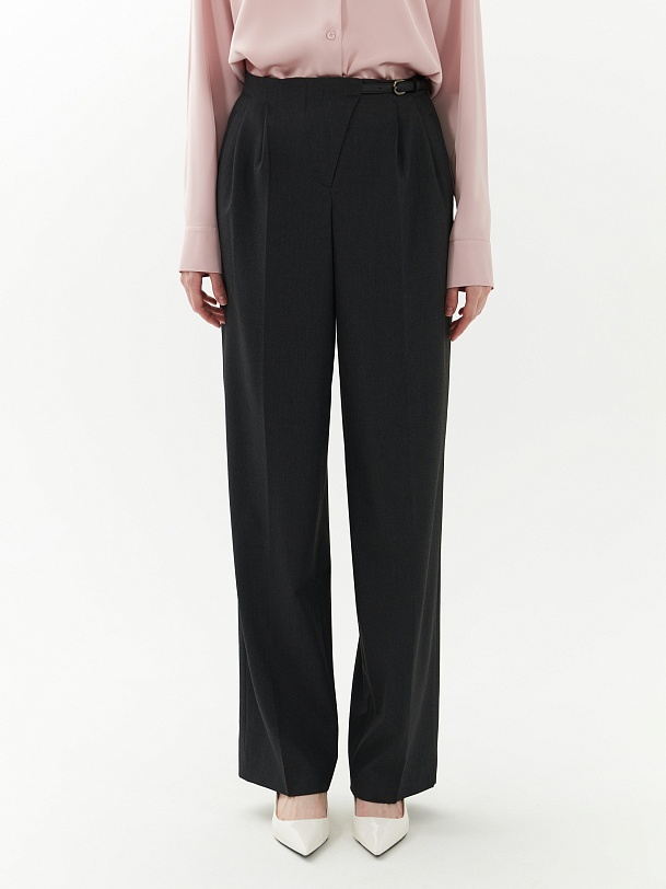 Широкие брюки на средней посадке с асимметричным гульфиком и складками. На поясе есть хлястик который соединяет гульфик и боковой шов пояса. Карманы прорезные листочки. На спинке два прорезных кармана.