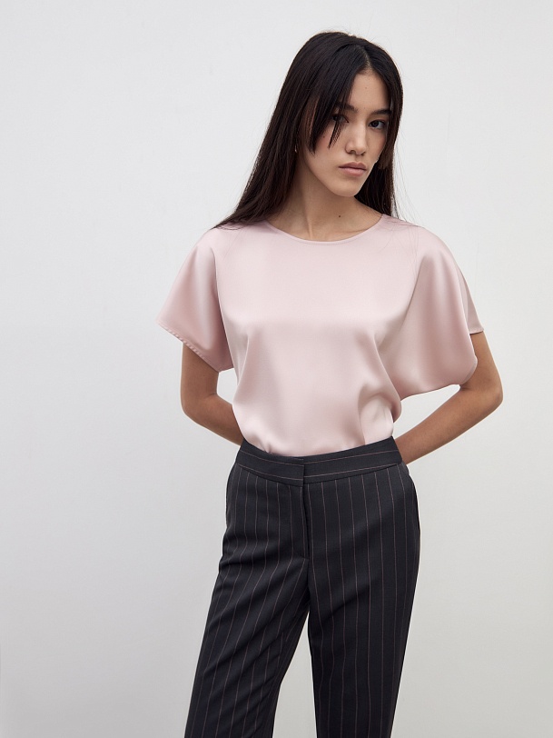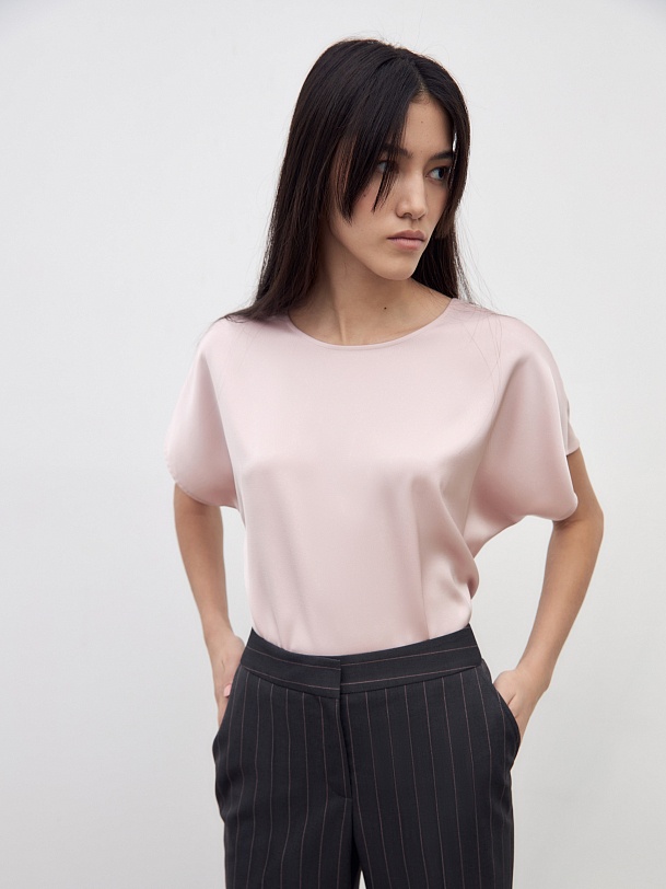 Классическая прямая блуза из блузочной атласной ткани в пепельно розовом цвете с горловиной лодочкой.