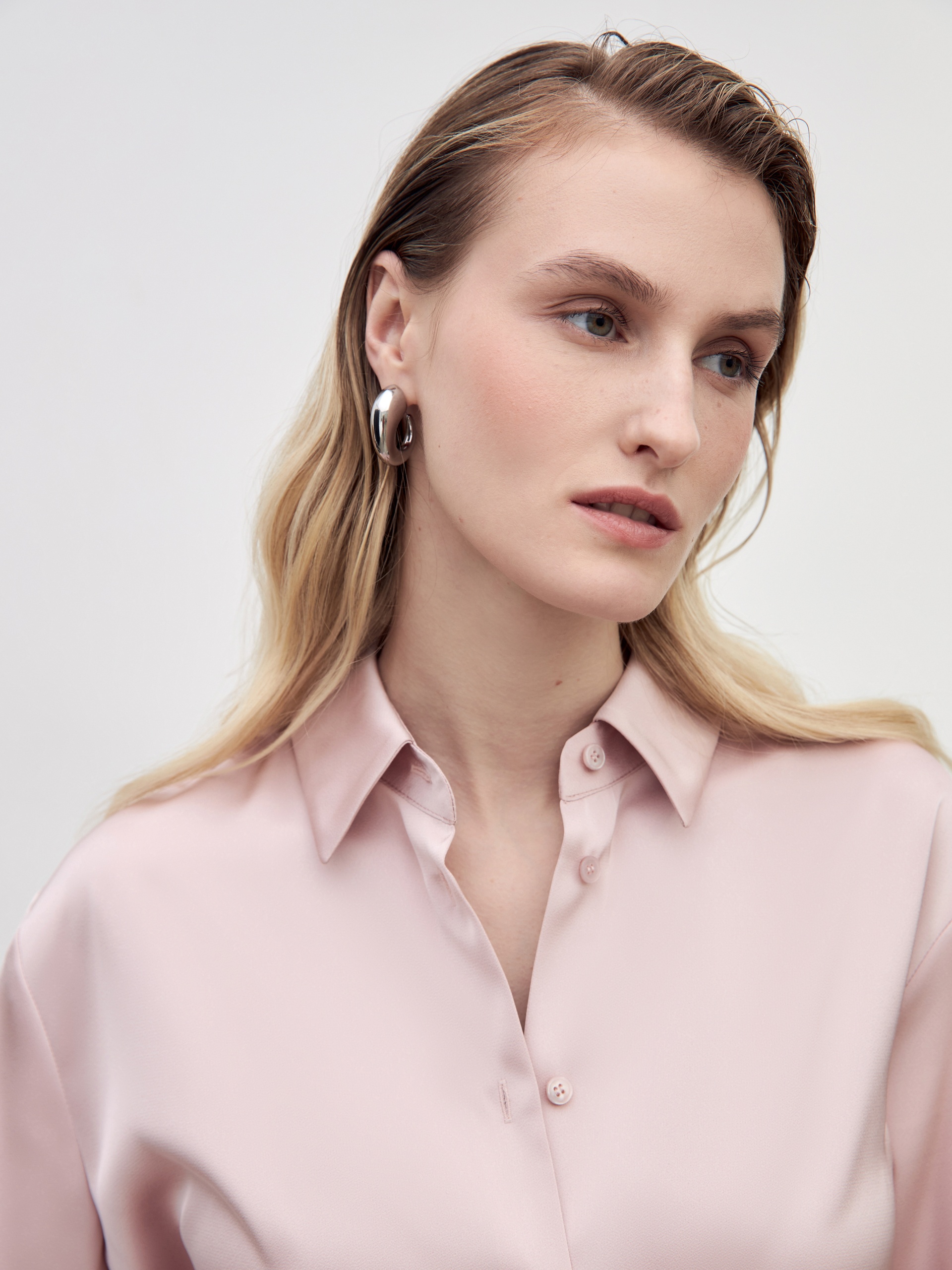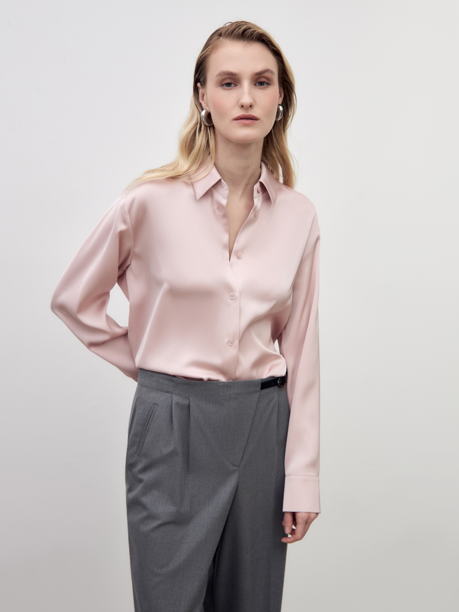 Свободная блуза из атласной ткани пепельно розового цвета с отложным воротником и спущенным плечом. На спинке кокетка со складками под ней. Блуза с прямым краем по низу, с разрезами по бокам.