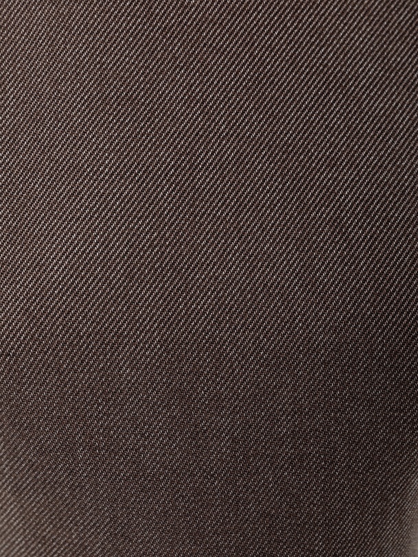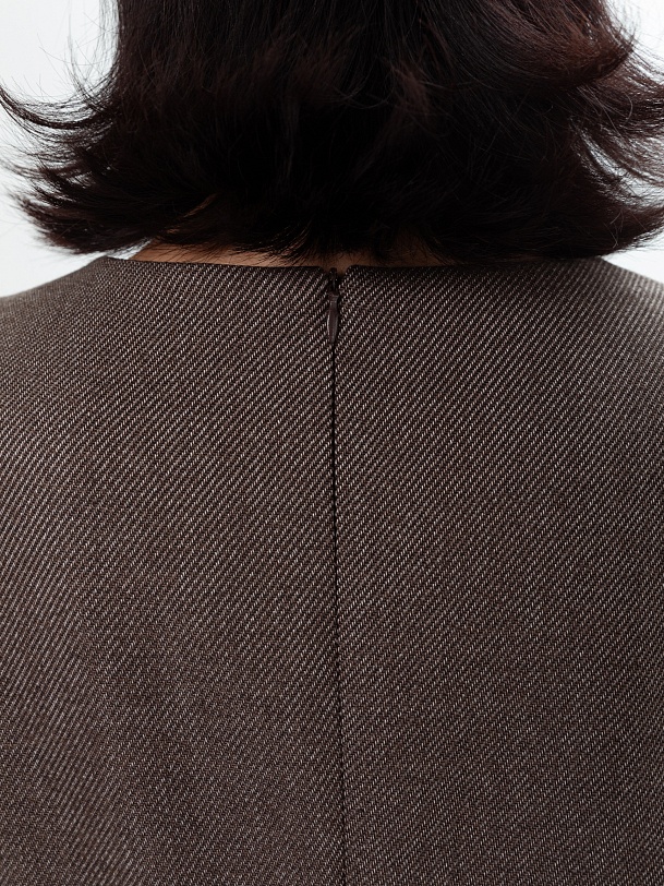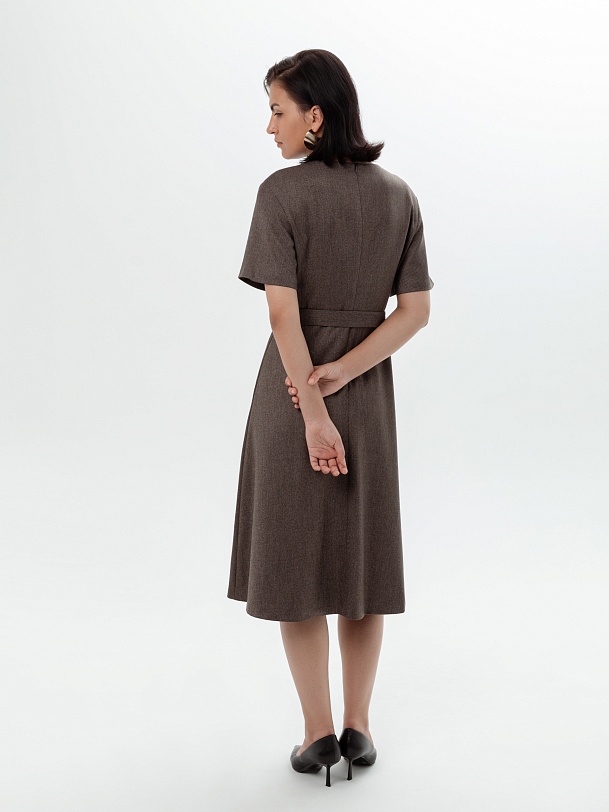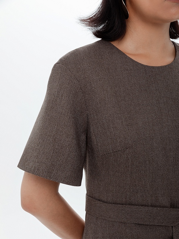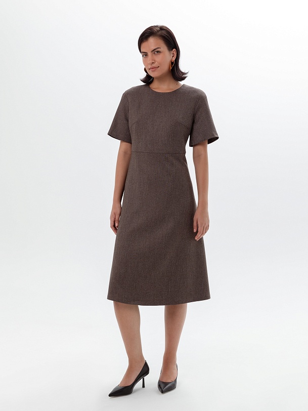 Приталенное платье из костюмной ткани с диагональю шоколадного цвета. Платье отрезное по линии талии с расклешенной юбкой миди, в комплект входит пояс из основной ткани. Широкий рукав до локтя. Круглая горловина выреза. На спинке потайная застежка молнии, платье на подкладке. Платье с белой классической рубашкой составит трендовый образ осени.
