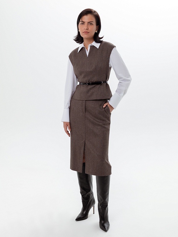 Классическая зауженная юбка на притачном поясе с гульфиком и пуговицей по переду. Юбка длинной за колена из костюмной ткани с диагональю шоколадного цвета. Имеют два функциональных кармана по бокам и шлицой по переду.