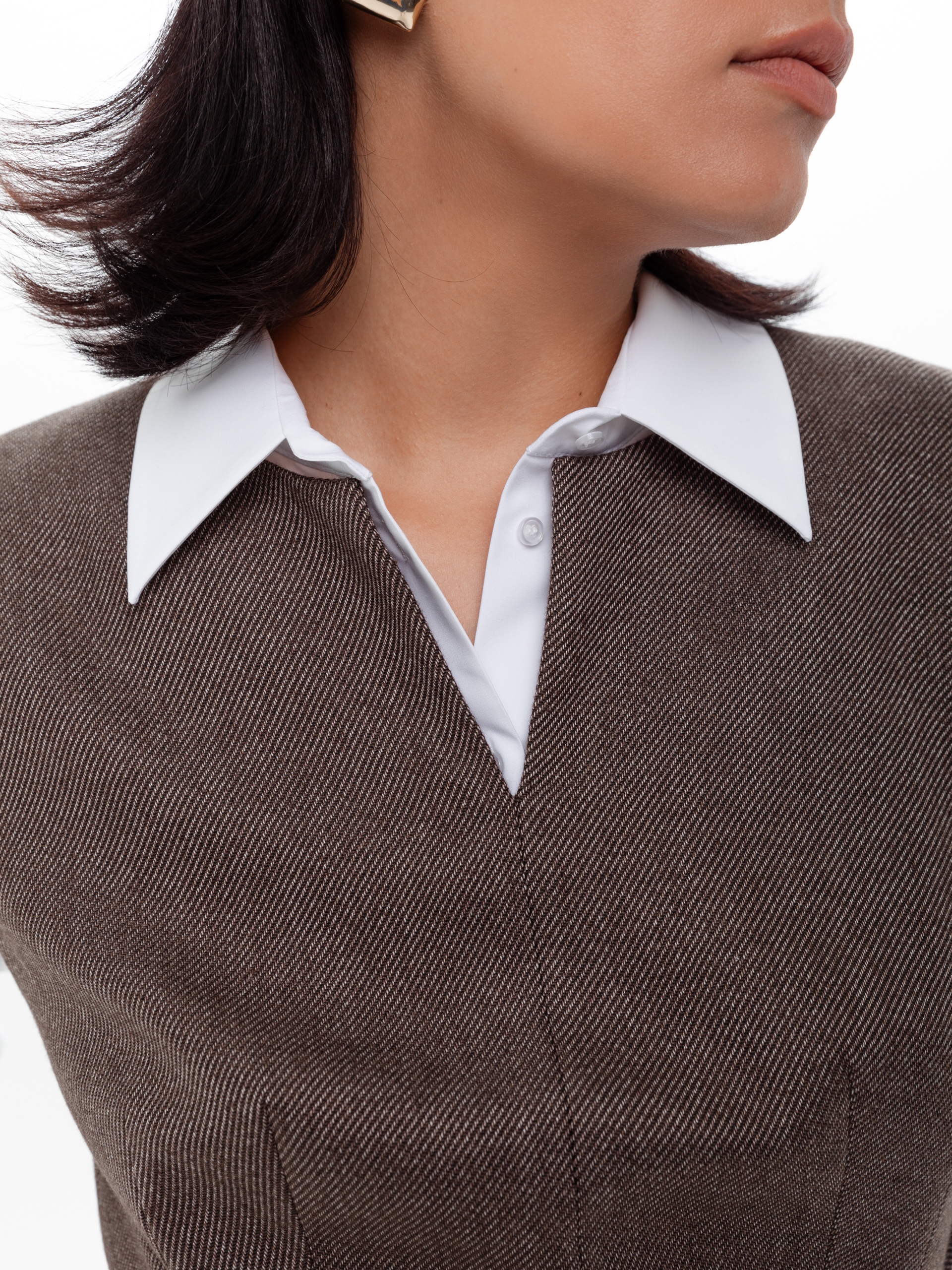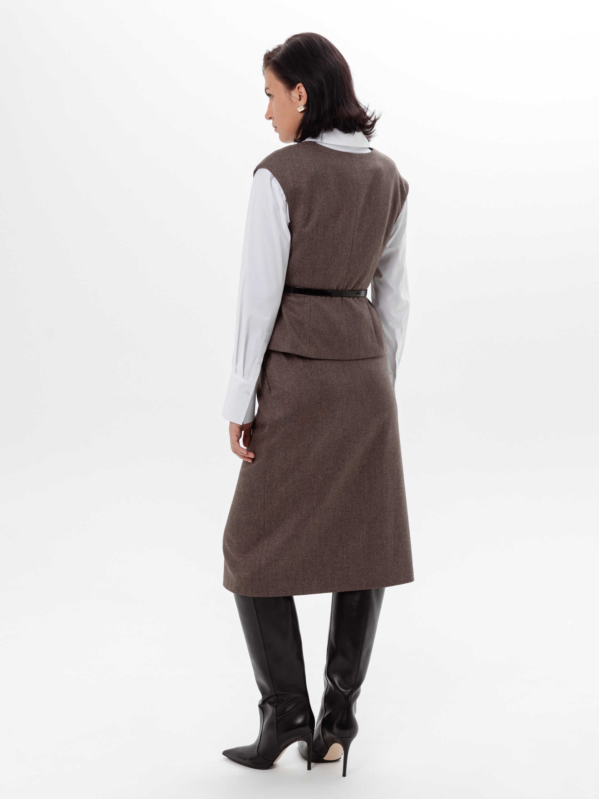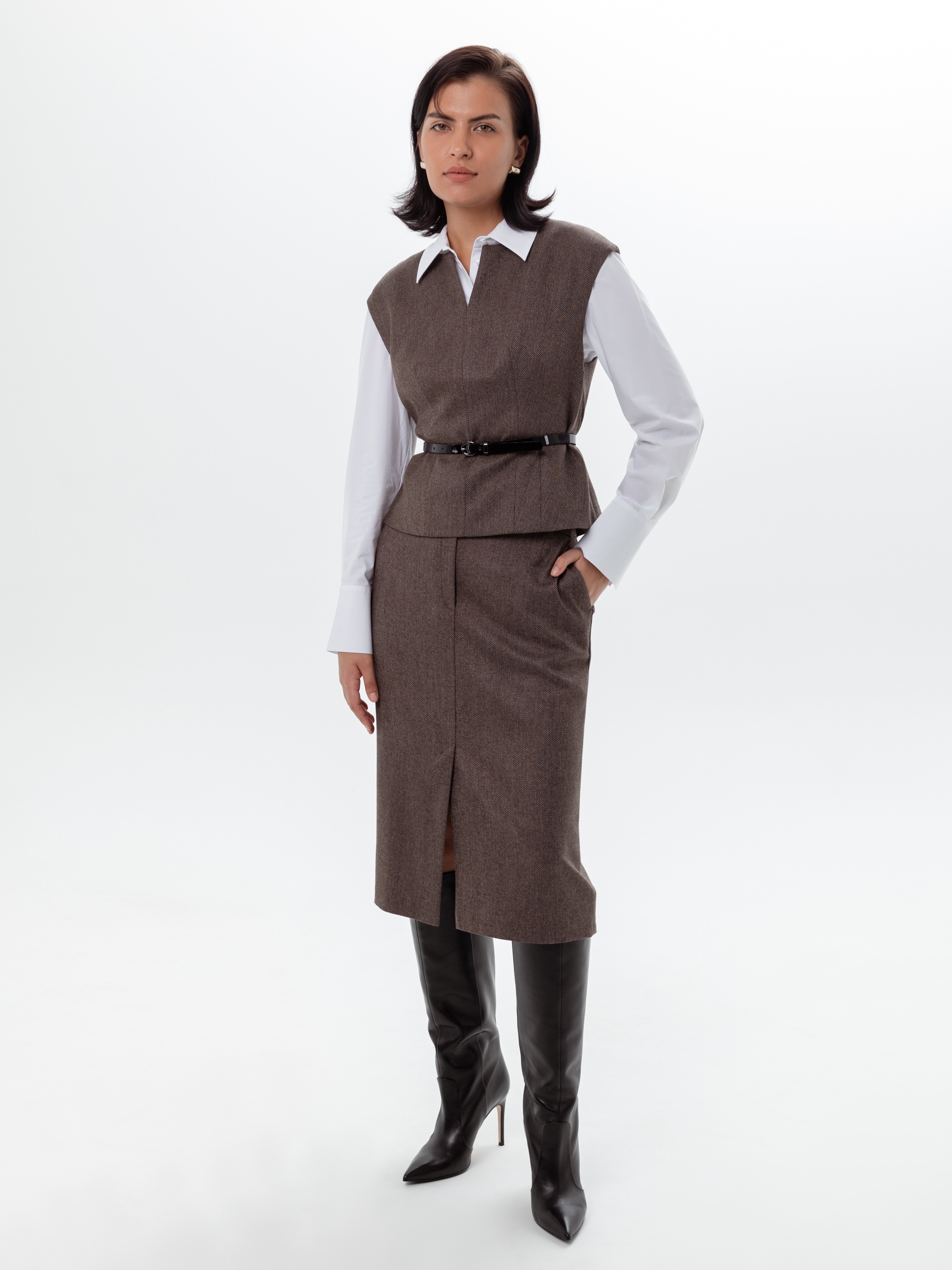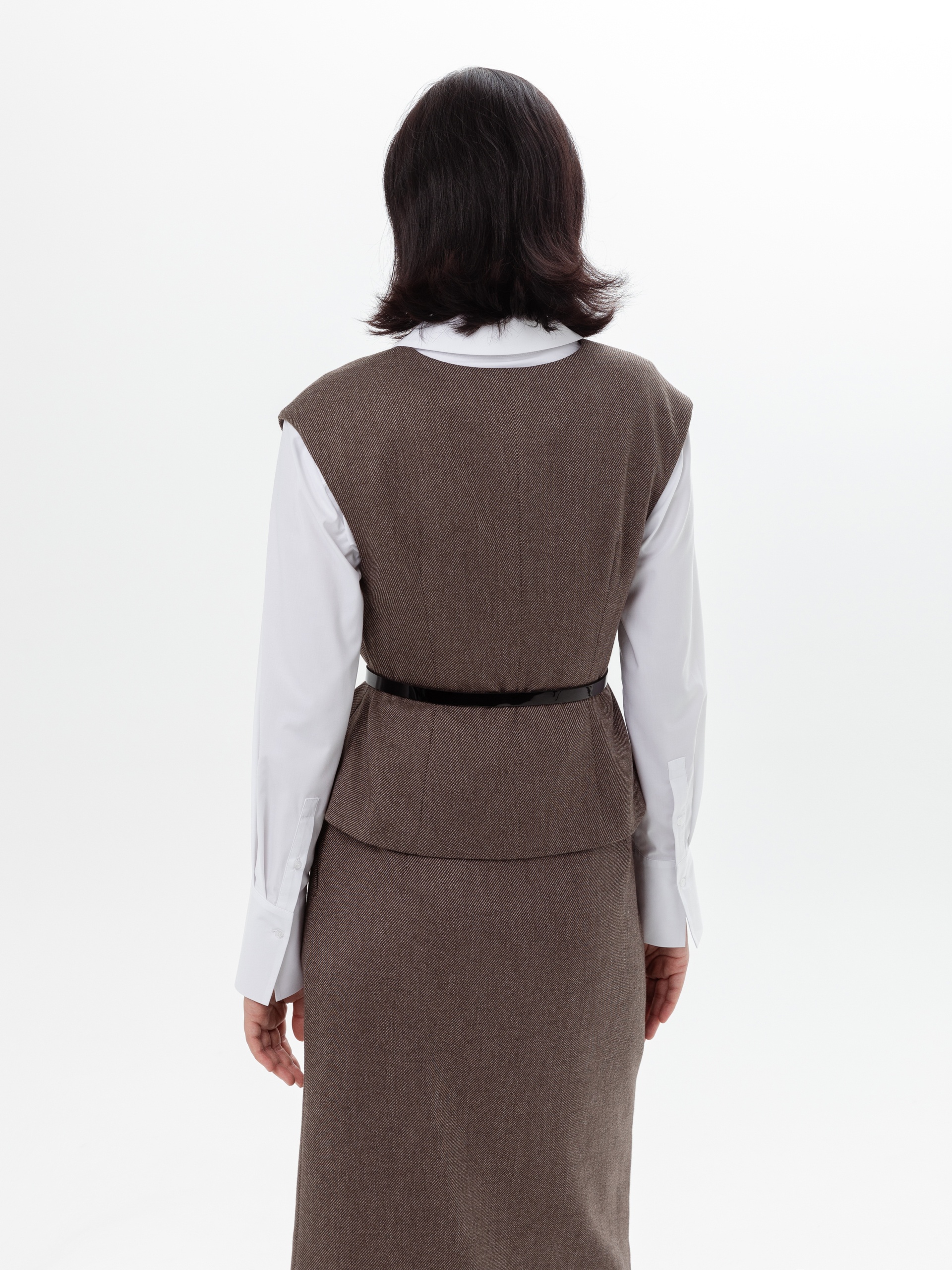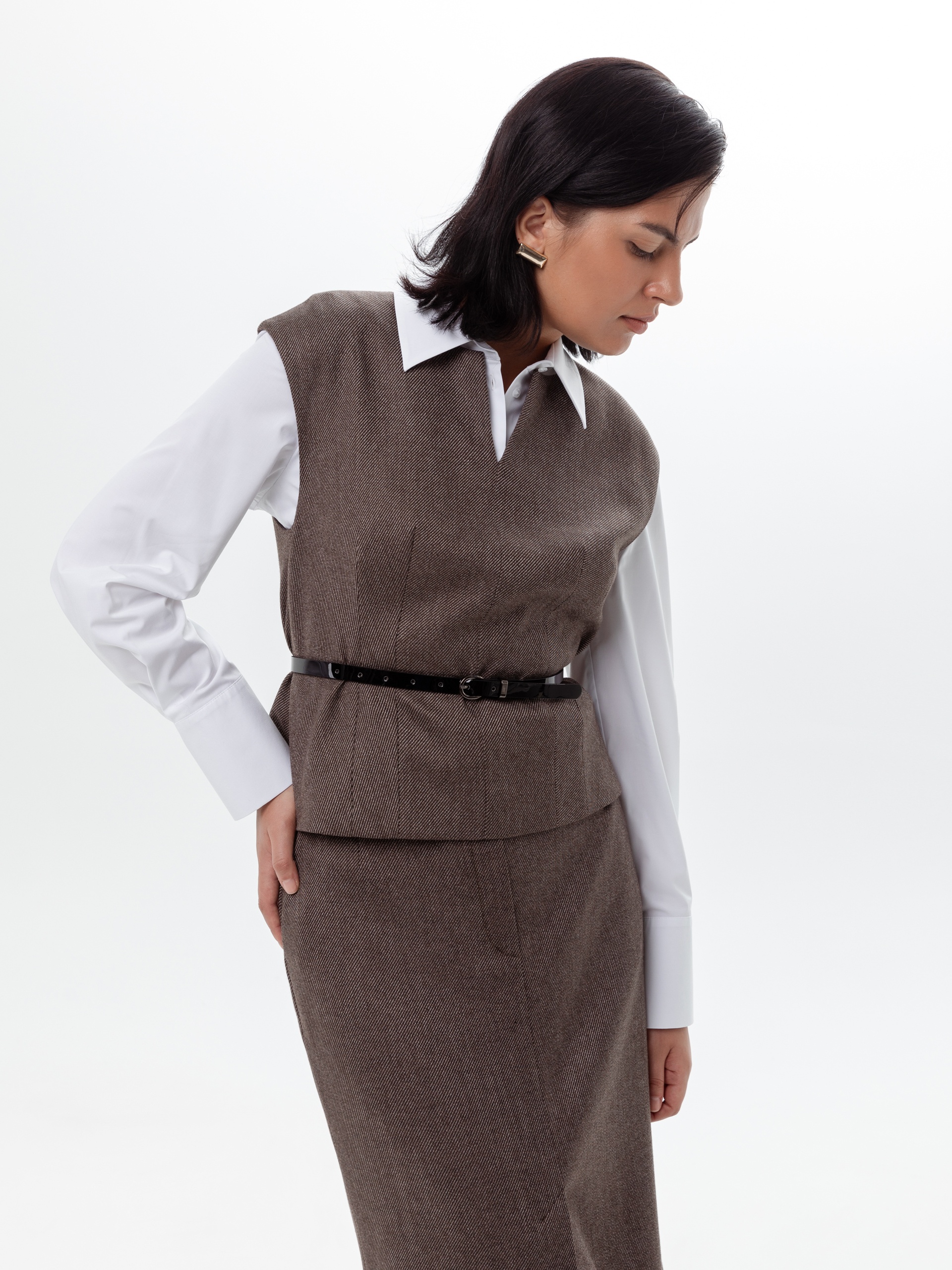 Прилегающий жилет со спущенной линией плеча круглым вырезом горловины с разрезом. Потайная молния в боковом шве. Жилет составит стильный образ с широкими брюками и классической юбкой. В комплект входит черный пояс из экокожи.