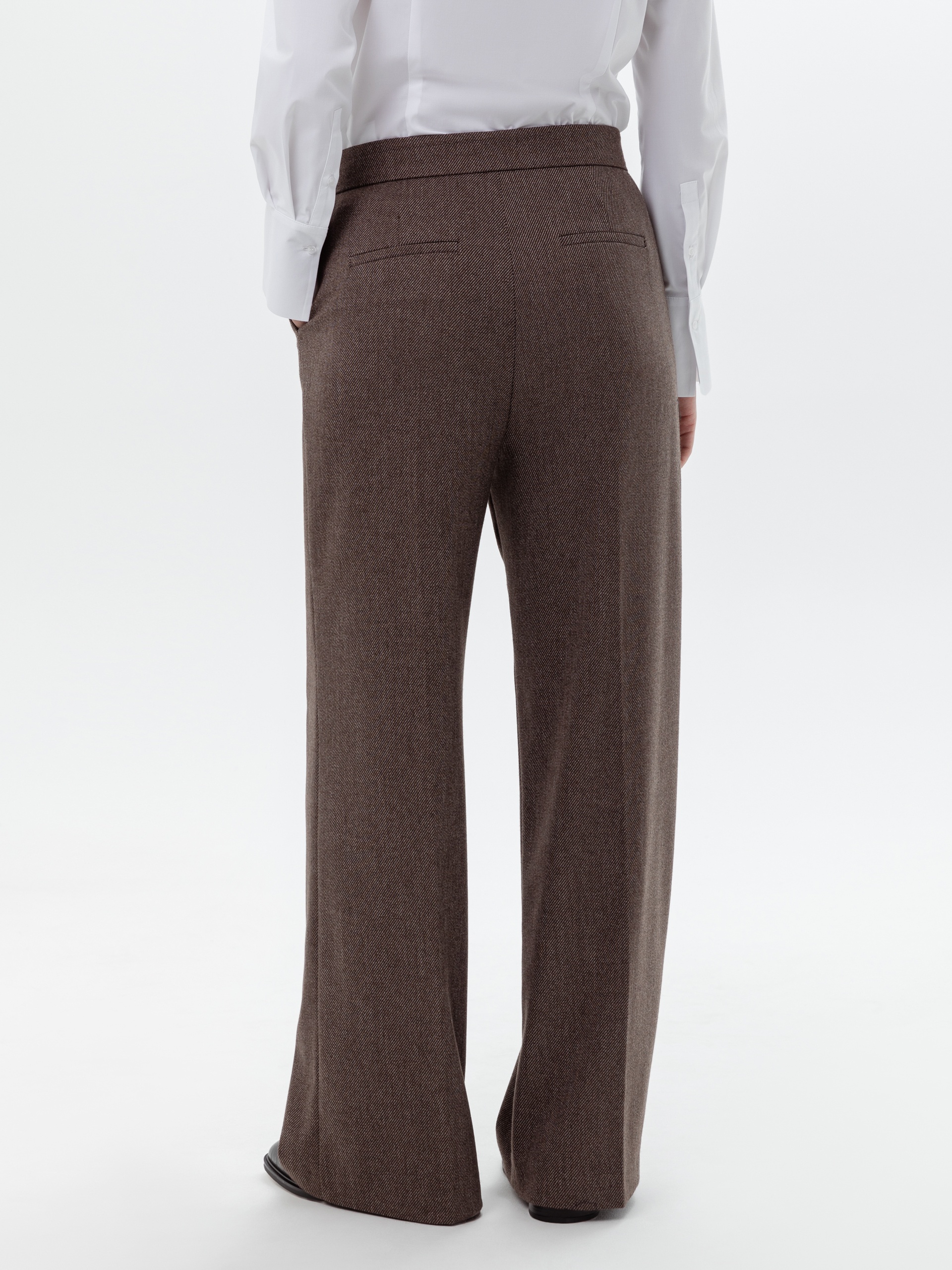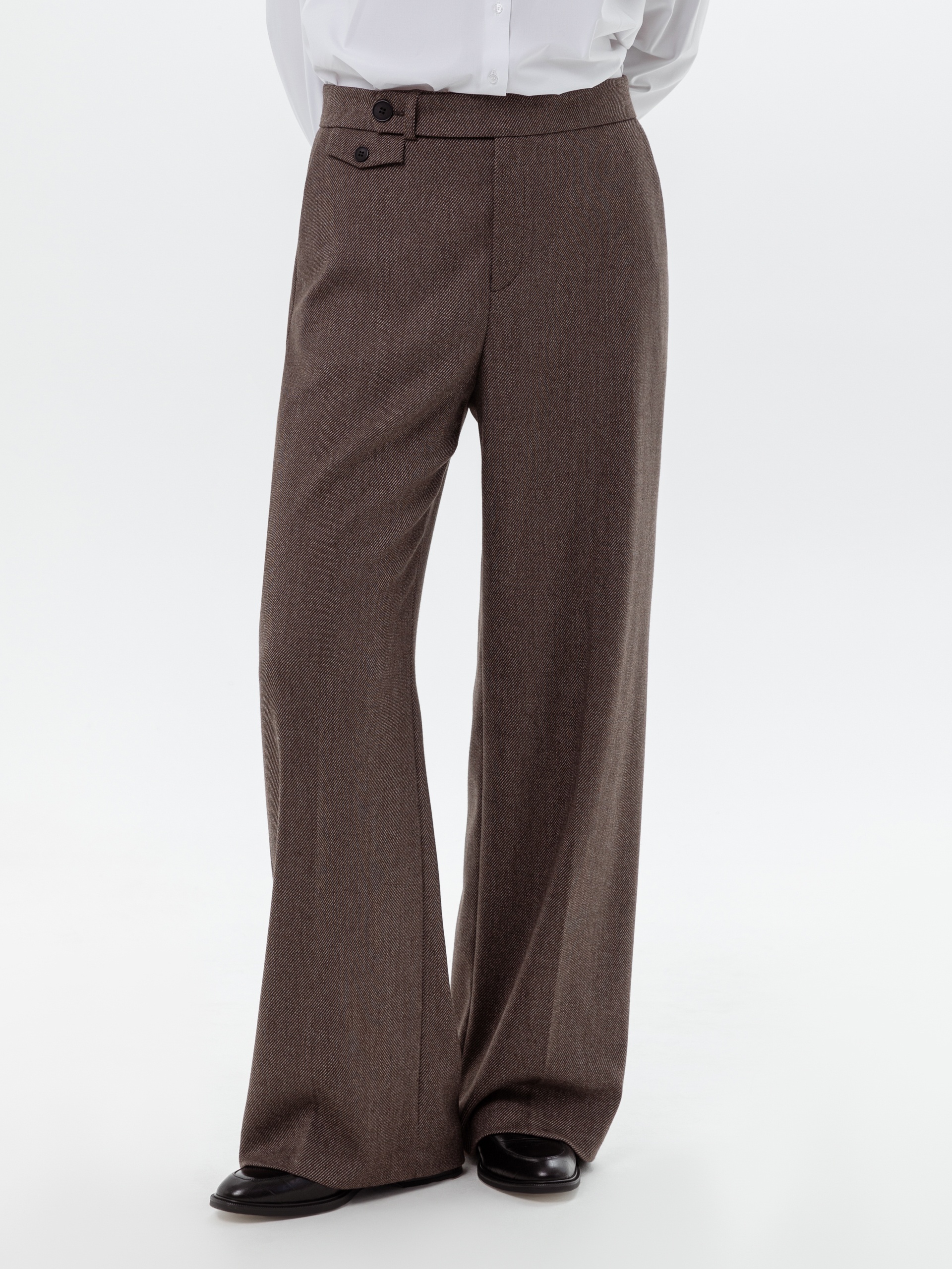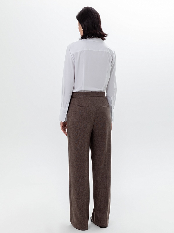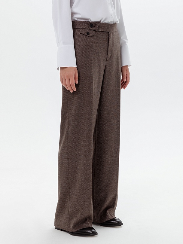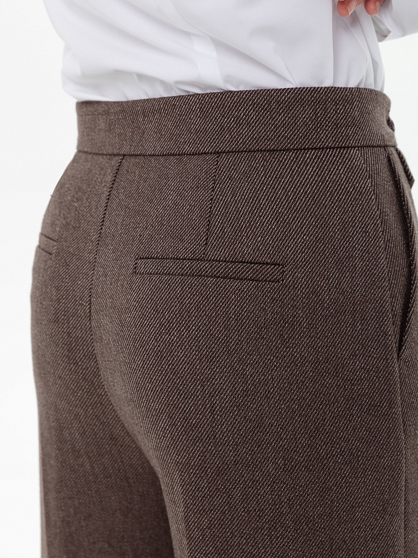 Брюки со стрелками прямого силуэта слегка расклешенные книзу, выполнены из костюмной ткани с диагональю шоколадного цвета. На притачном поясе, застежка спереди на молнию и крючок. Брюки идеально сочетаются с жилетом из этой же ткани.
