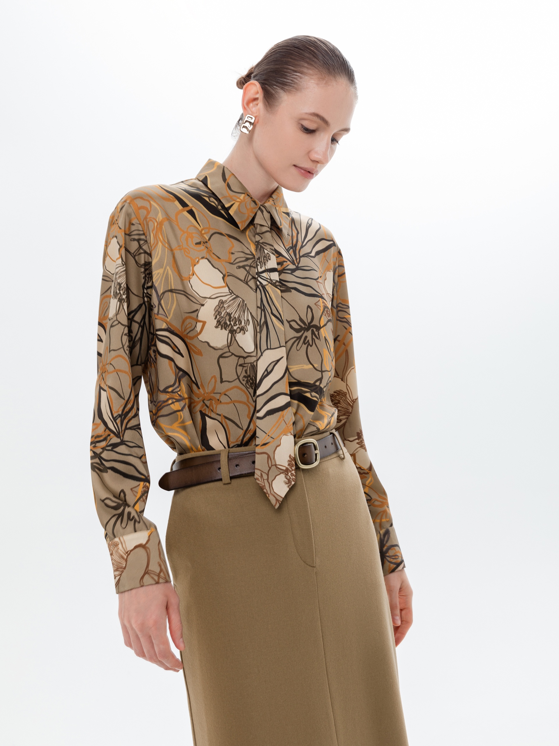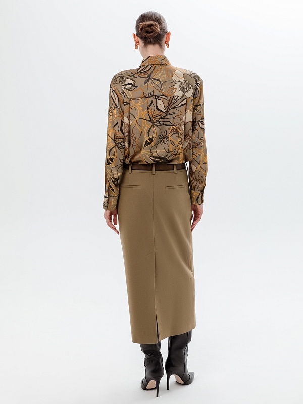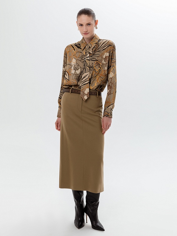 Свободная блуза из плательной ткани в принте с отложным воротником и спущенным плечом. На спинке идет кокетка со складками под ней. Блуза с прямым краем по низу, с разрезами по бокам. В комплект входит галстук из той же ткани, что и блуза. Галстук крепится на пуговицы к воротнику блузы.
