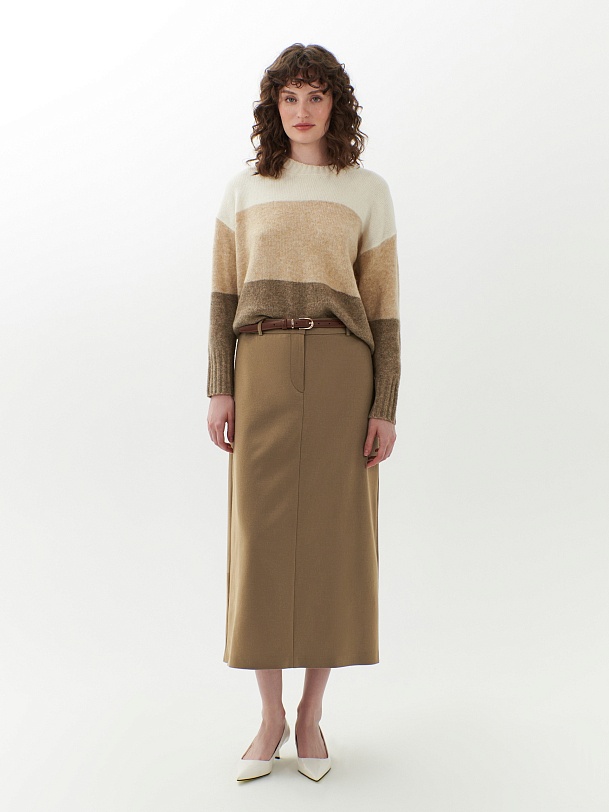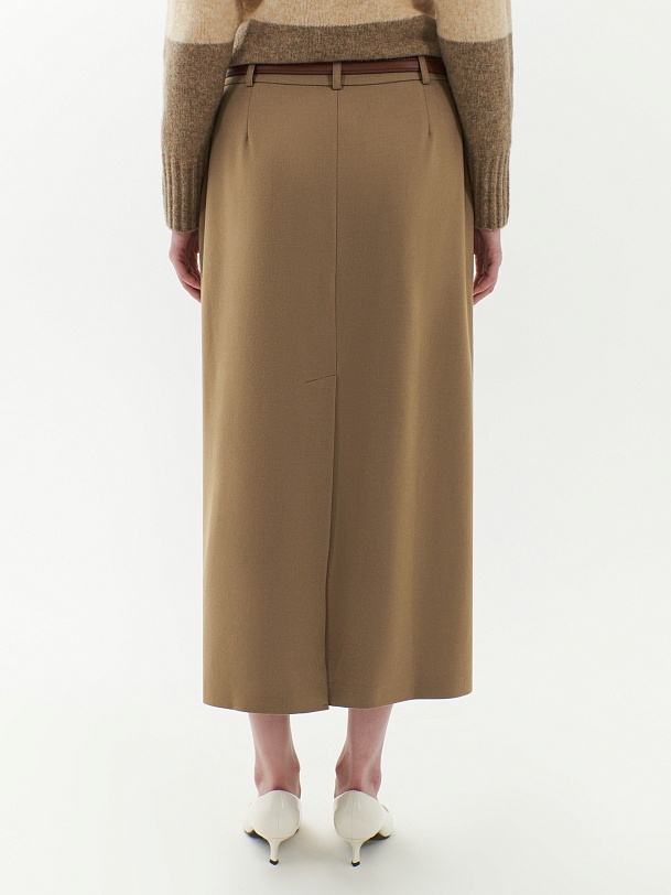 Прямая юбка на средней посадке с притачным поясе и шлевками. Юбка миди из шерстяной ткани в цвете орех. На полочке центральный шов и гульфик с потайной молнией. Имеют два функциональных кармана по бокам. На спинке высокая шлица. В комплект входит ремень из экокожи.