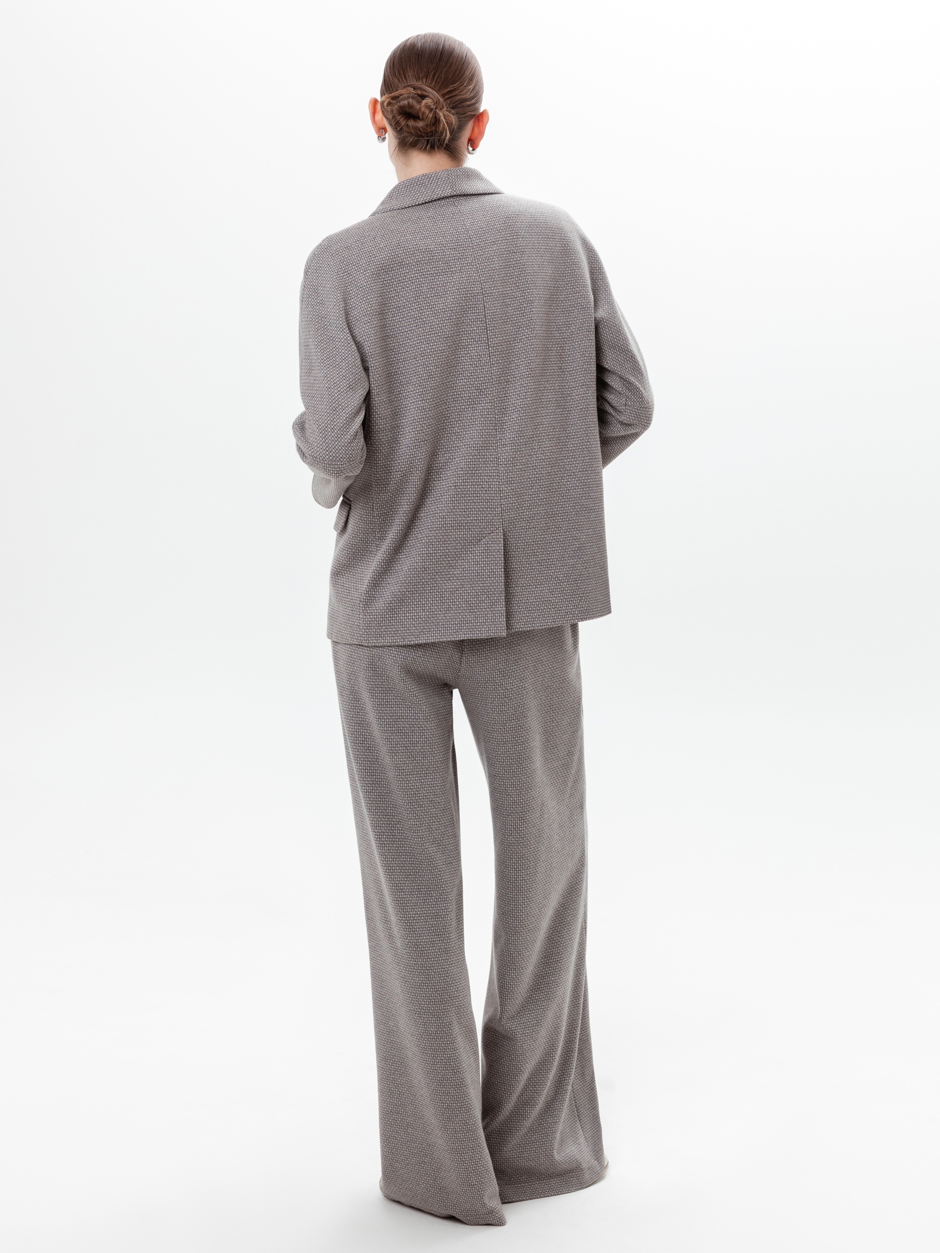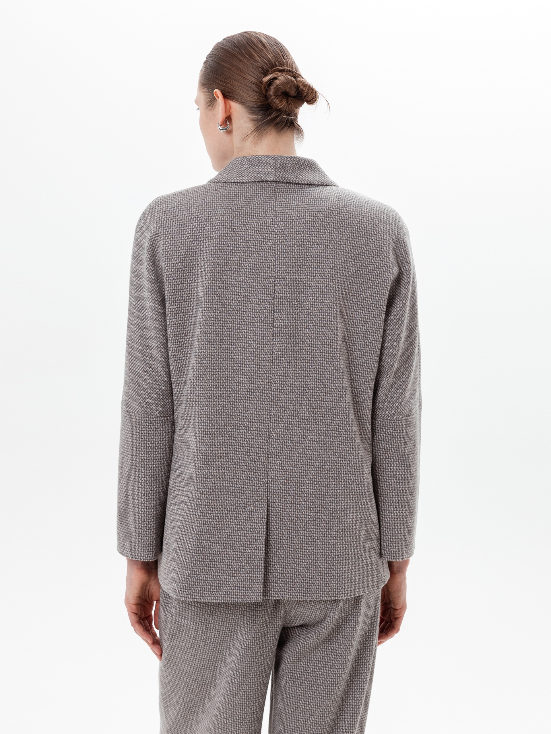 Жакет на подкладке из трикотажного полотна в рисунок пье-де-пуль, прямого силуэта. Модель имеет V-образный вырез, воротник-шаль и рукав кимоно. Спереди два кармана и застежка на пуговицу. Для создания кэжуального и уютного осеннего образа можно сочетать с широкими брюками из той же ткани из нашей коллекции.