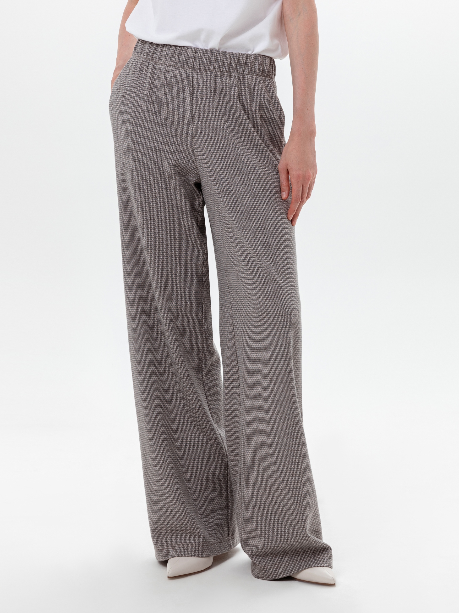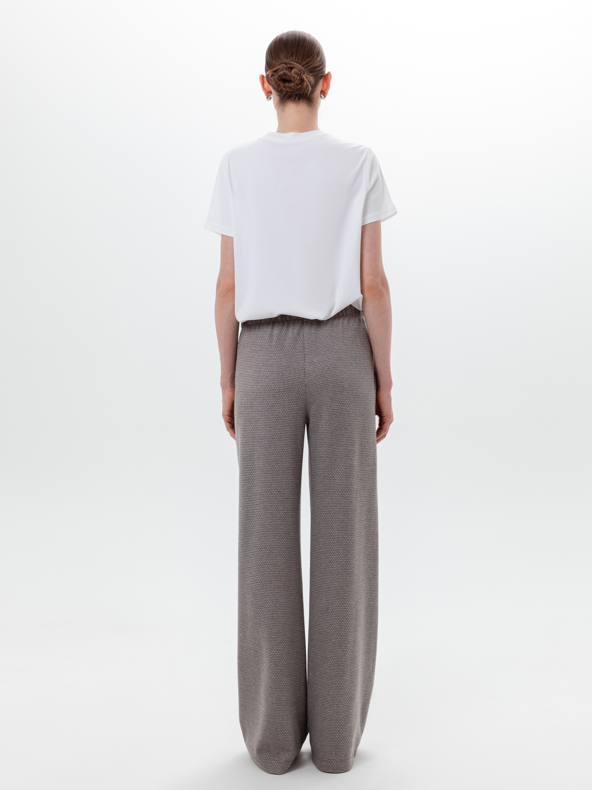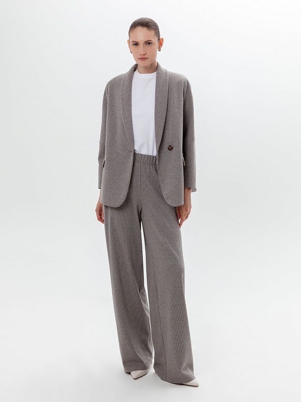 Широкие и комфортные брюки из трикотажного жаккарда с поясом на резинке. Комплектуйте с жакетом из той же ткани из нашей коллекции для создания кэжуального и уютного осеннего образа.