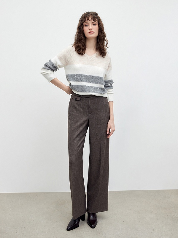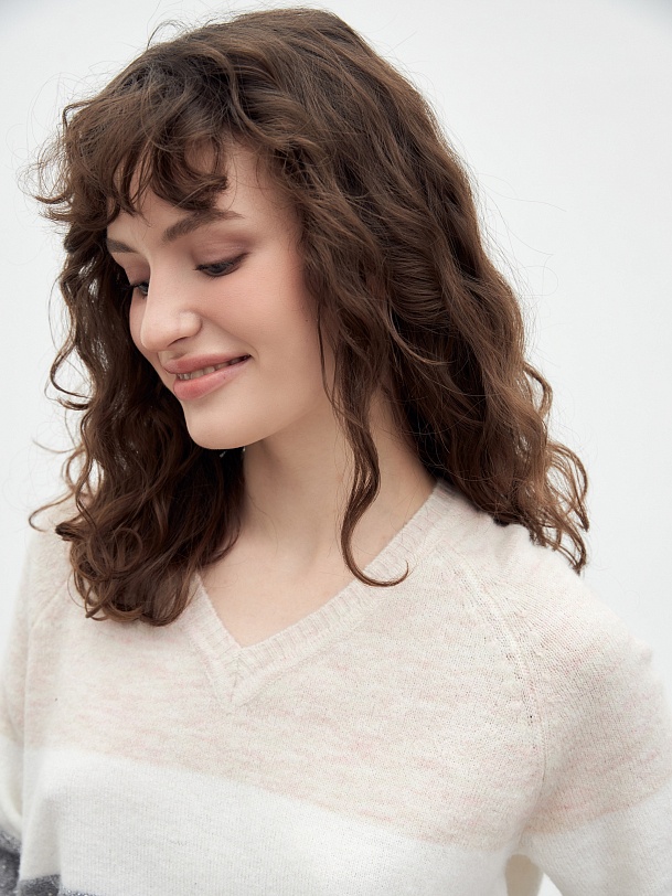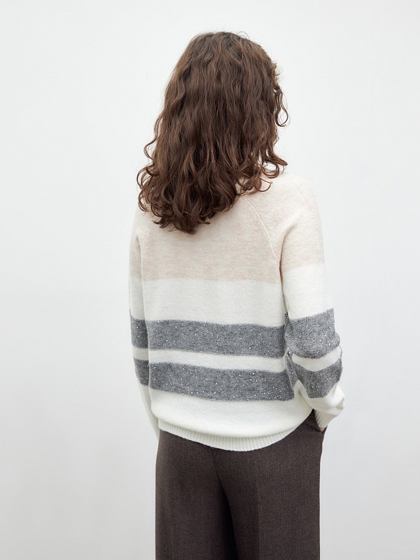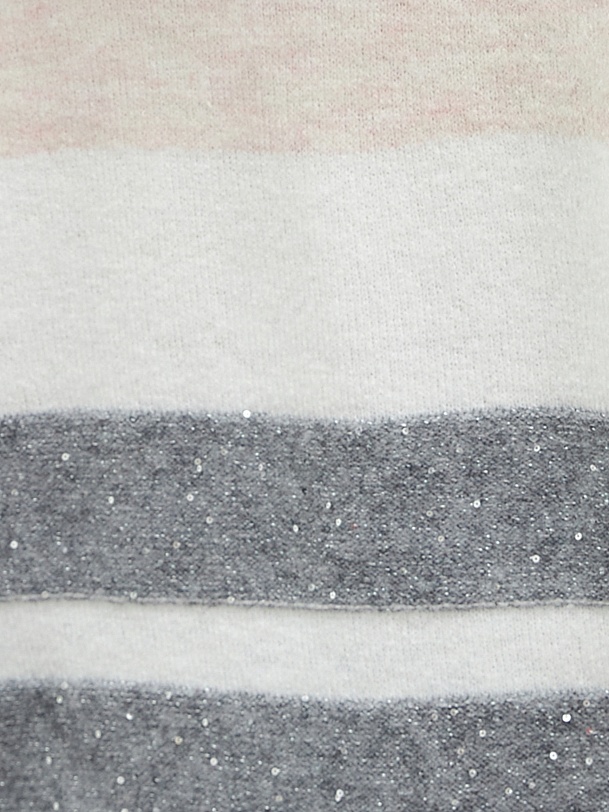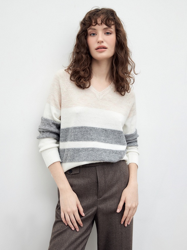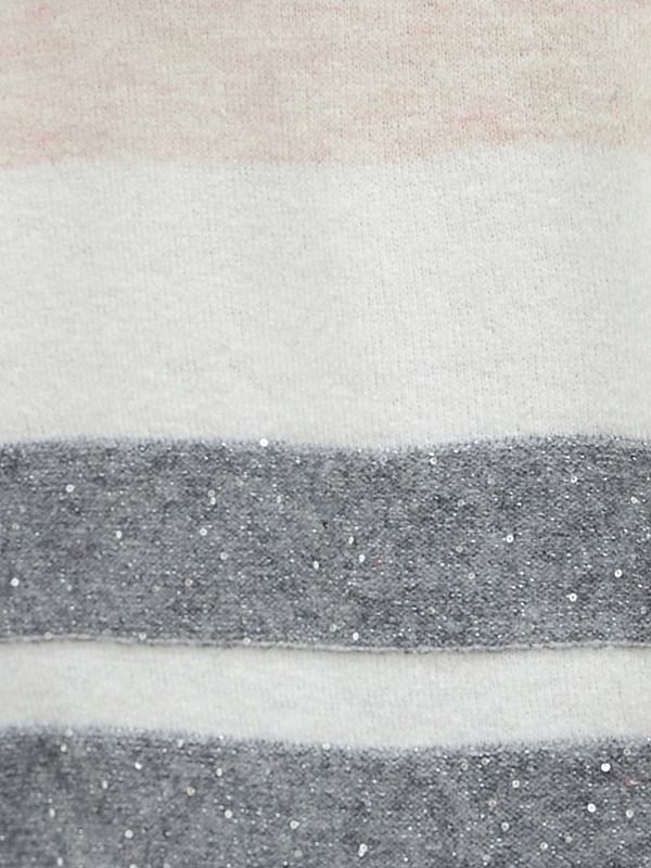 Романтичный джемпер из вязаного трикотажа с вкраплениями мелких пайеток и люрекса, которые создают элегантный и ненавязчивый блеск пряжи в серых полосках, вырез горловины V-образный, рукав реглан. Смесовый состав пряжи с содержанием овечьей шерсти даёт дополнительную мягкость и теплоту изделию. Благодаря уникальной структуре овечьей шерсти она "дышит" - между волокнами располагаются особые воздушные полости, внутри которых циркулирует воздух, он помогает выводить лишнее тепло и влагу.