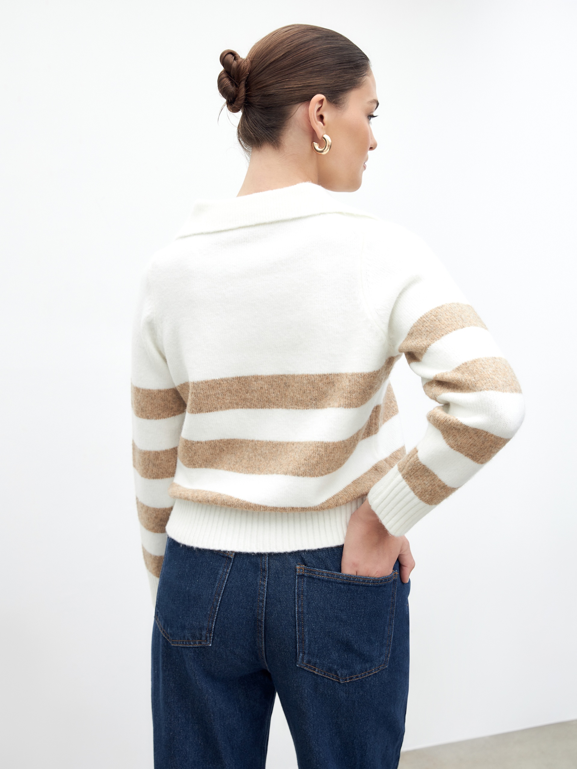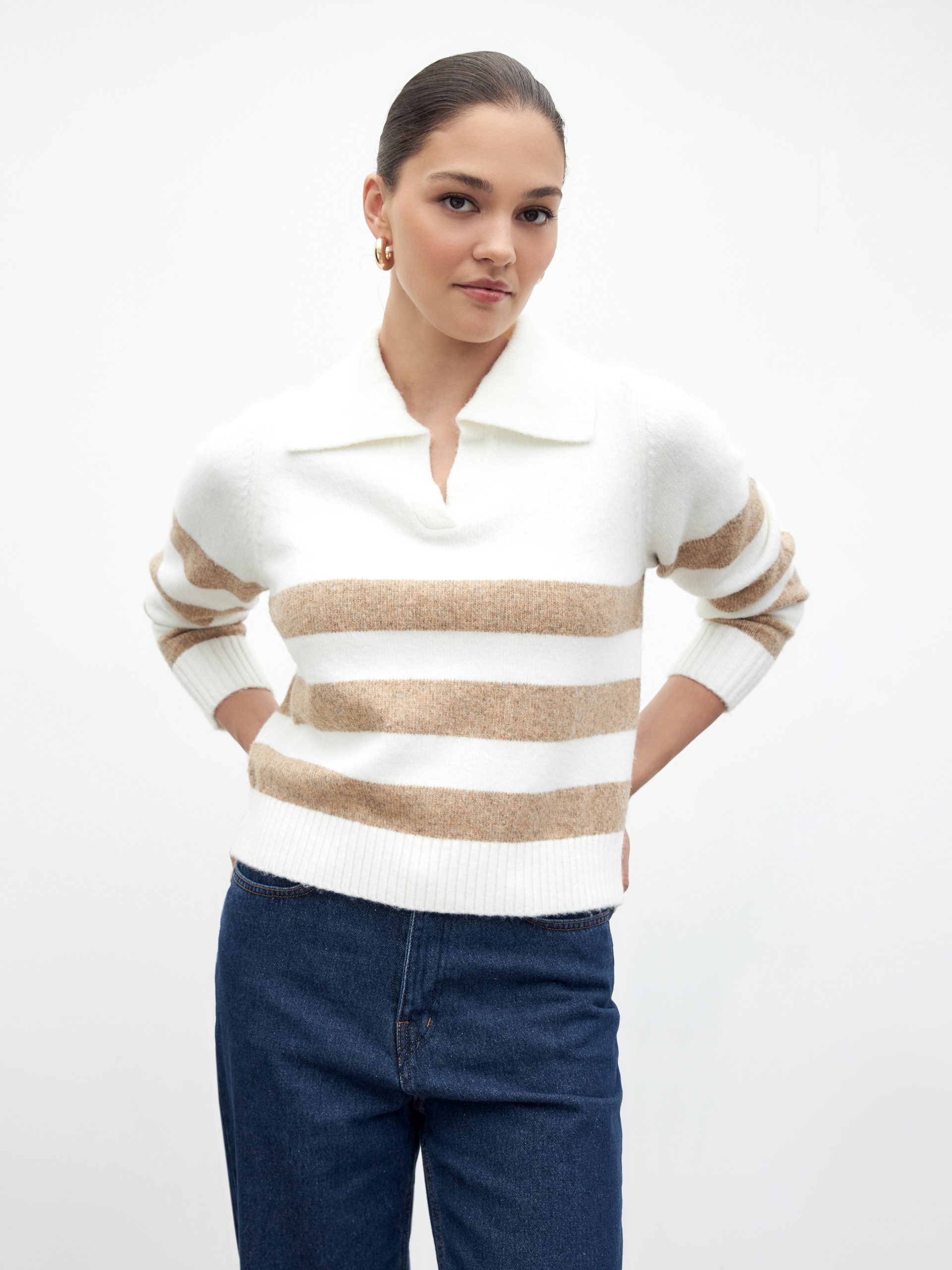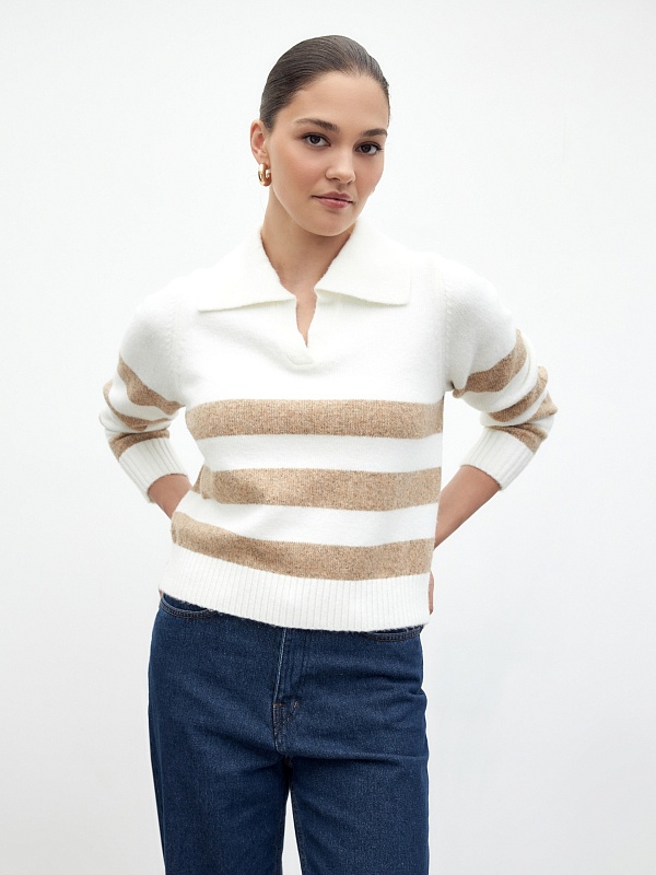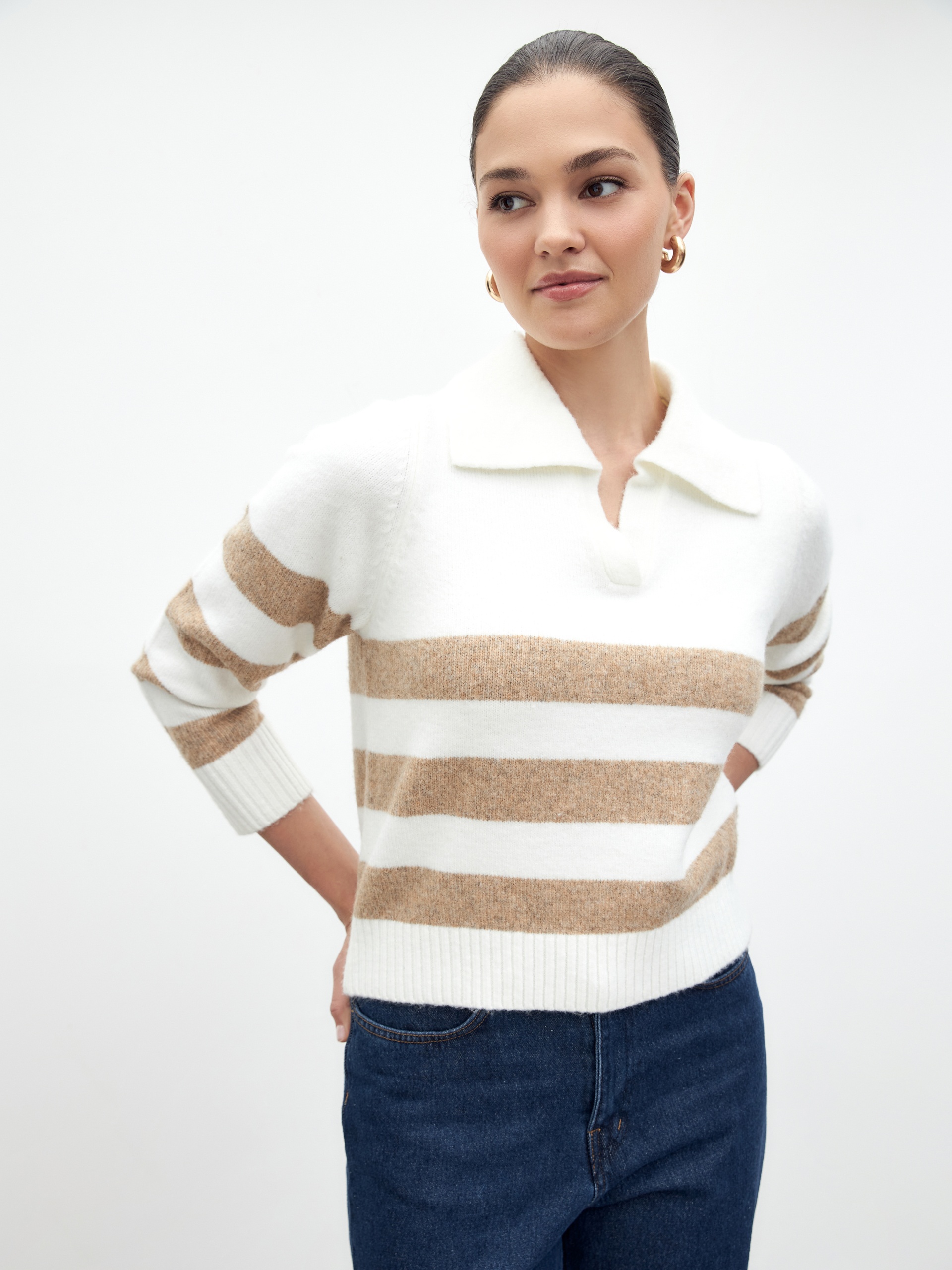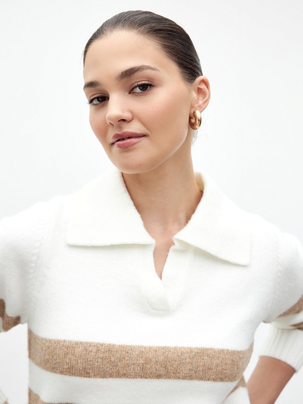 Вязаный джемпер с V-образным вырезом и воротником "поло", которые придадут вашему ансамблю нотку элегантности. Смесовый состав пряжи с содержанием овечьей и верблюжьей шерсти даёт дополнительную мягкость и теплоту изделию. Благодаря уникальной структуре овечьей шерсти она "дышит" - между волокнами располагаются особые воздушные полости, внутри которых циркулирует воздух, он помогает выводить лишнее тепло и влагу.
