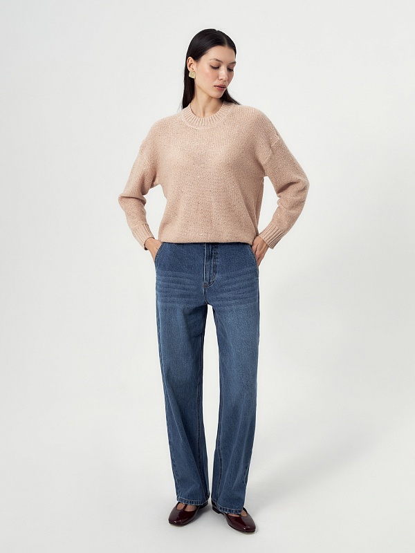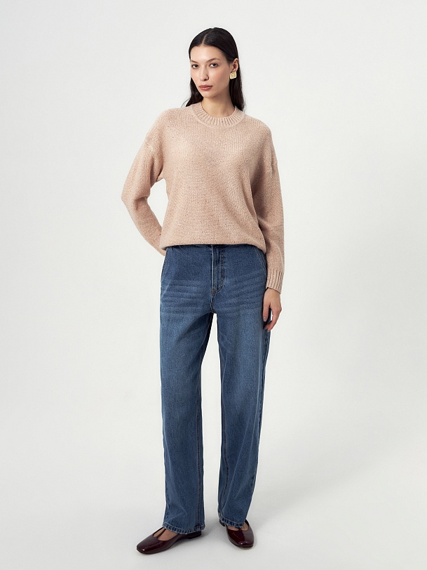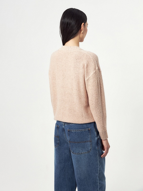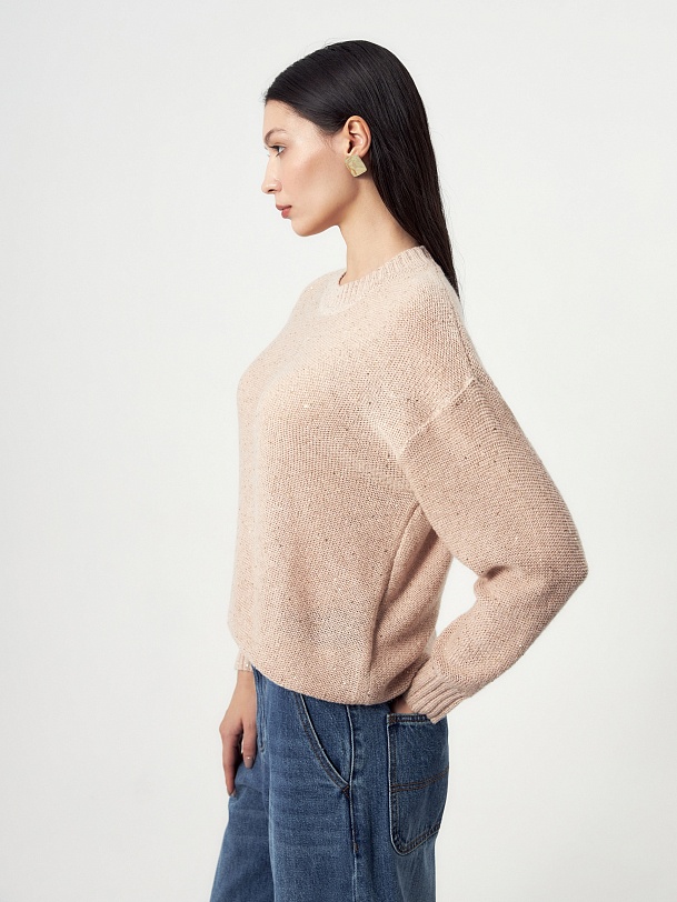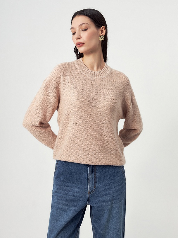 Романтичный джемпер из вязаного трикотажа с вкраплениями мелких пайеток и люрекса, которые создают элегантный и ненавязчивый блеск пряжи. Смесовый состав пряжи с содержанием шерсть мериноса даёт дополнительную мягкость и теплоту изделию.