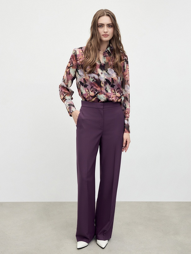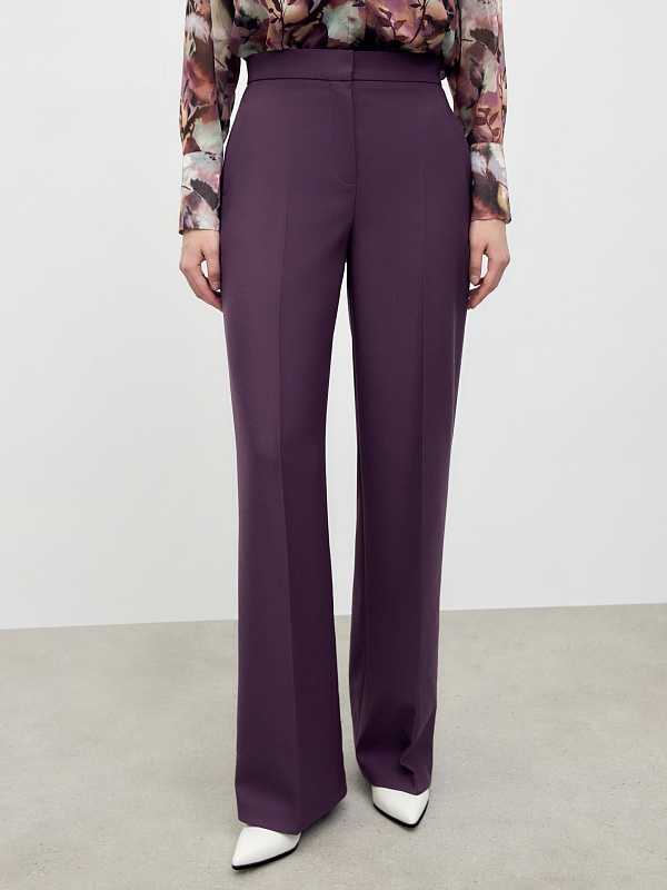 Брюки прямые на высокой посадке немного расклешенные к низу, на притачном поясе со стрелками из костюмной вискозной ткани насыщенного фиолетового цвета. Спереди рабочие боковые карманы.