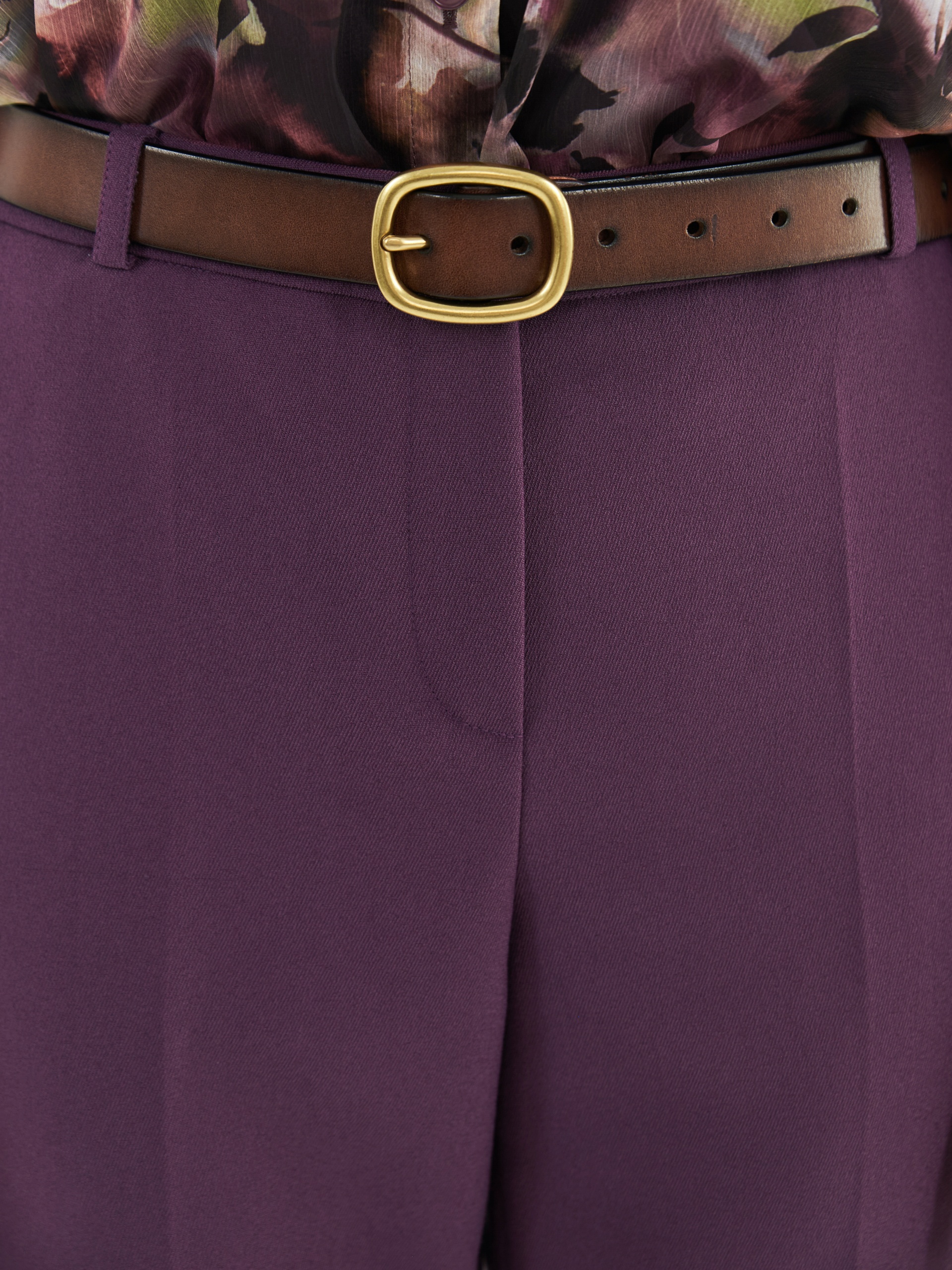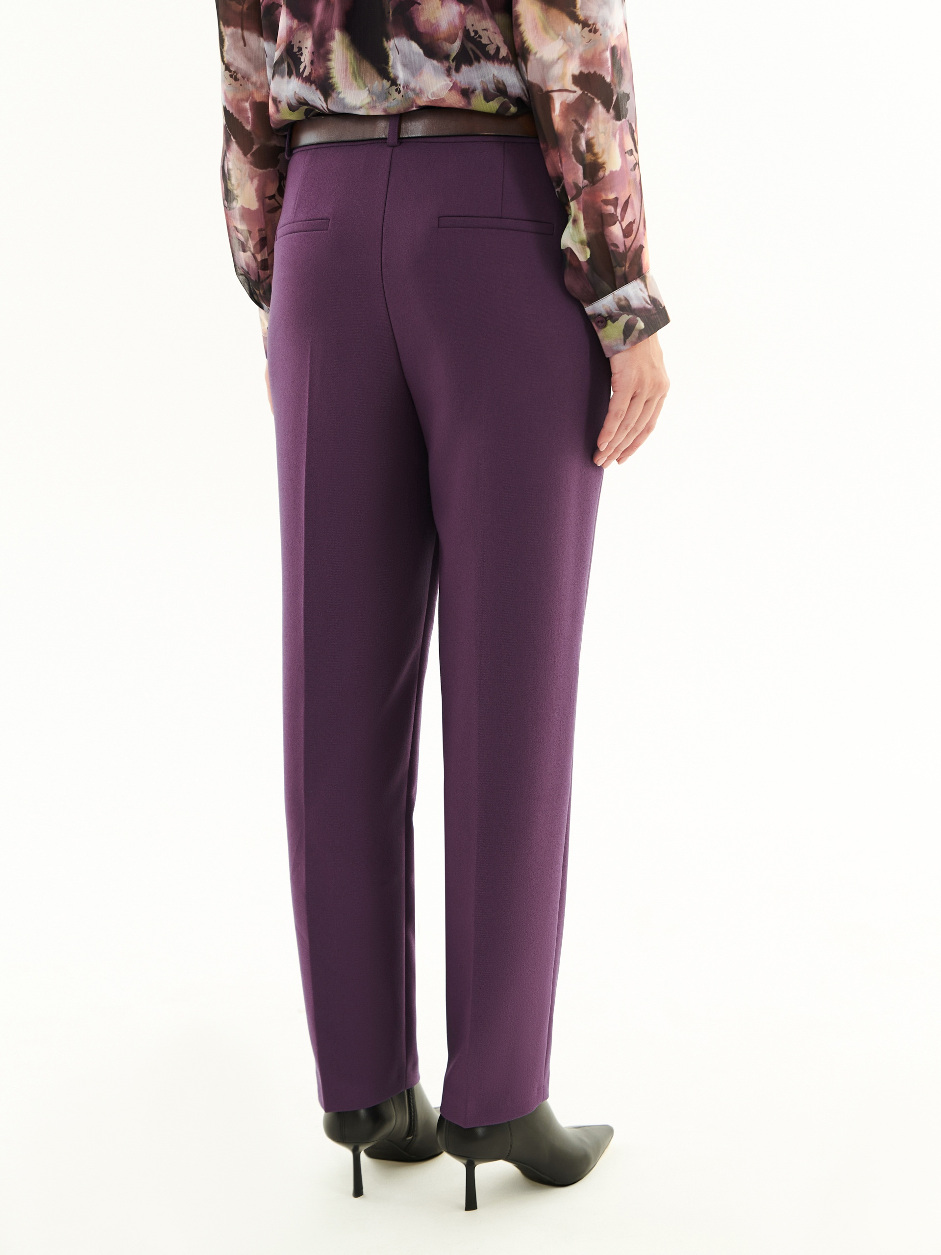 Классические брюки со стрелками зауженного к низу силуэта на притачном поясе со шлевками из костюмной ткани насыщенного фиолетового цвета. Спереди рабочие боковые карманы и застежка на молнию и крючок. Брюки прекрасно сочетаются с жакетом из этой же ткани.