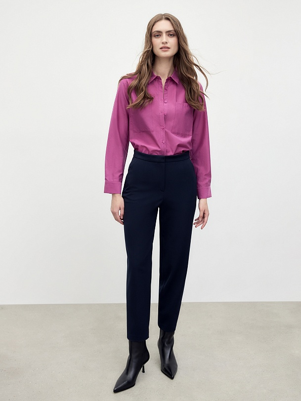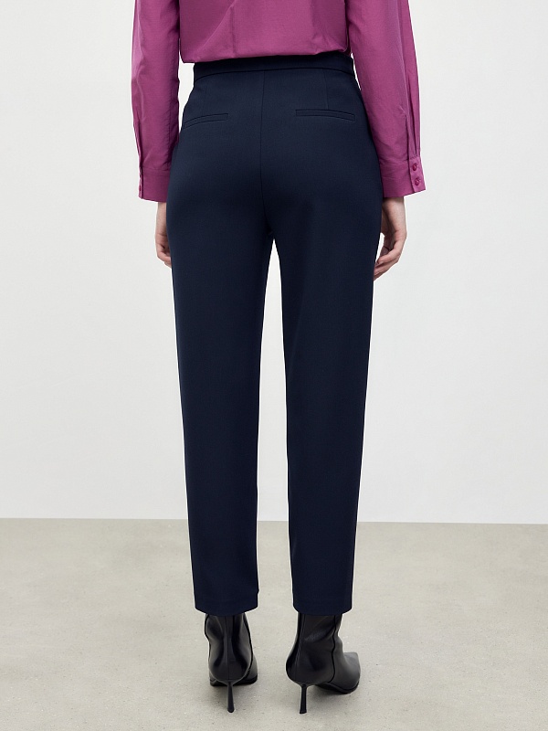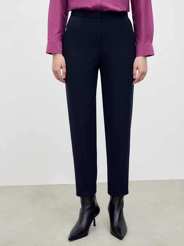 Брюки из утепленной костюмной ткани с начесом темно-синего цвета. Силуэт - полуприлегающий, слегка заужен к низу. Длина по щиколотку. Создайте гармоничный образ с ботинками или ботильонами, которые слегка будут скрываться под брюками.