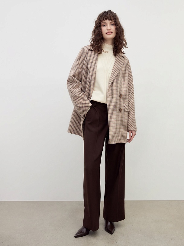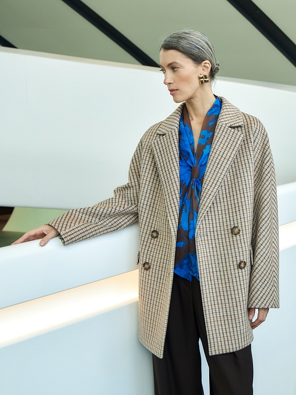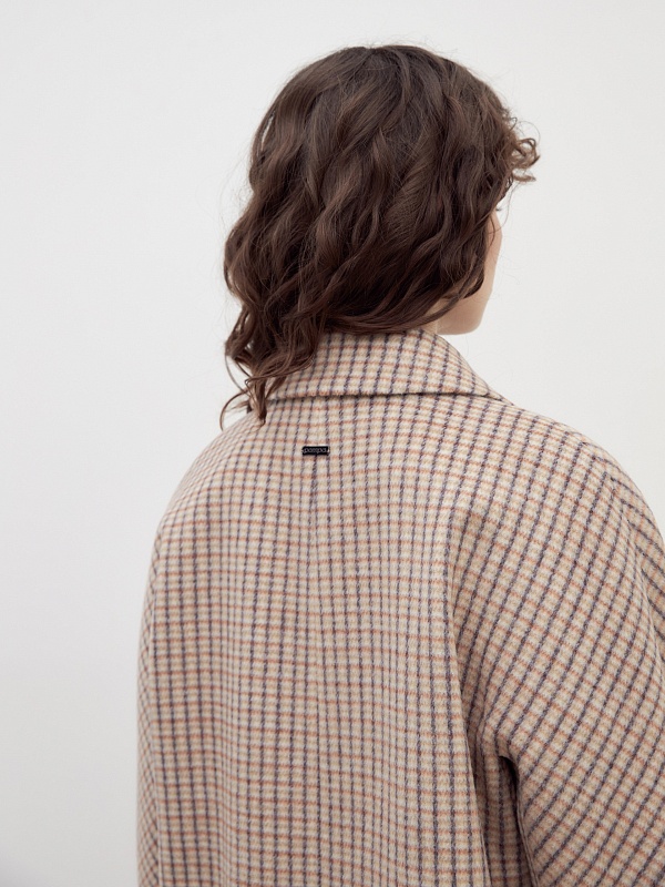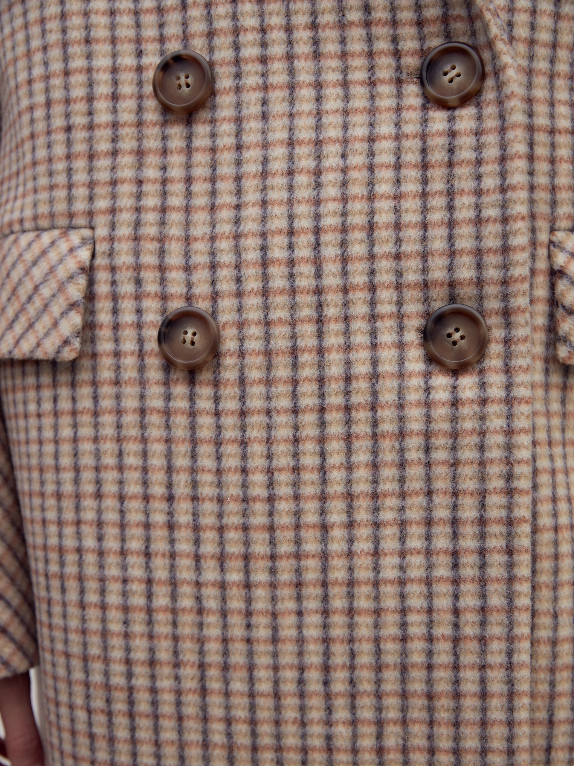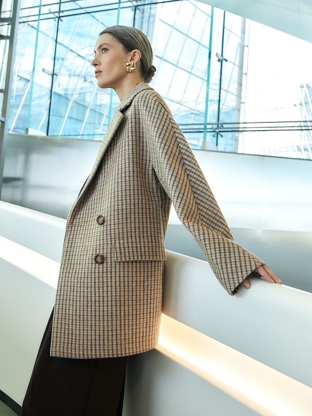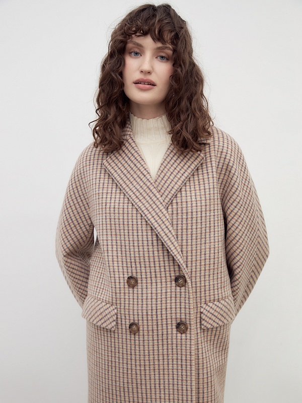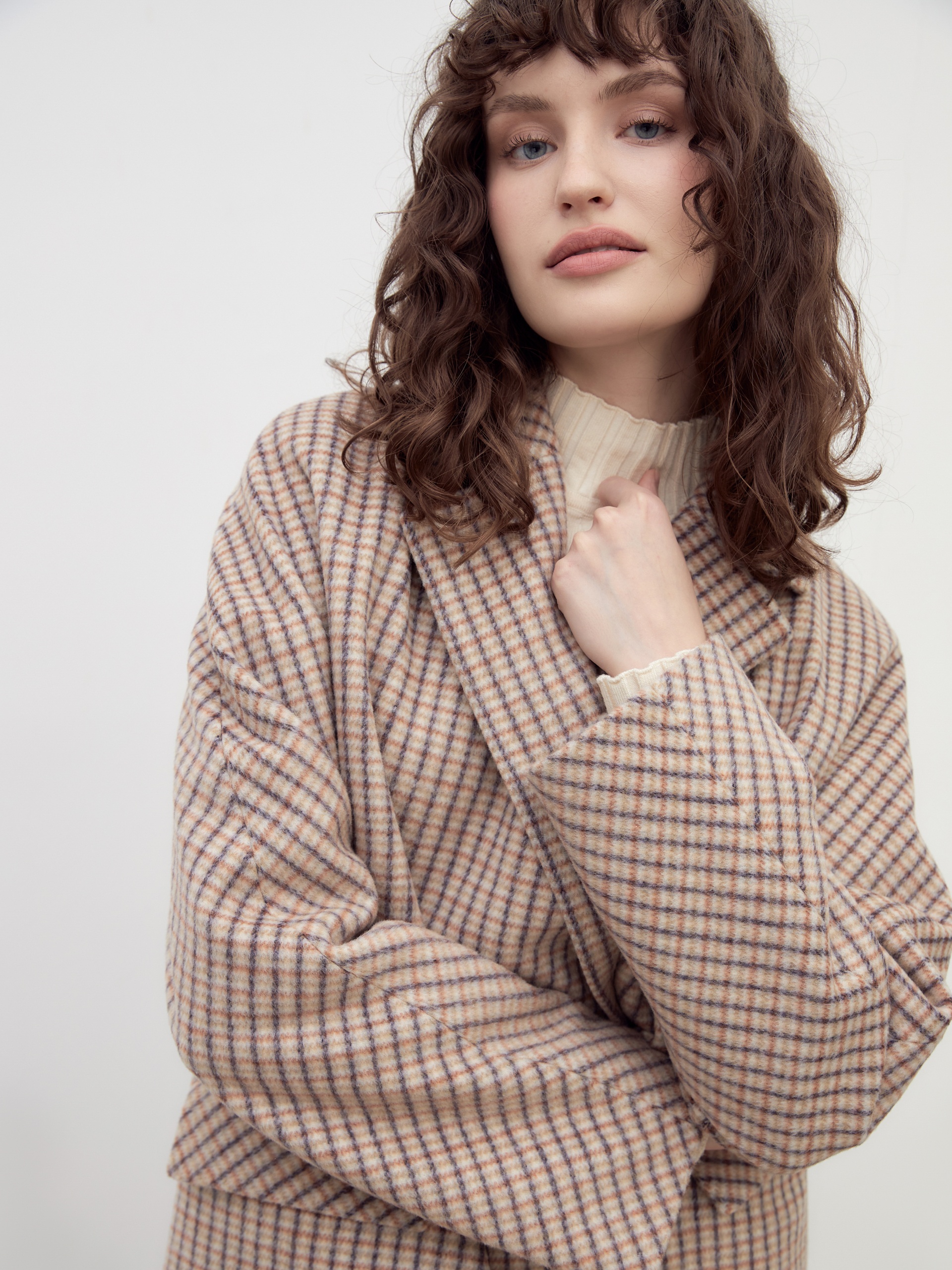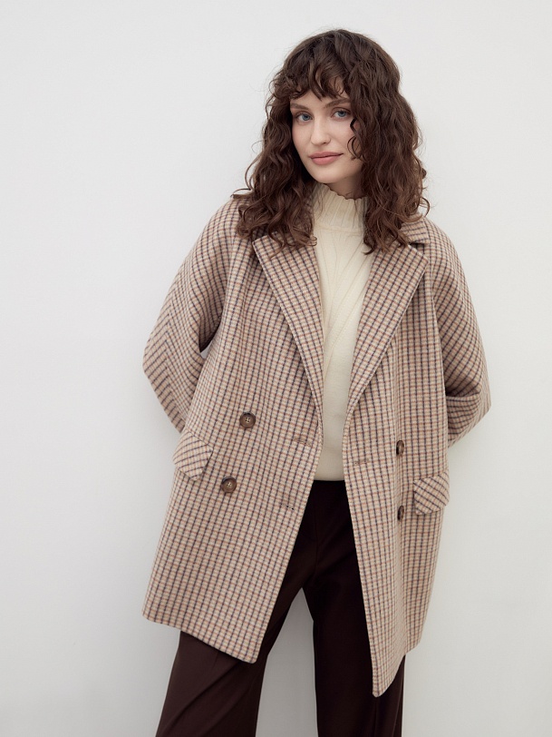Двубортное полупальто прямого силуэта из шерстяной ворсовой ткани в яркой осенней бежево-персиковой клетке. Английский воротник с узким лацканом и свободный цельнокроенный рукав "кимоно" делают пальто стильным и удобным. По бокам располагаются карманы с клапанами. Застежка на два ряда крупных пуговиц. Спинка имеет дополнительное утепление. А для наилучшей защиты от ветра и непогоды пальто выполнено с использованием высокотехнологичной мембраны RaftPro. Произведено в Санкт-Петербурге.