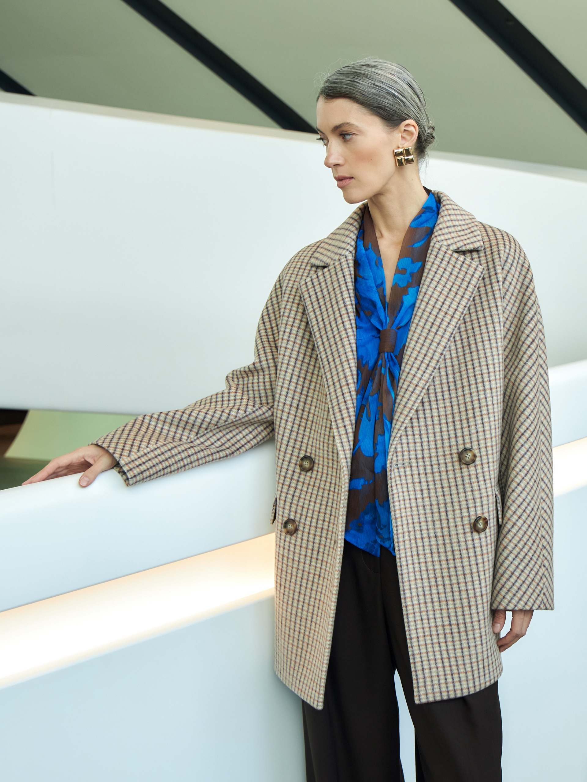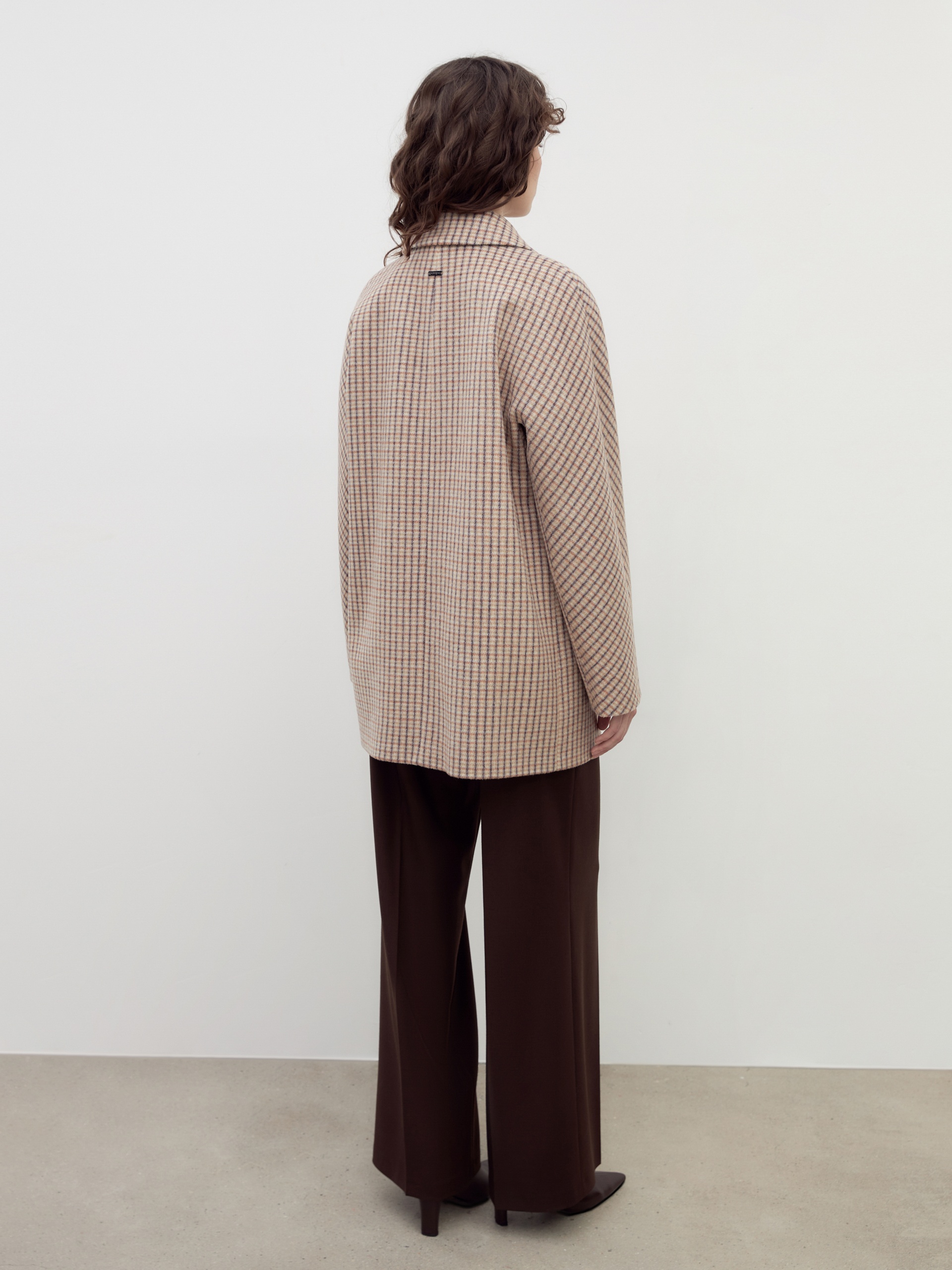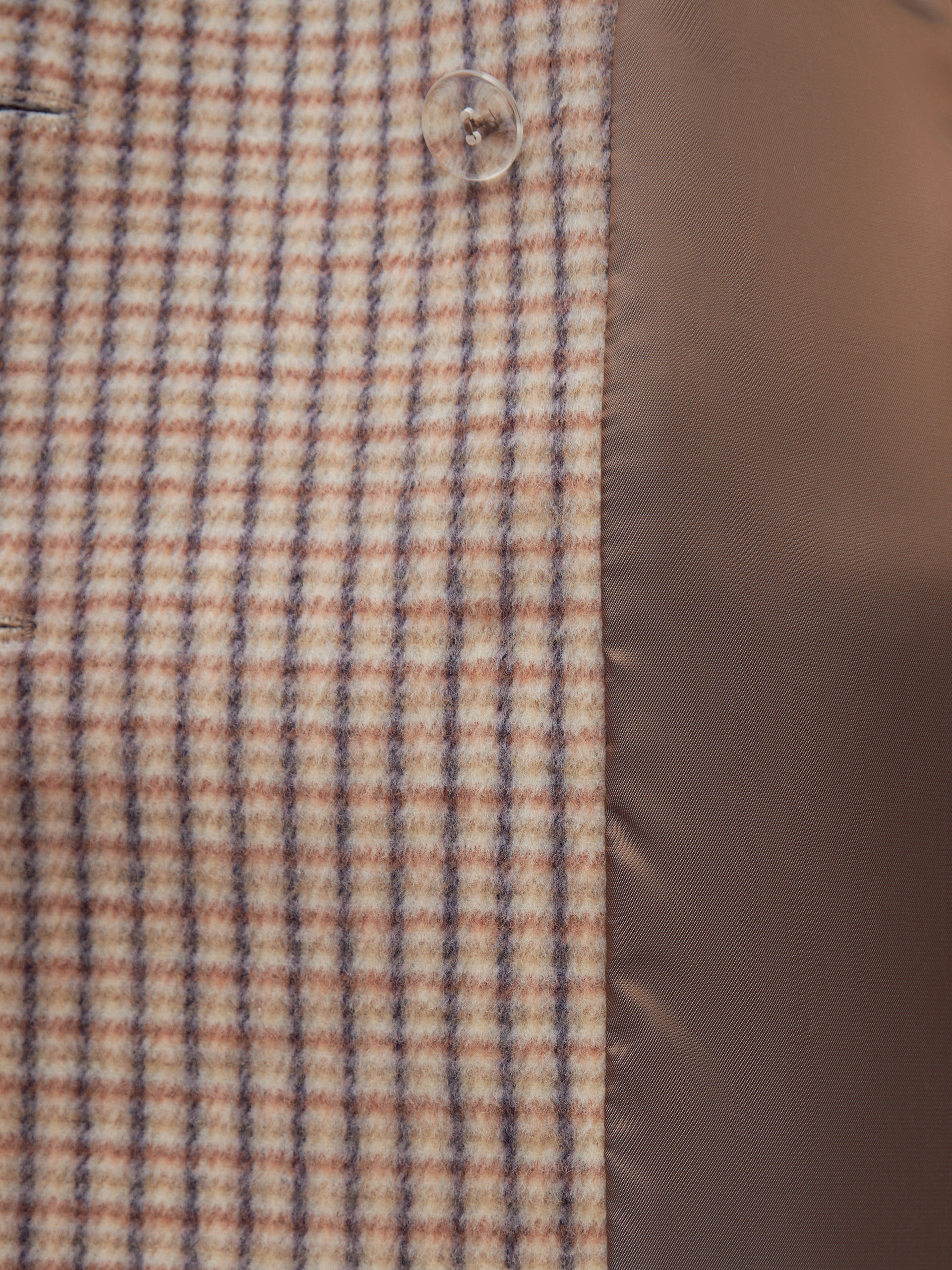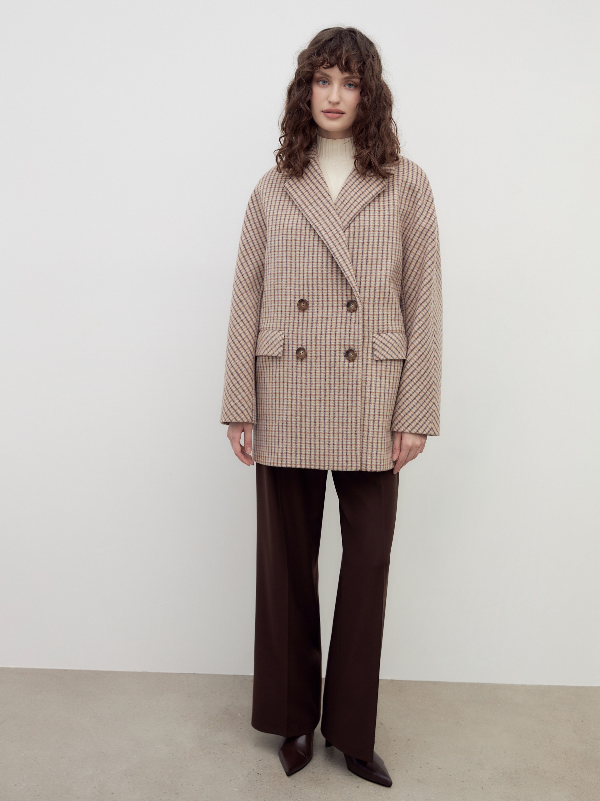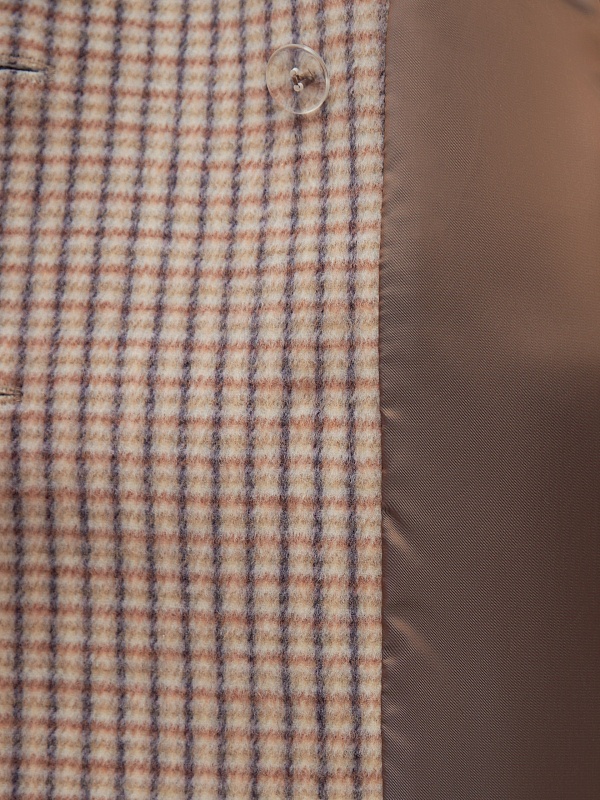 Двубортное полупальто прямого силуэта из шерстяной ворсовой ткани в яркой осенней бежево-персиковой клетке. Английский воротник с узким лацканом и свободный цельнокроенный рукав "кимоно" делают пальто стильным и удобным. По бокам располагаются карманы с клапанами. Застежка на два ряда крупных пуговиц. Спинка имеет дополнительное утепление. А для наилучшей защиты от ветра и непогоды пальто выполнено с использованием высокотехнологичной мембраны RaftPro. Произведено в Санкт-Петербурге.