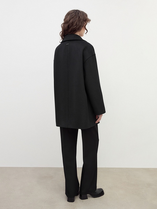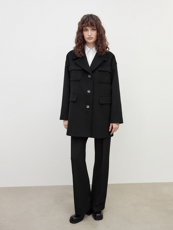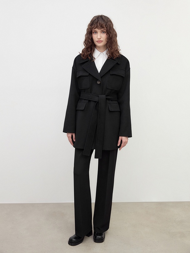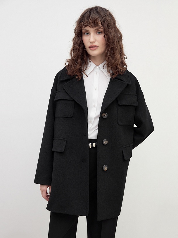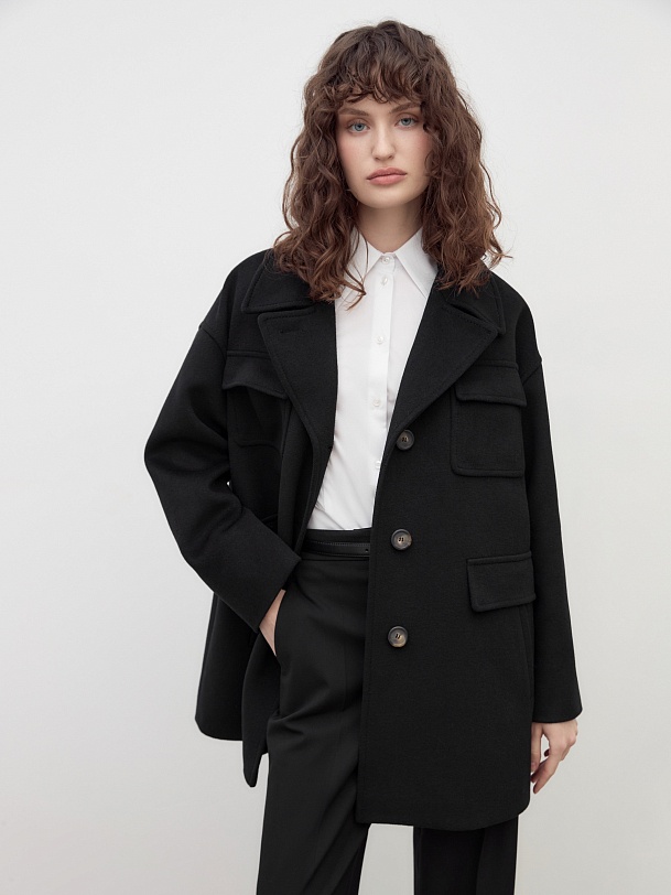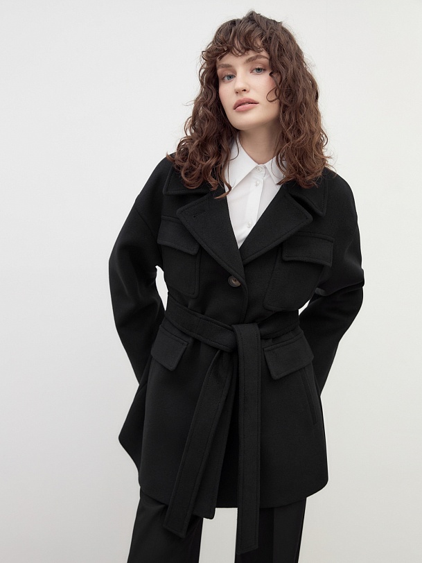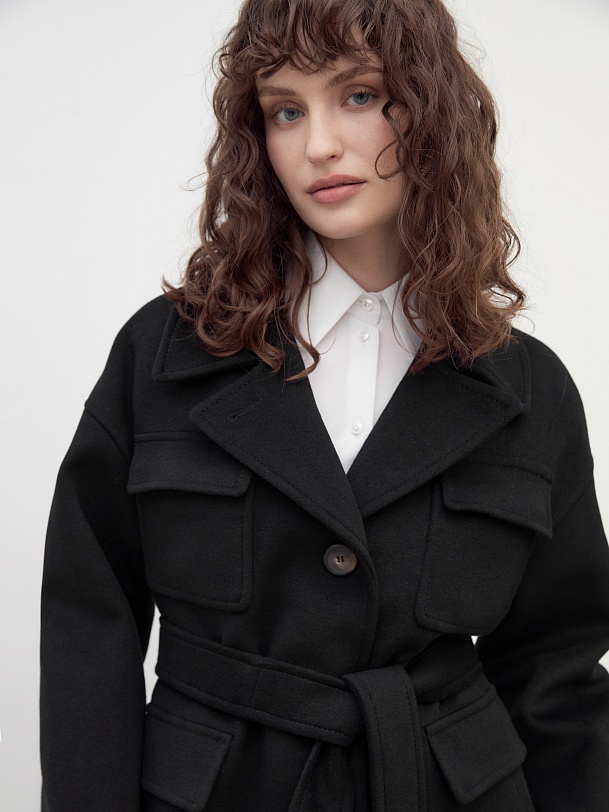 Однобортное полупальто прямого силуэта в классическом черном цвете. Полупальто сшито из премиальной ворсовой ткани с высоким содержанием шерсти. Пальто имеет английский воротник с маленьким узким лацканом, спокойный рубашечный рукав и две пары карманов с клапанами, которые делают его невероятно стильным. Низ рукава отворачивающимися манжетами по низу. Пальто декорировано отделочной строчкой. Застежка на ряд крупных пуговиц. Образ дополняет пояс из основной ткани. А для наилучшей защиты от непогоды полупальто выполнено с использованием высокотехнологичной мембраны RaftPro. Произведено в Санкт-Петербурге.