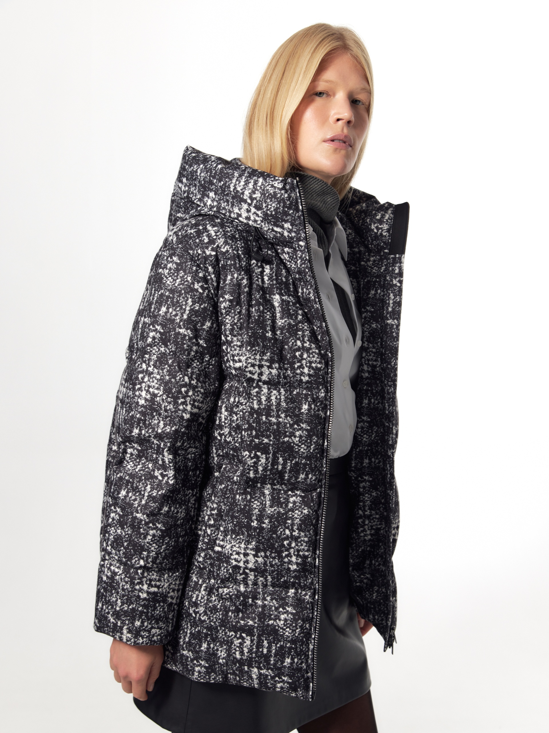 Зимняя куртка в модном черно-белом принте. Куртка сшита из высококачественной плащевой ткани с водоотталкивающим и мембранным покрытием с натуральным утеплителем пух/перо. Куртка имеет высокий воротник-стойку, переходящий в глубокий капюшон. Рубашечный рукав не стесняет движений, низ рукава с теплой трикотажной манжетой. По бокам располагаются карманы с листочками, мешковина кармана сделана из мягкого бархата. Застегивается изделие на молнию. Внутри куртки располагается кармашек на молнии. В комплект к куртке предлагается пояс из основной ткани.