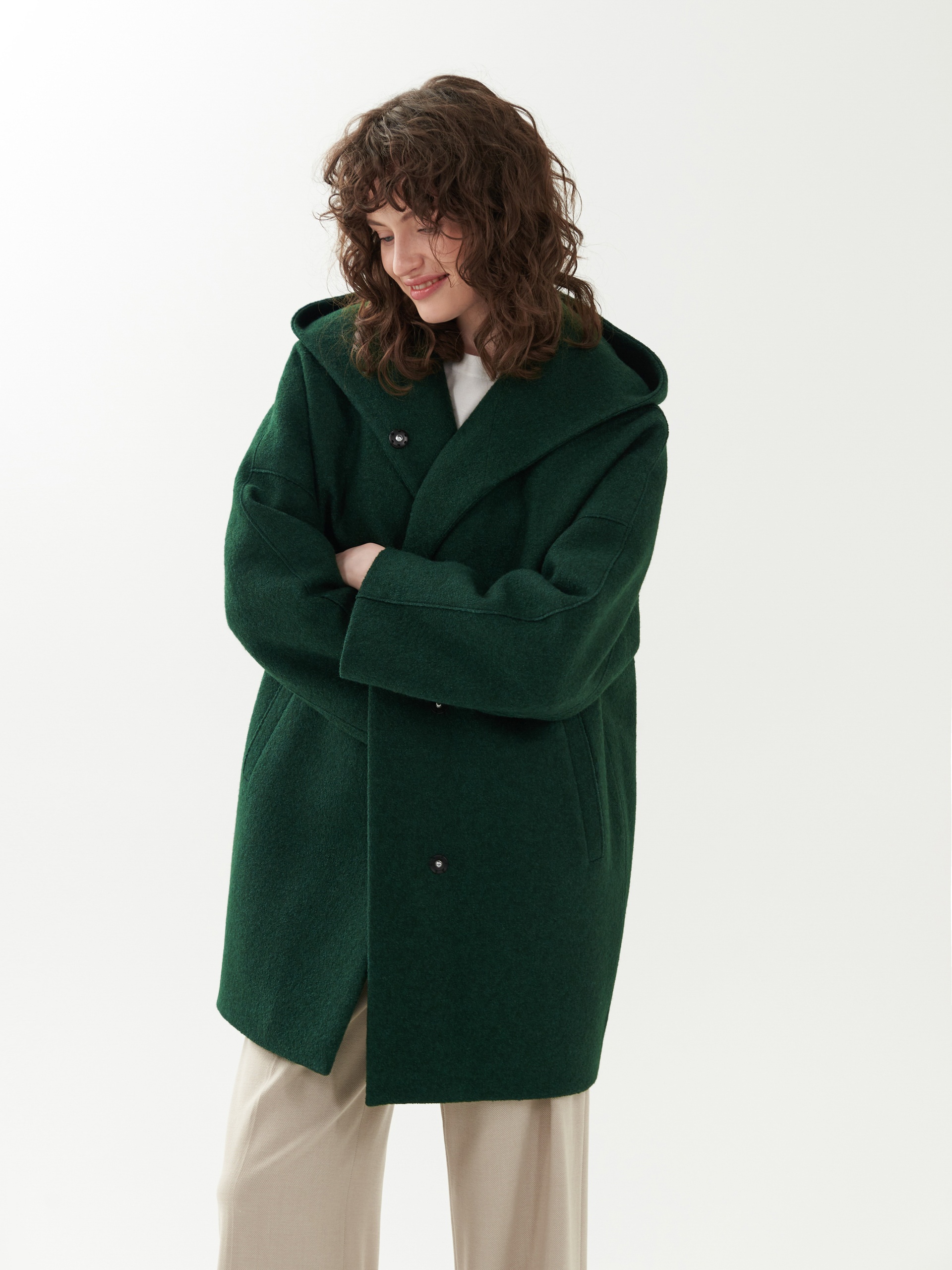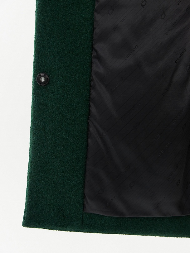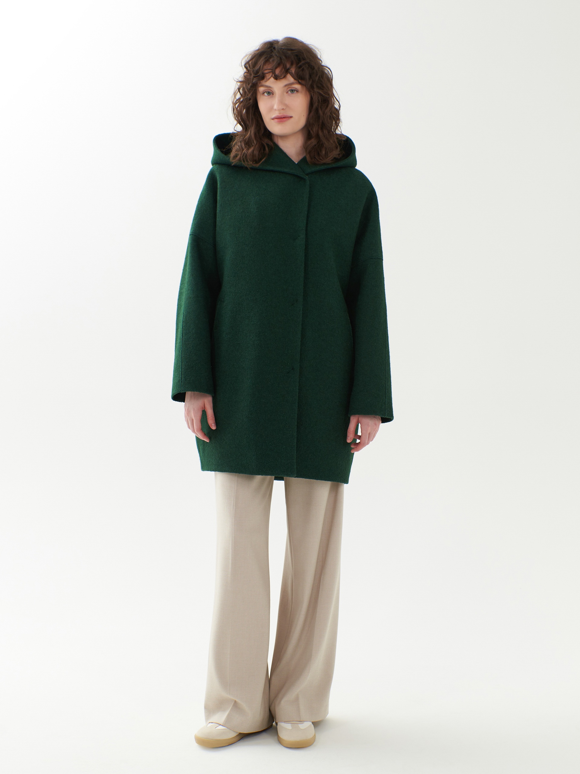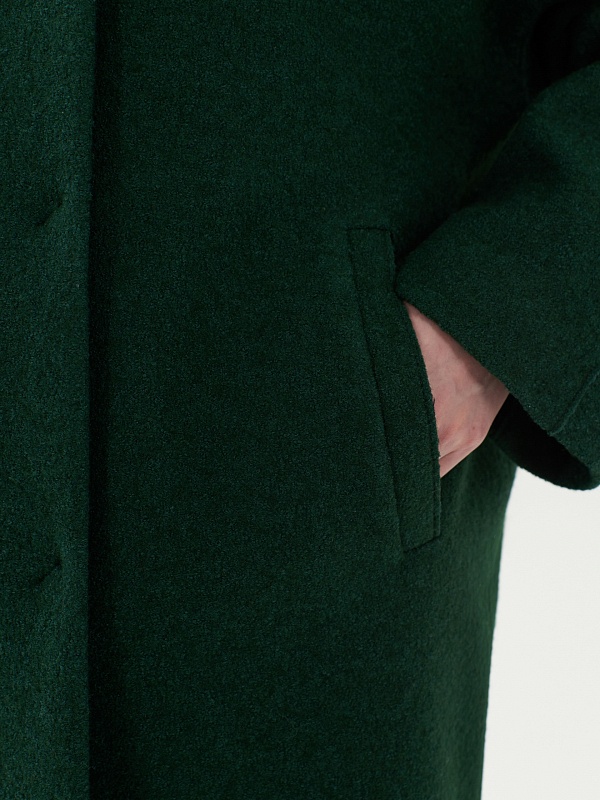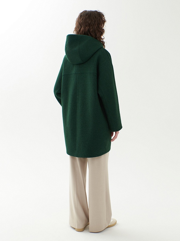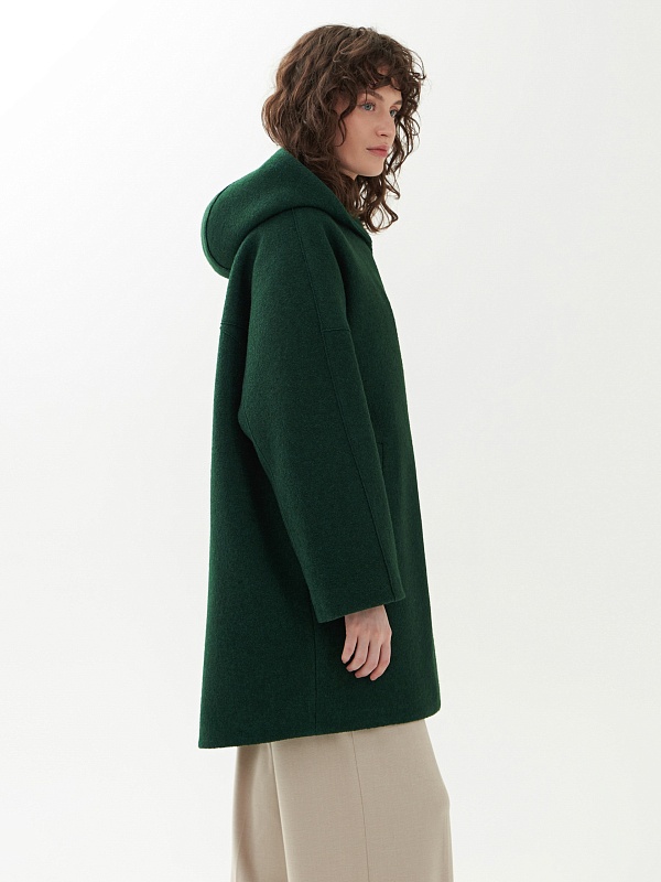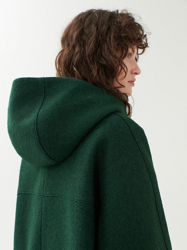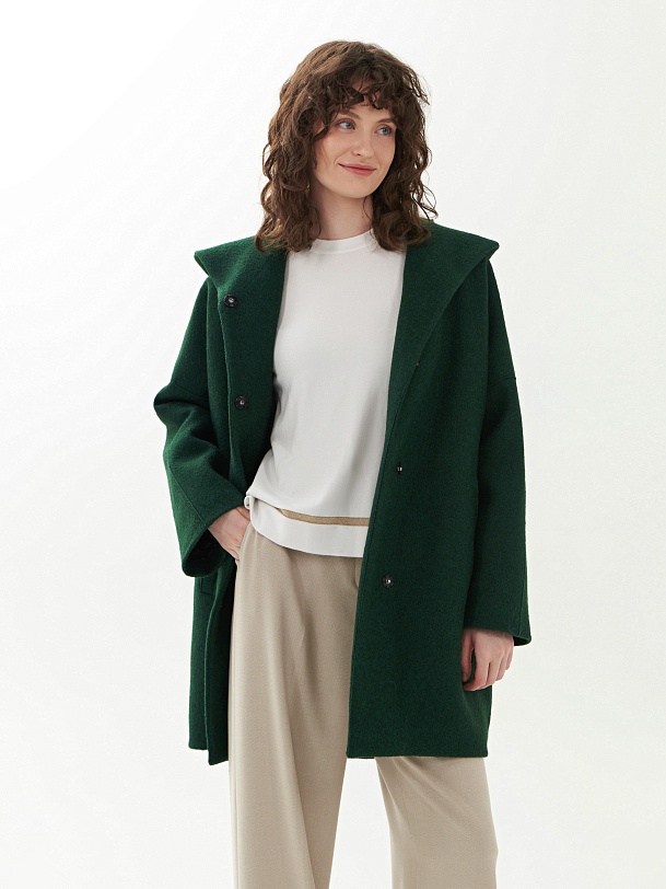 Однобортное полностью утепленное зимнее пальто силуэта "кокон" из шерстяной ткани с эффектом "вареная шерсть" в ярком темно-зеленом цвете. Пальто имеет минимум декоративных деталей и новую уникальную конструкцию. Горловина обрамлена широким отложным воротником, переходящим в глубокий теплый капюшон. Широкий рукав со спущенным плечом не стесняет движений. По бокам пальто располагаются карманы с листочками с теплым флисом внутри. Изделие комфортной длины выше колена с удлиненной спинкой и застежкой на ряд надежных пришивных кнопок. Изюминкой пальто являются открытые швы, которые в ткани "вареная шерсть" выглядят особенно эффектно. А для наилучшей защиты от непогоды пальто полностью выполнено на современном легком утеплителе и с использованием высокотехнологичной мембраны RaftPro. Произведено в Санкт-Петербурге.