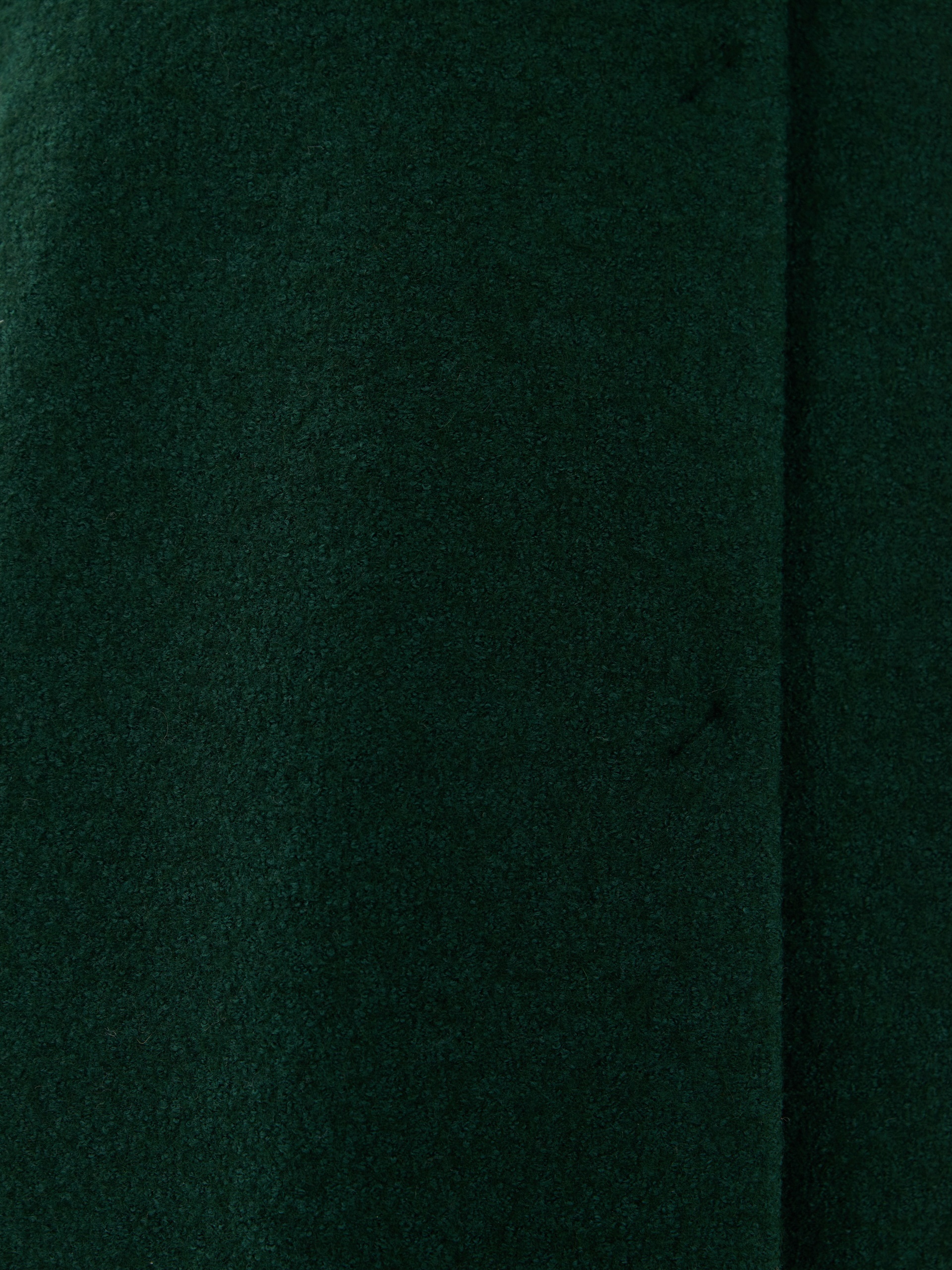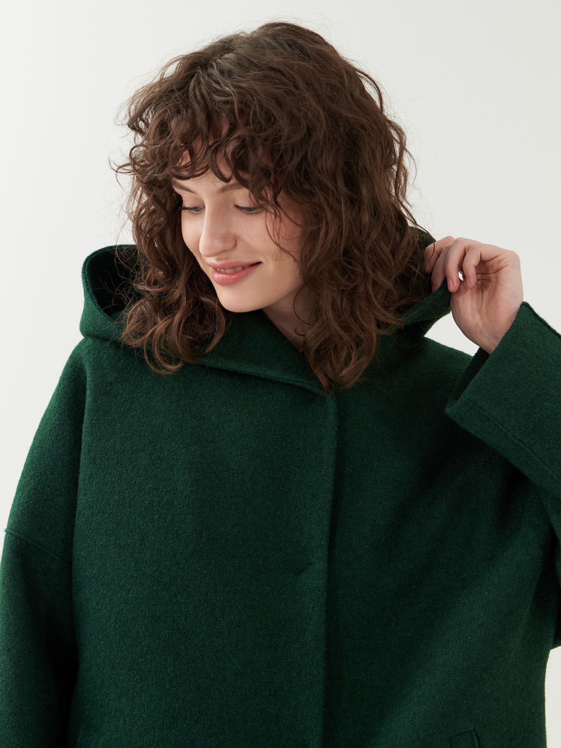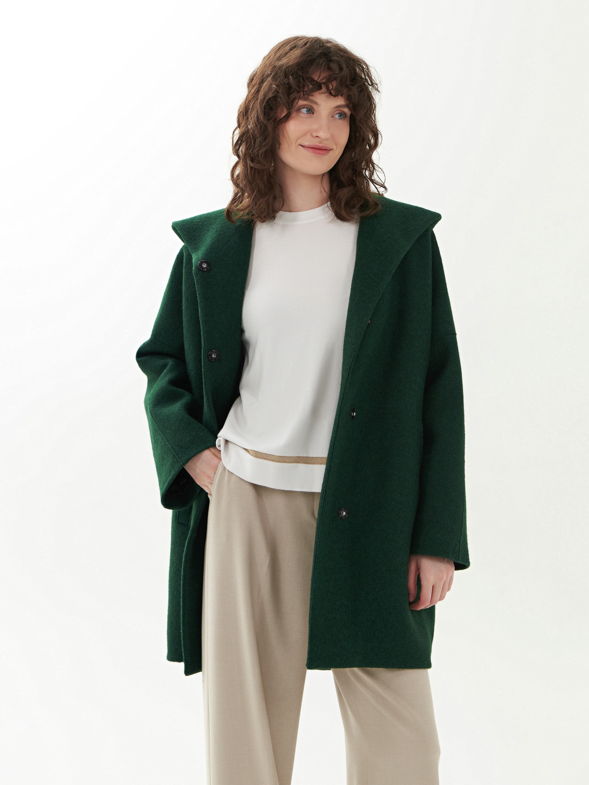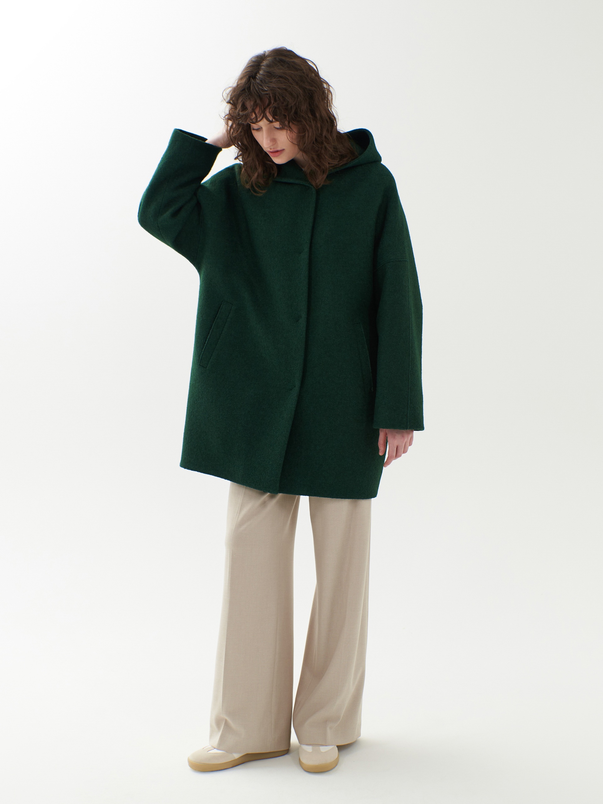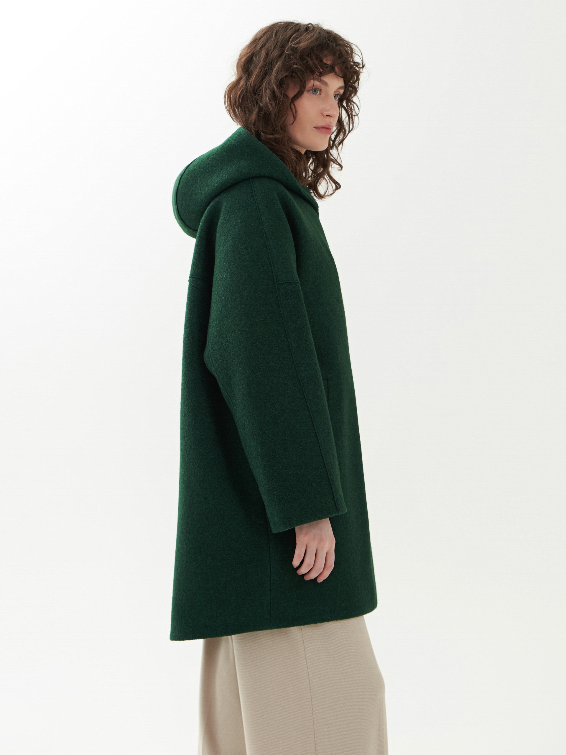 Однобортное полностью утепленное зимнее пальто силуэта "кокон" из шерстяной ткани с эффектом "вареная шерсть" в ярком темно-зеленом цвете. Пальто имеет минимум декоративных деталей и новую уникальную конструкцию. Горловина обрамлена широким отложным воротником, переходящим в глубокий теплый капюшон. Широкий рукав со спущенным плечом не стесняет движений. По бокам пальто располагаются карманы с листочками с теплым флисом внутри. Изделие комфортной длины выше колена с удлиненной спинкой и застежкой на ряд надежных пришивных кнопок. Изюминкой пальто являются открытые швы, которые в ткани "вареная шерсть" выглядят особенно эффектно. А для наилучшей защиты от непогоды пальто полностью выполнено на современном легком утеплителе и с использованием высокотехнологичной мембраны RaftPro. Произведено в Санкт-Петербурге.