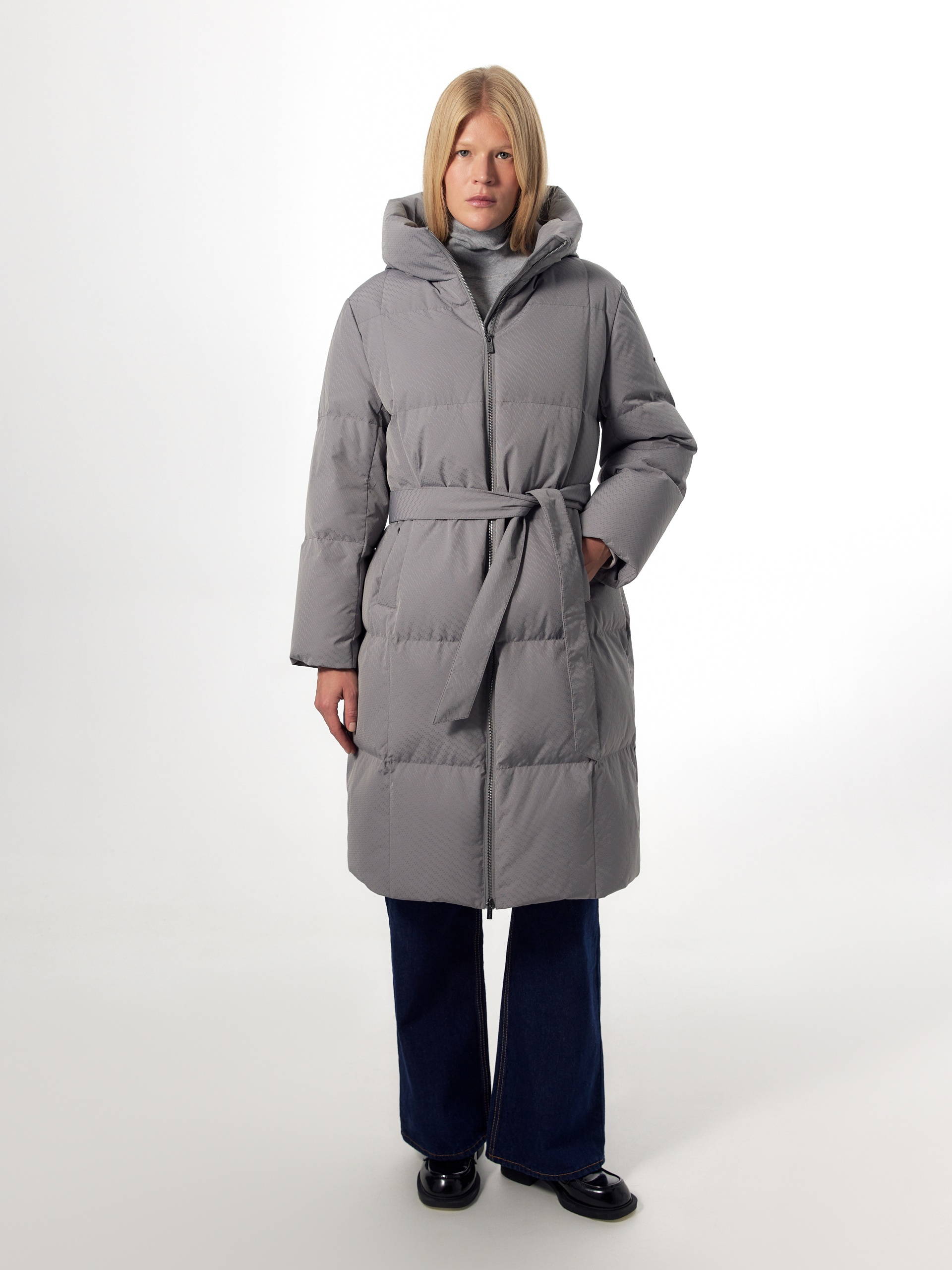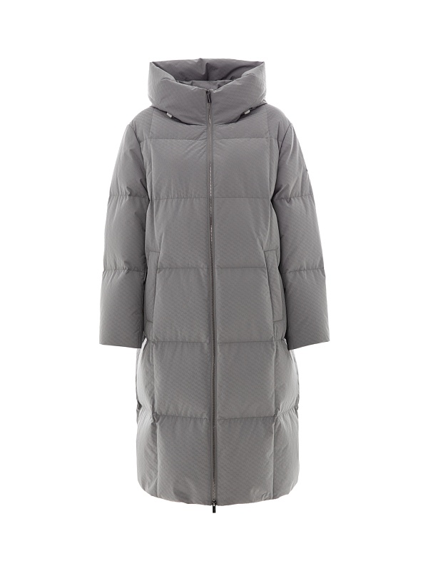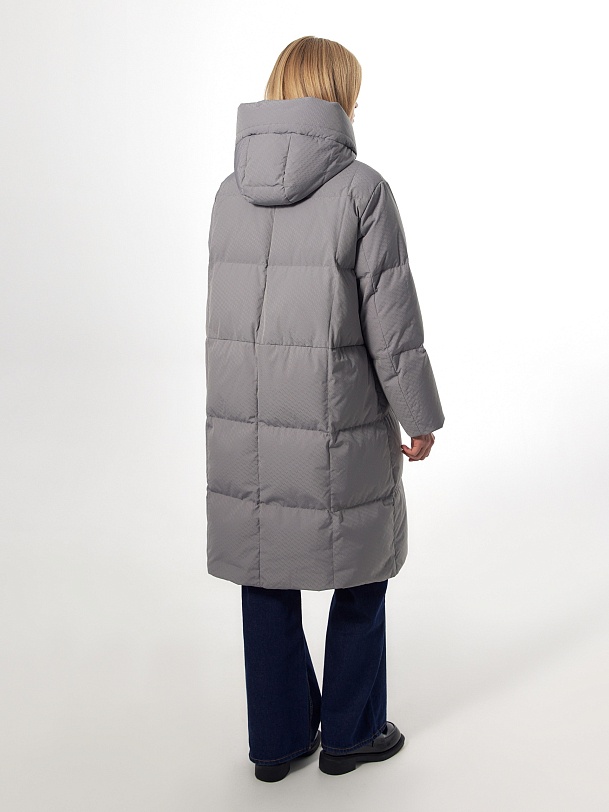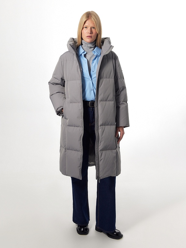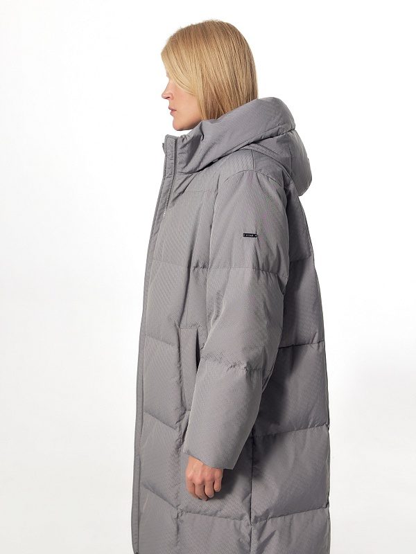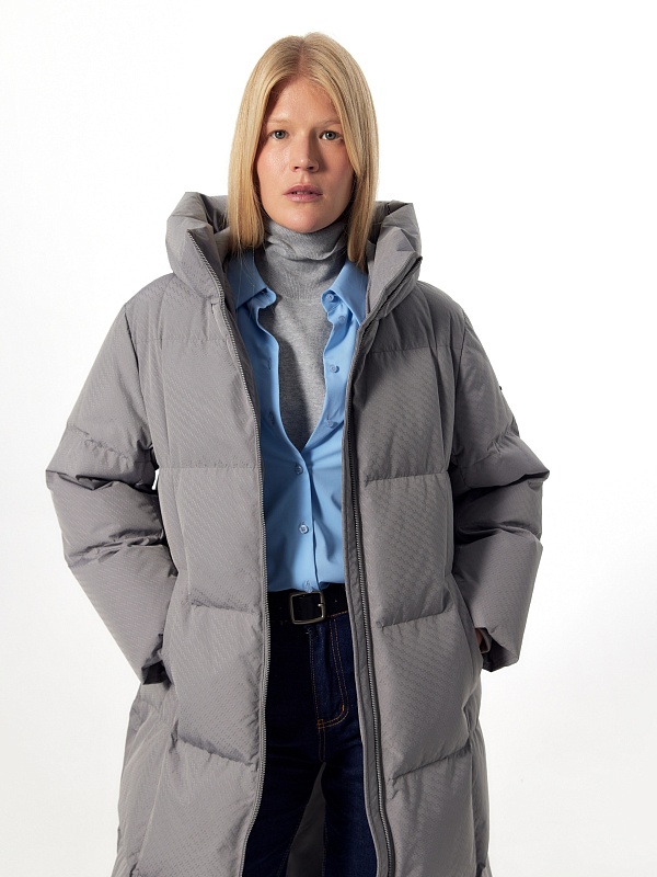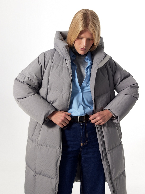 Длинное зимнее пальто в универсальном сером цвете с ненавязчивым фактурным узором на ткани. Пальто выполнено из высококачественной плащевой ткани с водоотталкивающим и мембранным покрытием на натуральном утеплителе пух/перо. Пальто имеет высокий воротник-стойку, переходящий в капюшон, и свободный рубашечный рукав. Низ рукава с теплой трикотажной манжетой. По бокам расположены карманы с листочками с застежкой на кнопку, мешковина карманов сделана из мягкого бархата. Застежка пальто на молнию. Внутри изделия имеется кармашек на молнии для мелочей и два больших кармана на подкладке. В комплект к пальто предлагается пояс из основной ткани.