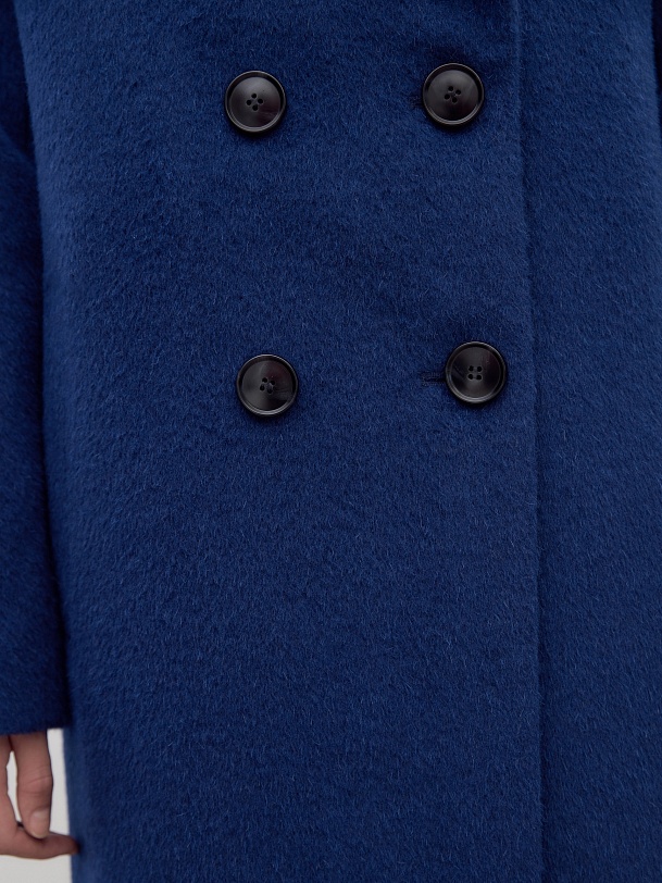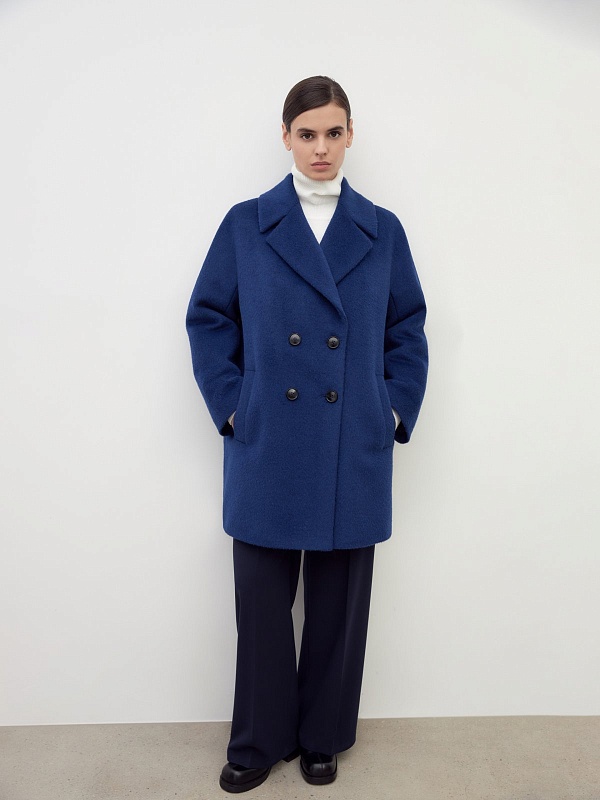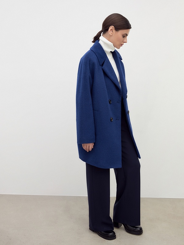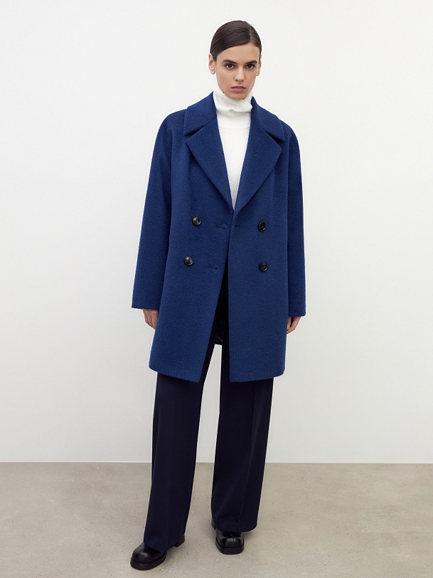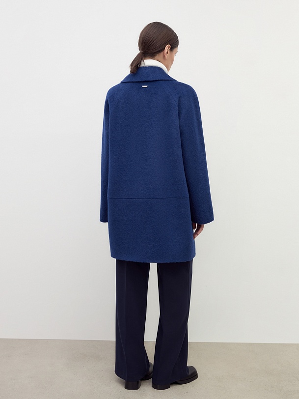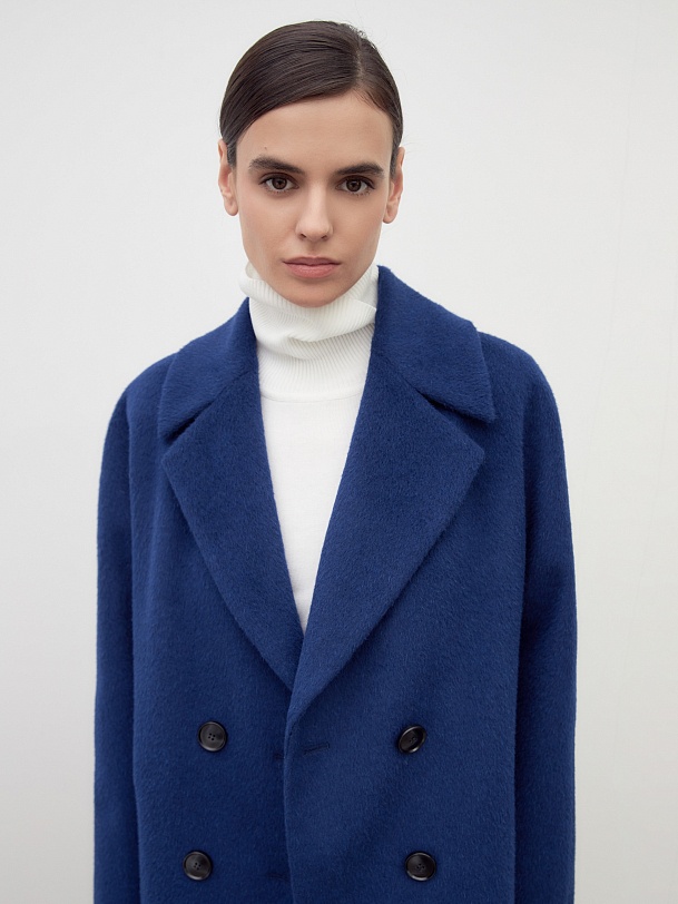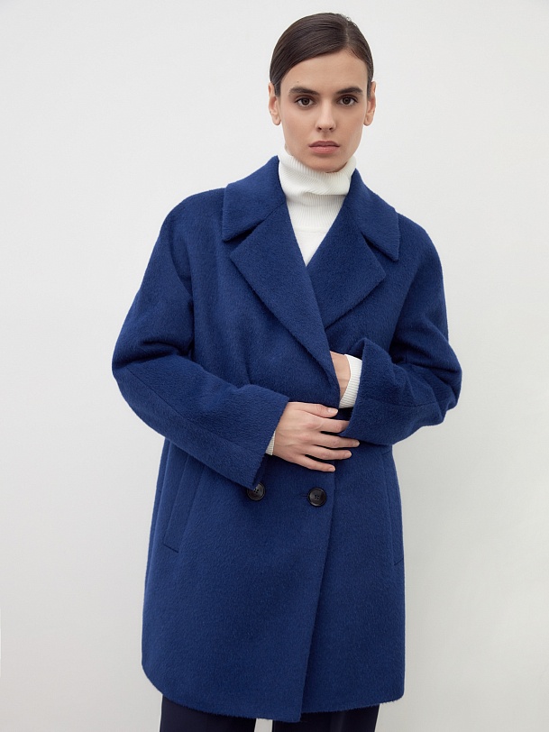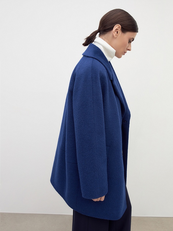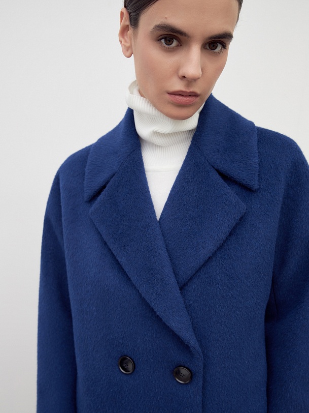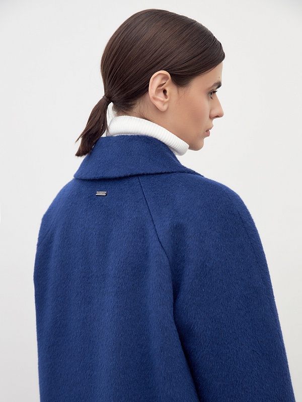 Двубортное укороченное минималистичное пальто силуэта "кокон" в ярком синем цвете. Полупальто сшито из премиальной длинноворсовой ткани, состоящей из нежной шерсти альпаки. Полупальто имеет классический английский воротник и комбинированный свободный рукав. По бокам располагаются вместительные карманы с листочками с теплым флисом внутри. Уникальный силуэт создается за счет шва на спинке. Застежка на два ряда стильных матовых пуговиц. А для наилучшей защиты от непогоды пальто полностью выполнено на современном легком утеплителе и с использованием высокотехнологичной мембраны RaftPro. Произведено в Санкт-Петербурге.
