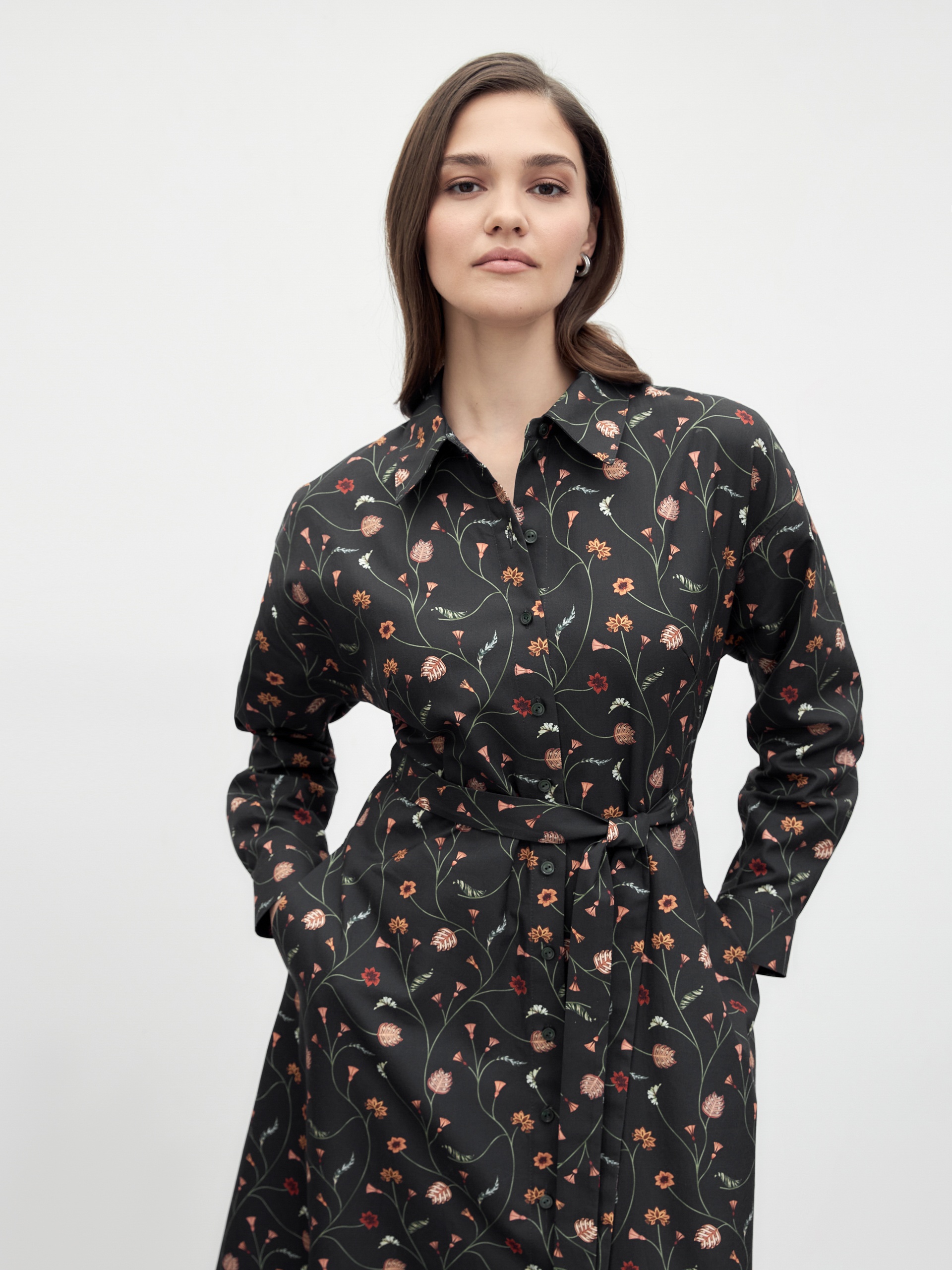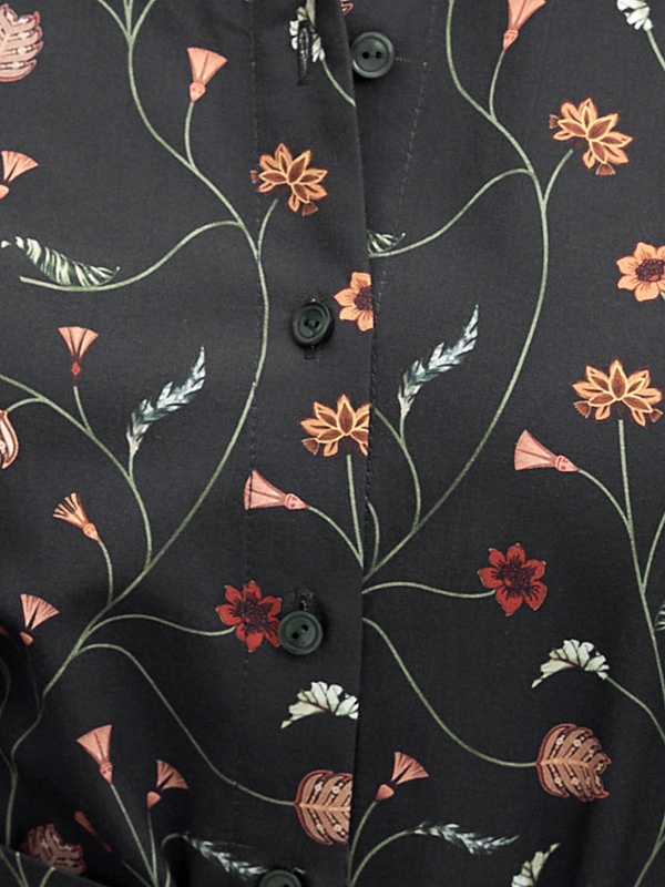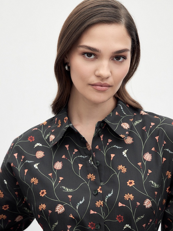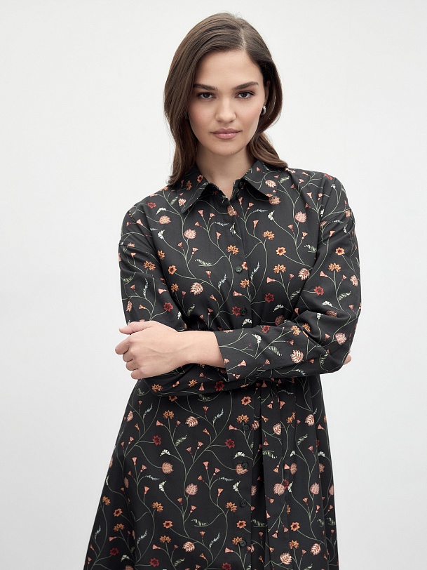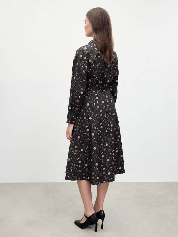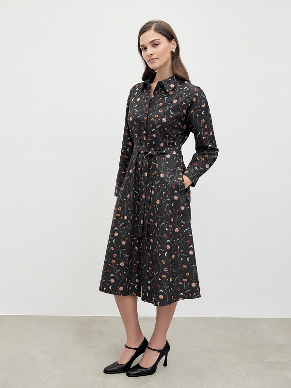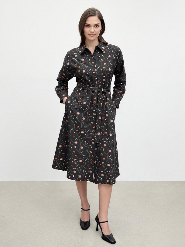 Классическое приталенное платье из принтованной хлопковой ткани на пуговицах. Линия плеча спущена для создания более мягкого образа и добавления объема. Рукав на манжете. По спинке идет кокетка. Юбка - колокол. В комплекте идет пояс из основной ткани.
